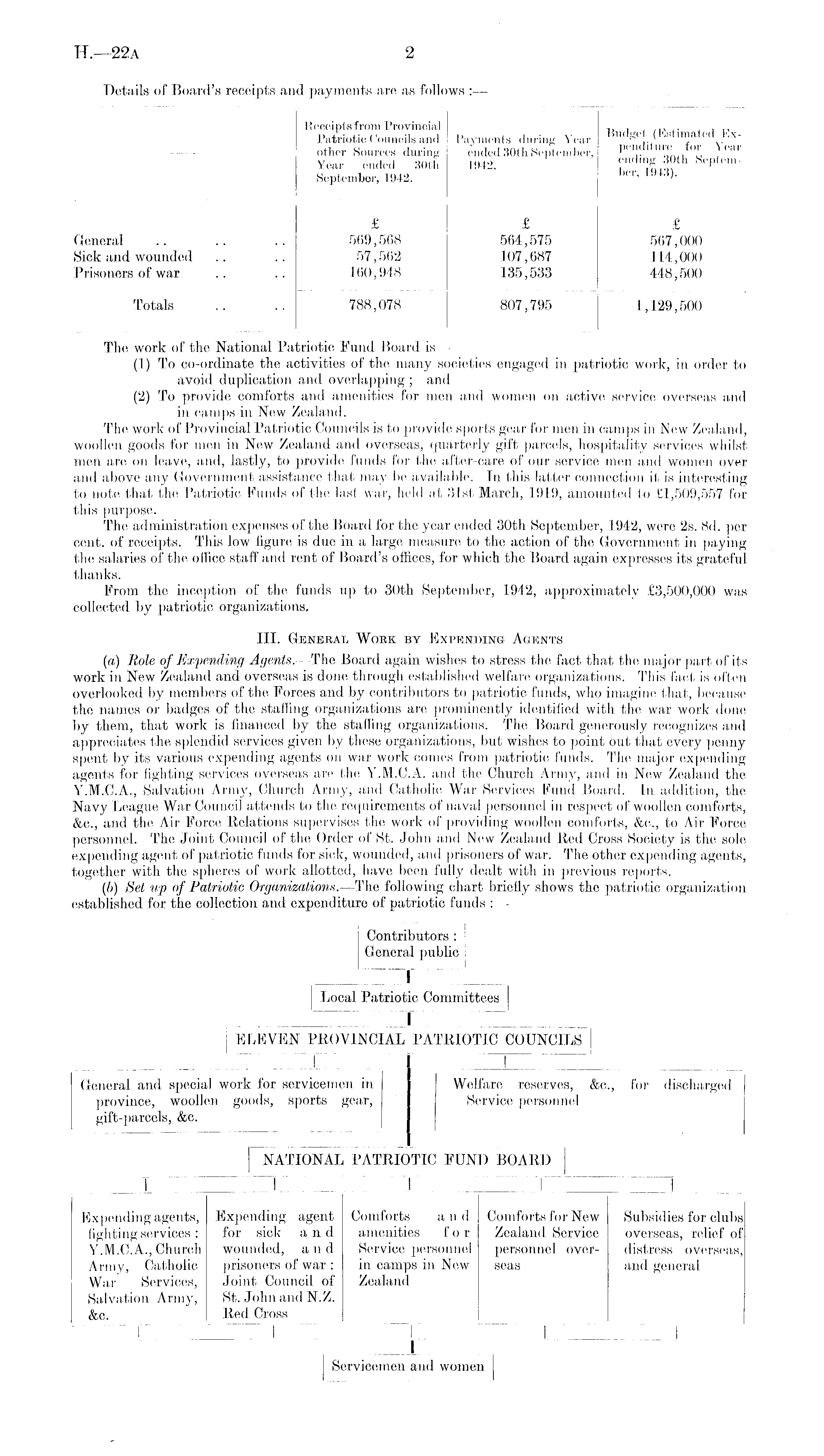 The work of the National Patriotic Fund Board is— (1) To co-ordinate the activities of the many societies engaged in patriotic work, in order to avoid duplication and overlapping ; and (2) To provide comforts and amenities for men and women on active service overseas and in camps in New Zealand. The work of Provincial Patriotic Councils is to provide sports gear for men in camps in New Zealand, woollen goods for men in New Zealand and overseas, quarterly gift parcels, hospitality services whilst men are on leave, and, lastly, to provide funds for the after-care of our service men and women over and above any Government assistance that may be available. In this latter connection it is interesting to note that the Patriotic Funds of the last war, held at 31st March, 1919, amounted to £1,509,557 for this purpose. The administration expenses of the Board for the year ended 30th September, 1942, were 2s. Bd. per cent, of receipts. This low figure is due in a large measure to the action of the Government in paying the salaries of the office staff and rent of Board's offices, for which the Board again expresses its grateful thanks. From the inception of the funds up to 30th September, 1942, approximately £3,500,000 was collected by patriotic organizations. 111. General Work by Expending Agents (a) Role of Expending Agents.—The Board again wishes to stress the fact that the major part of its work in New Zealand and overseas is done through established welfare organizations. This fact is often overlooked by members of the Forces and by contributors to patriotic funds, who imagine that, because the names or badges of the staffing organizations are prominently identified with the war work done by them, that work is financed by the staffing organizations. The Board generously recognizes and appreciates the splendid services given by these organizations, but wishes to point out that every penny spent by its various expending agents on war work comes from patriotic funds. The major expending agents for fighting services overseas are the Y.M.C.A. and the Church Army, and in New Zealand the Y.M.C.A., Salvation Army, Church Army, and Catholic War Services Fund Board. In addition, the Navy League War Council attends to the requirements of naval personnel in respect of woollen comforts, &c., and the Air Force Relations supervises the work of providing woollen comforts, &c., to Air Force personnel. The Joint Council of the Order of St. John and New Zealand Bed Cross Society is the sole expending agent of patriotic funds for sick, wounded, and prisoners of war. The other expending agents, together with the spheres of work allotted, have been fully dealt with in previous reports. (Ib) Set up of Patriotic Organizations.—The following chart briefly shows the patriotic organization established for the collection and expenditure of patriotic funds :—