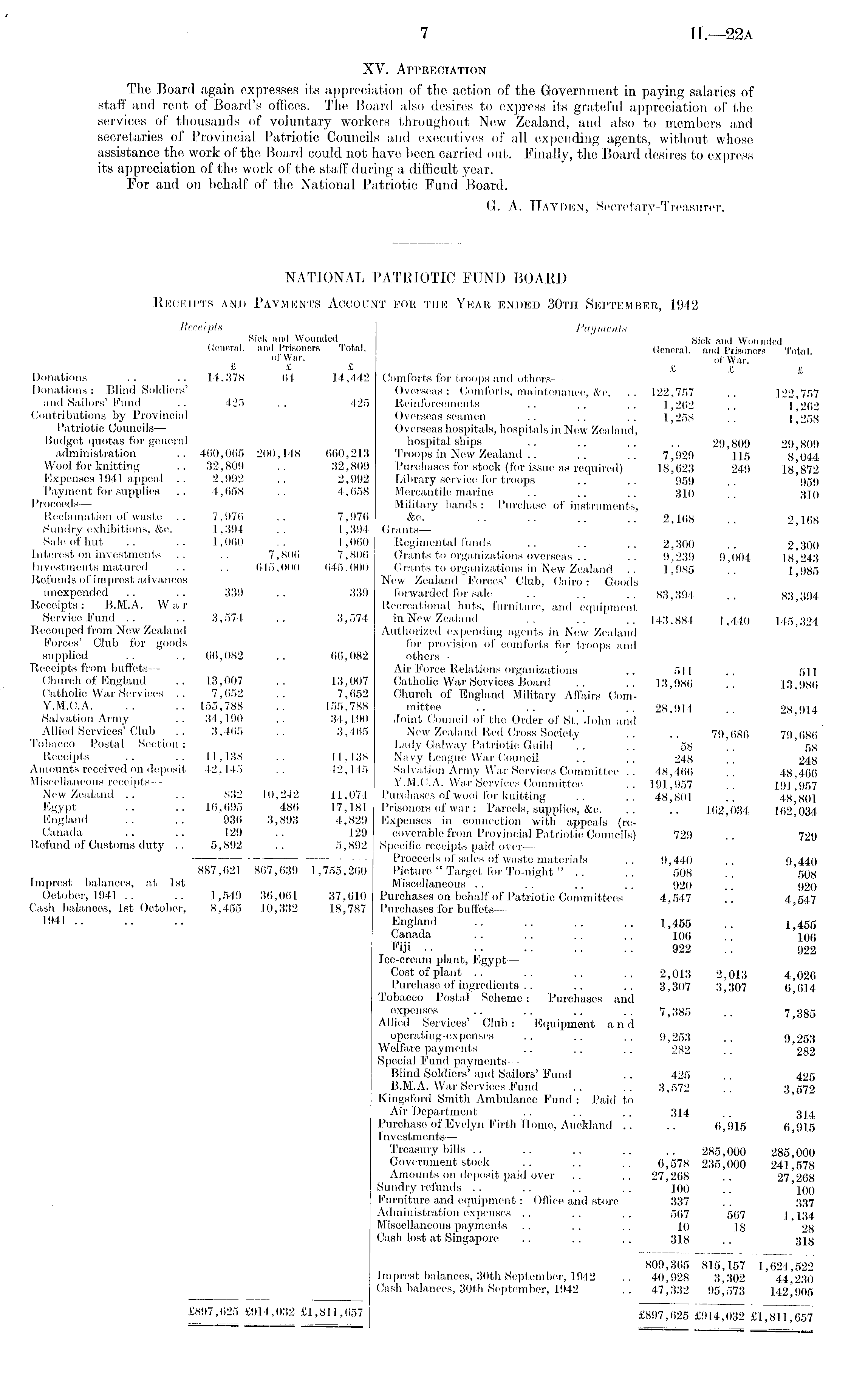 XV. Appreciation The Board again expresses its appreciation of the action of the Government in paying salaries of staff and rent of Board's offices. The Board also desires to express its grateful appreciation of the services of thousands of voluntary workers throughout New Zealand, and also to members and secretaries of Provincial Patriotic Councils and executives of all expending agents, without whose assistance the work of the Board could not have been carried out. Finally, the Board desires to express its appreciation of the work of the staff during a difficult year. For and on behalf of the National Patriotic Fund Board. G. A. Hayden, Secretary-Treasurer.