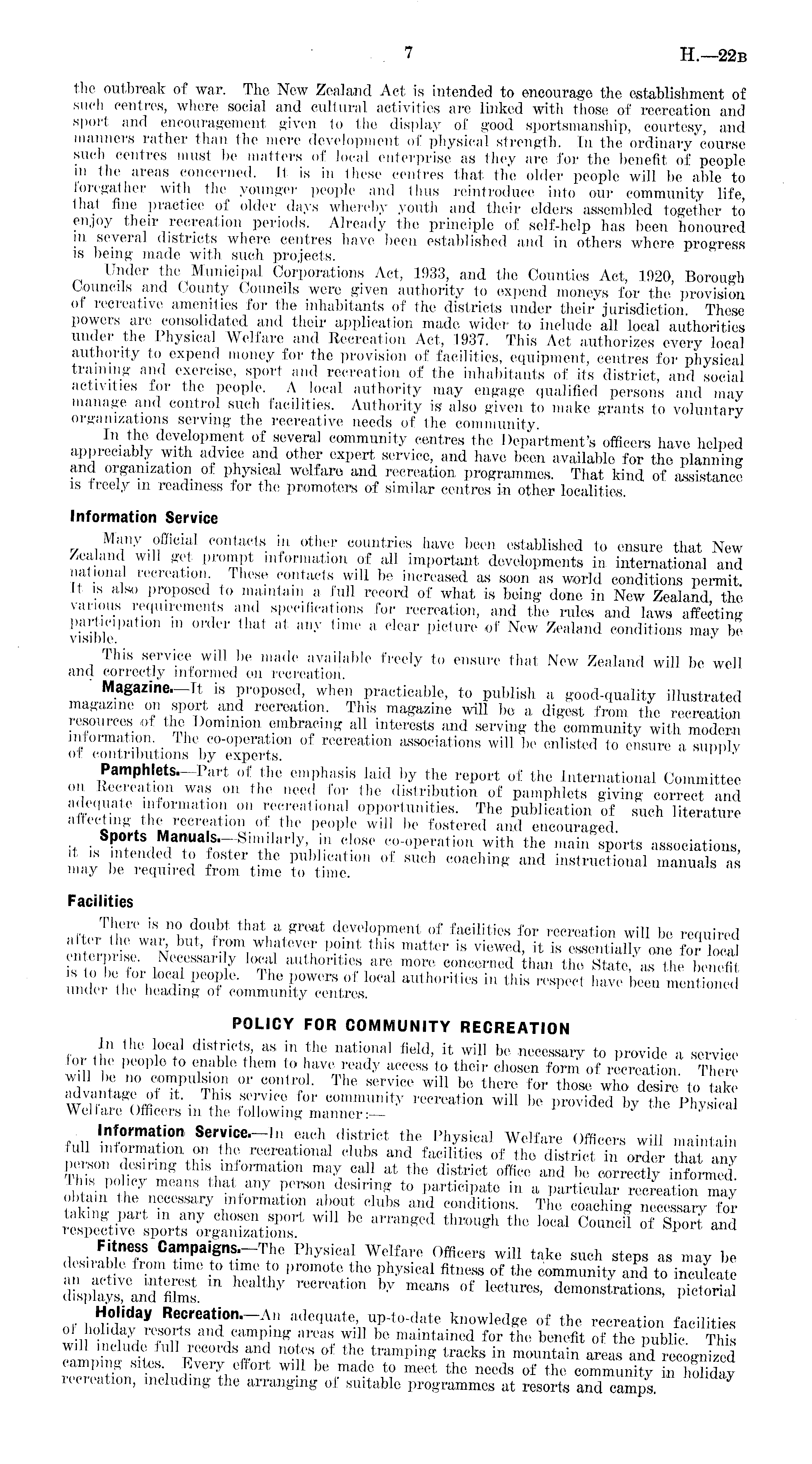 the outbreak of war. The New Zealand Act is intended to encourage the establishment of such centres, where social and cultural activities are linked with those of recreation and sport and encouragement given to the display of good sportsmanship, courtesy, and manners rather than the mere development of physical strength. In the ordinary course such centres must be matters of local enterprise as they are for the benefit of people in the areas concerned. It is in these centres that the older people will be able to loregather with the younger people and thus reintroduce into our community life, that fine practice of older days whereby youth and their ciders assembled together to enjoy their recreation periods. Already the principle of self-help has been honoured in several districts where centres have been established and in others where progress is being made with such projects. Under the Municipal Corporations Act, 1933, and the Counties Act, 1920, Borough Councils and County Councils were given authority to expend moneys for the provision of recreative amenities for the inhabitants of the districts under their jurisdiction. These powers are consolidated and their application made wider to include all local authorities under the Physical Welfare and Recreation Act, 1937. This Act authorizes every local authority to expend money for the provision of facilities, equipment, centres for physical training and exercise, sport and recreation of the inhabitants of its district, and social activities for the people. A local authority may engage qualified persons and may manage and control such facilities. Authority is' also given to make grants to voluntary organizations serving* the recreative needs of the community. In the development of several community centres the Department's officers have helped appreciably with advice and other expert service, and have been available for the planning and organization of physical welfare and recreation programmes. That kind of assistance is freely m readiness for the promoters of similar centres in other localities. Information Service Many official contacts in other countries have been established to ensure that New Zealand will get prompt information of all important developments in, international and national recreation These contacts will be increased as soon as world conditions permit It is also proposed to maintain a full record of what is being done in New Zealand the various requirements and specifications for recreation, and the rales and laws affecting participation m order that at any time a clear picture of New Zealand conditions may be visible. J This service will be made available freely to ensure that New Zealand will be well and correctly informed on recreation. Magazine. It is proposed,_ when practicable, to publish a good-quality illustrated magazine on sport and recreation. This magazine will be a digest from the recreation resources of the Dominion embracing all interests and serving the ■community with modern information. Ihe co-operation of recreation associations will be enlisted to ensure a supply of contributions by experts. 1 ' • Pamphlets. Part of the emphasis laid by the report of the International Committee on Recreation was on the need for the distribution of pamphlets giving correct and adequate information on recreational opportunities. The publication of such literature 1 (< 'i ing 4 « recreation of the people will he fostered and encouraged, it ,®.| Manua ' s, Y Si ™ ilarl y', 1 iu ( ;! ose co-operation with the main sports associations, Ll " tended f° ster tbe publication of such coaching and instructional manuals as may be required from time to time. Facilities J"rlS n ° < J ou „ bt that a great development of facilities for recreation will be required alter the war, but, from whatever point this matter is viewed, it is essentially one for local enterprise. Necessarily local authorities are more concerned than the State, as the benefit sto be for local people. Ihe powers of local authorities in this respect have been mentioned under the heading of community centres. POLICY FOR COMMUNITY RECREATION In the local districts as in the national field, it will be necessary to provide a service for the people to enable them to have ready access lo their chosen form of recreation There will be no compulsion or control. The service will be there for those who desire to take • i IS fi7 lC? community recreation will be provided by the Physical Wei Idle Officers m the following manner:— Information Service.—Ln each district the Physical Welfare Officers will maintain full information on the recreational clubs and facilities of the district in order that any Jm 1 t ®information may call at the district office and be correctly informed Ihiß policy means that any person desiring to participate in a particular recreation may obtain the necessary information about clubs and conditions. The coaching necessary for ™ u bs ommBed thmn<sk io «* 1 co »" a »' «'• Fitness Campaigns.-The Physical Welfare Officers will take such steps as may be desirable from time to time to promote the physical fitness of the community and to incite d films. * 7 by ~of lectures ' demonstrations, pietS of hSh"r at r~ All adequate > l uP-to-date knowledge of the recreation facilities ot holiday resorts and camping areas will be maintained for the benefit of the public. This (••in. " p ecords an< * notes of the tramping tracks in mountain areas and recognized camping sites Every effort wi Ibe made to meet the needs of the community in holiday recreation, including the arranging of suitable programmes at resorts and camps
