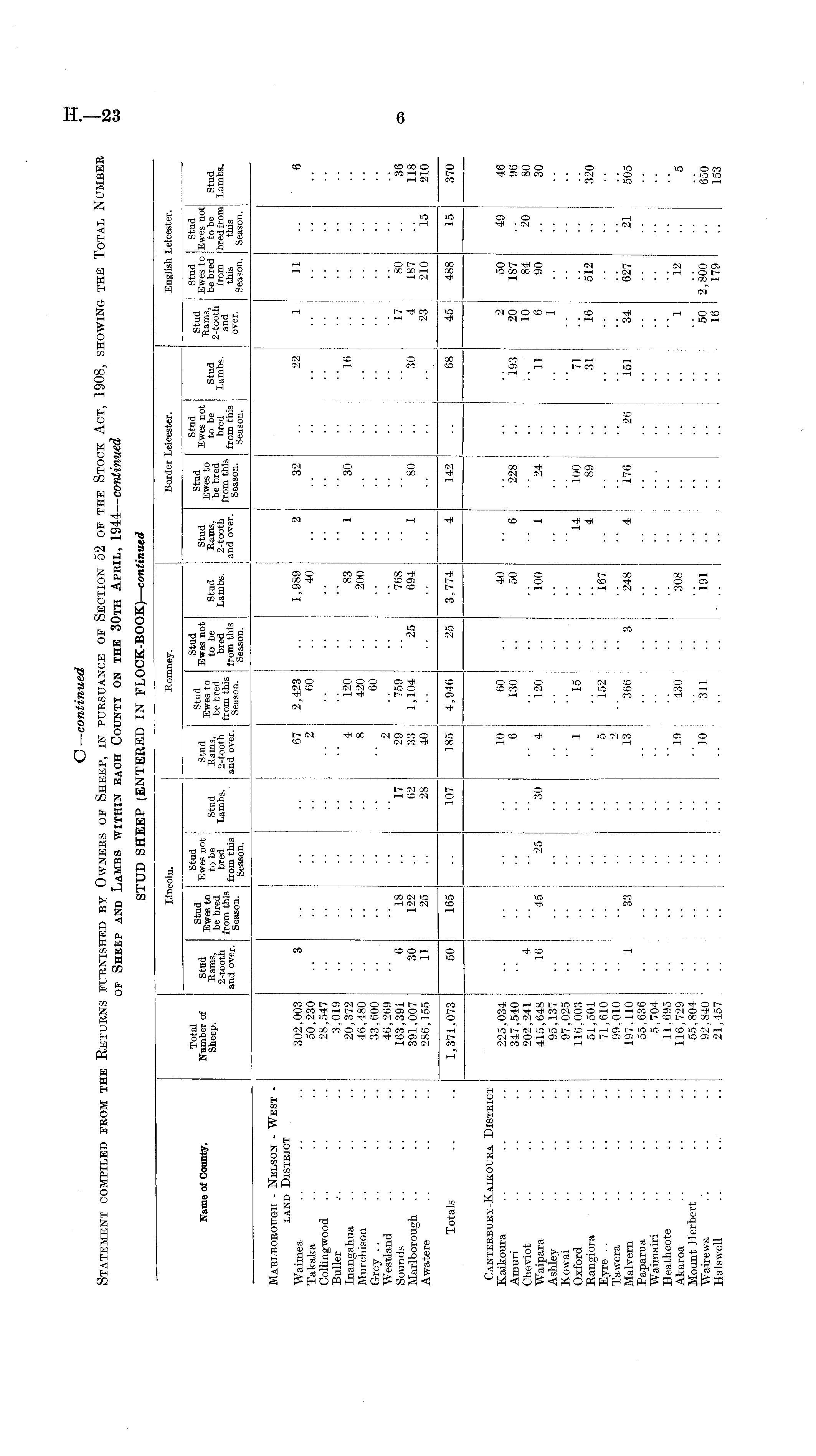 C— continued Statement compiled from the Returns furnished by Owners of Sheep, in pursuance of Section 52 of the Stock Act, 1908, showing the Total Number of Sheep and Lambs within each County on the 30th April, 1944— continued STUD SHEEP (ENTERED IN FLOCK-BOOK)— continued