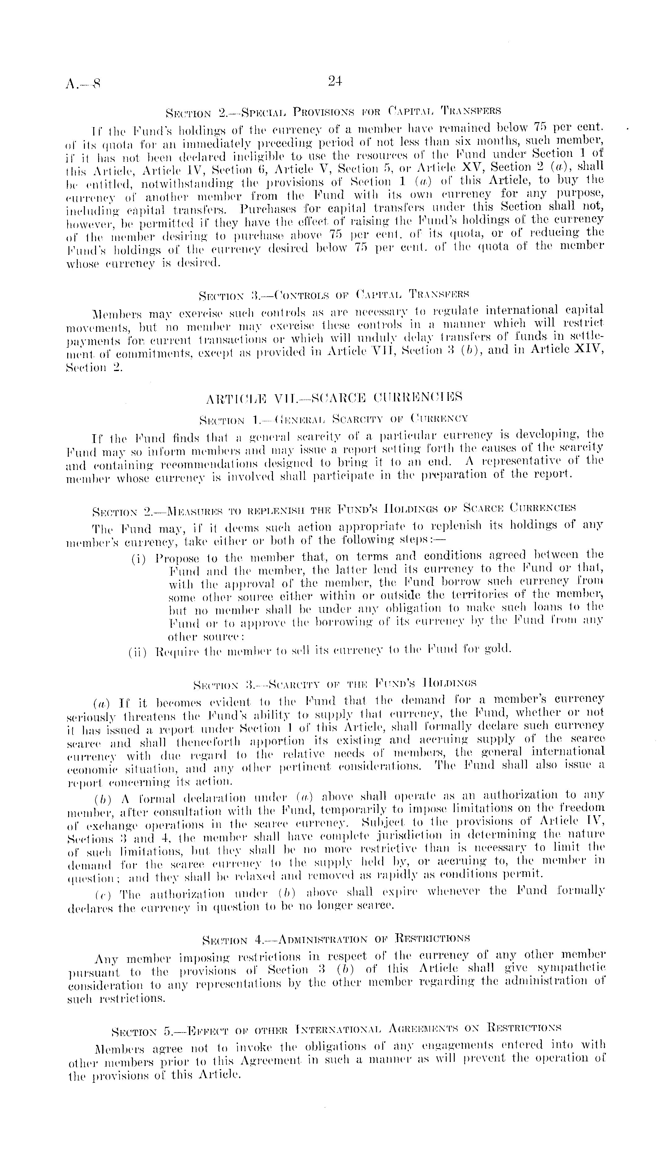 Section 2.—Special- Provisions for Capital Transfers If the Fund's holdings of the currency of a member have remained below 75 per cent, of its quota for an immediately preceding period of not less than six months, such member, if it has not been declared ineligible to use the resources of the Fund under Section. 1 of this Article, Article IV, Section 6, Article V, Section 5, or Article XV, Section 2 (»), shall be entitled, notwithstanding the provisions of Section 1 (a) of this Article, to buy the currency of another member from the Fund with its own currency for any purpose, including capital transfers. Purchases for capital transfers under this Section shall not, however, be permitted if they have the effect of raising the Fund's holdings of the currency of the member desiring to purchase above 75 per cent, of its quota, or of reducing the Fund's holdings of the currency desired below 75 per cent, of the quota, of the member whose currency is desired. Section 3. —Controls of Capital Transfers Members may exercise such controls as are necessary to regulate international capital movements, but no member may exercise these controls in a manner which will restrict payments for, current transactions or which will unduly delay transfers of funds m settlement of commitments, except as provided in Article VII, Section 3 (b), and in Article XIV, Section 2. ARTICLE VIT.—SCARCE CURRENCIES Section I.—General Scarcity of Currency If the Fund finds that a general scarcity of a particular currency is developing, the Fund may so inform members and may issue a report setting forth the causes of the scarcity and containing recommendations designed to bring it to an end. A representative of the member whose currency is involved shall participate in the preparation of the report. Section 2. Measures to replenish the Fund's Holdings of Scarce Currencies The Fund may, if it deems such action appropriate to replenish its holdings of any member's currency, take either or both of the following steps (i) Propose to the member that, on terms and conditions agreed between the Fund and the member, the latter lend its currency to the Fund or that, with the approval of the member, the Fund borrow such currency from some other source either within or outside the territories of the member, but no l member shall be under any obligation to make such loans to the Fund or to approve the borrowing of its currency by the Fund from any other source: (ii) Require the member to sell its currency to the Fund for gold. Section 3. —Scarcity of the Fund's Holdings (a) If it becomes evident to the Fund that the demand for a member's currency seriously threatens the Fund's ability to supply that currency, the Fund, whether oi not it has issued a report under Section 1 of this Article, shall formally declare such currency scarce and shall thenceforth apportion its existing and accruing supply of the scarce currency with due regard to the relative needs of members, the general international economic situation, and any other pertinent considerations. The Fund shall also issue a report concerning its action. (b) A formal declaration under (a) above shall operate as an authorization to any member, after consultation with the Fund, temporarily to impose limitations on the freedom of exchange operations in the scarce currency. Subject to the provisions of Article IV, Sections 3 and 4, the member shall have complete jurisdiction in determining the nature of such limitations, but they shall be no more restrictive than is necessary to limit the demand for the scarce currency to the supply held by, or accruing to, the member in question; and they shall be relaxed and removed as rapidly as conditions permit. (c) The authorization under (b) above shall expire whenever the Fund formally declares the currency in question to be no longer scarce. Section 4.—Administration of Restrictions Any member imposing restrictions in respect of the currency of any other member pursuant to the provisions of Section 3 (b) of this Article shall give sympathetic consideration to any representations by the other member regarding the administration of such restrictions. Section 5. Effect of other International Agreements on Restrictions Members agree not to invoke the obligations of Iny engagements entered into witli other members prior to this Agreement in such a manner as will prevent the operation of the provisions of this Article.