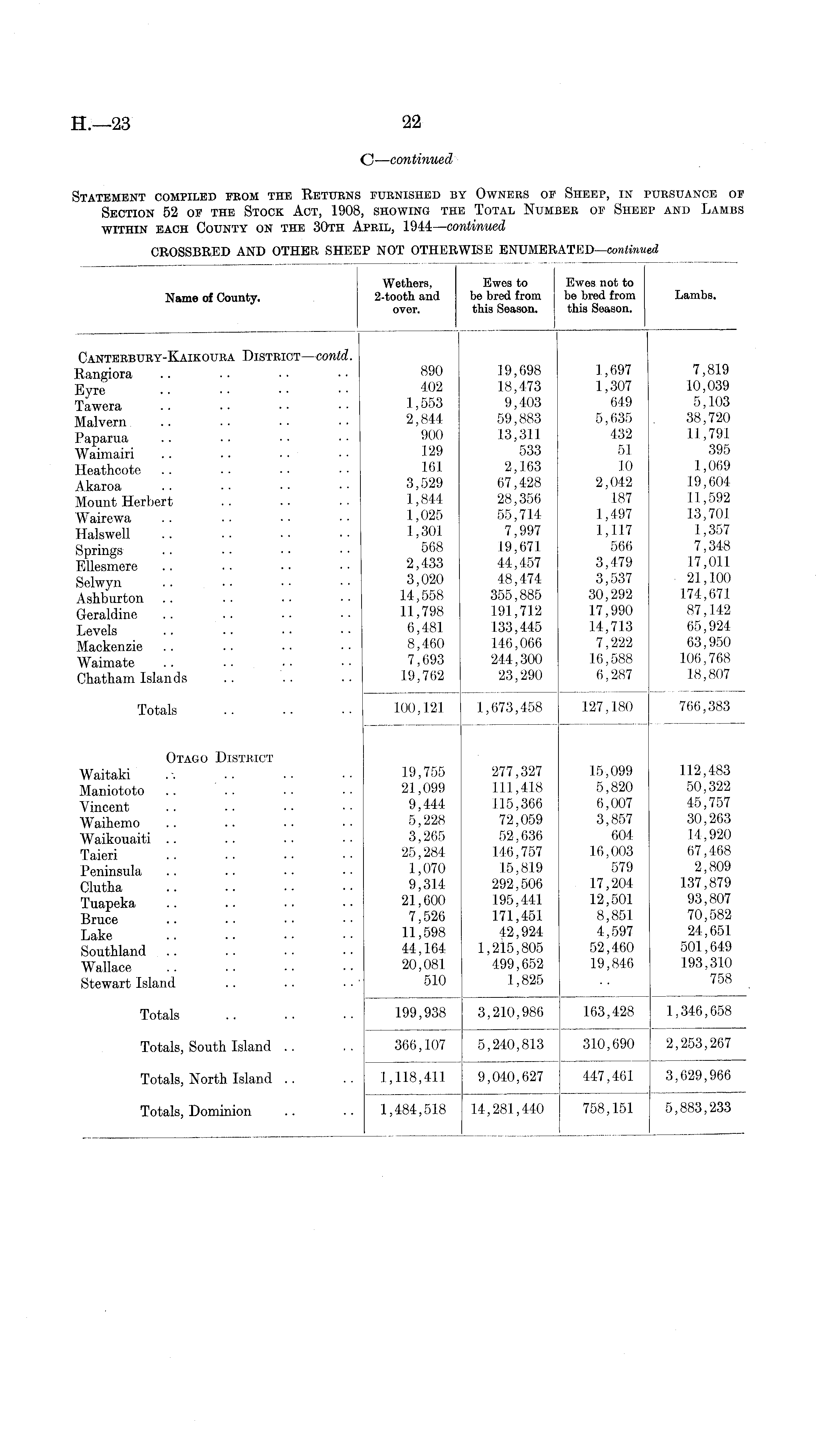 C—continued Statement compiled from the Returns furnished by Owners of Sheep, in pursuance of Section 52 of the Stock Act, 1908, showing the Total Number of Sheep and Lambs within each County on the 30th April, 1944—continued CROSSBRED AND OTHER SHEEP NOT OTHERWISE ENUMERATED —continued