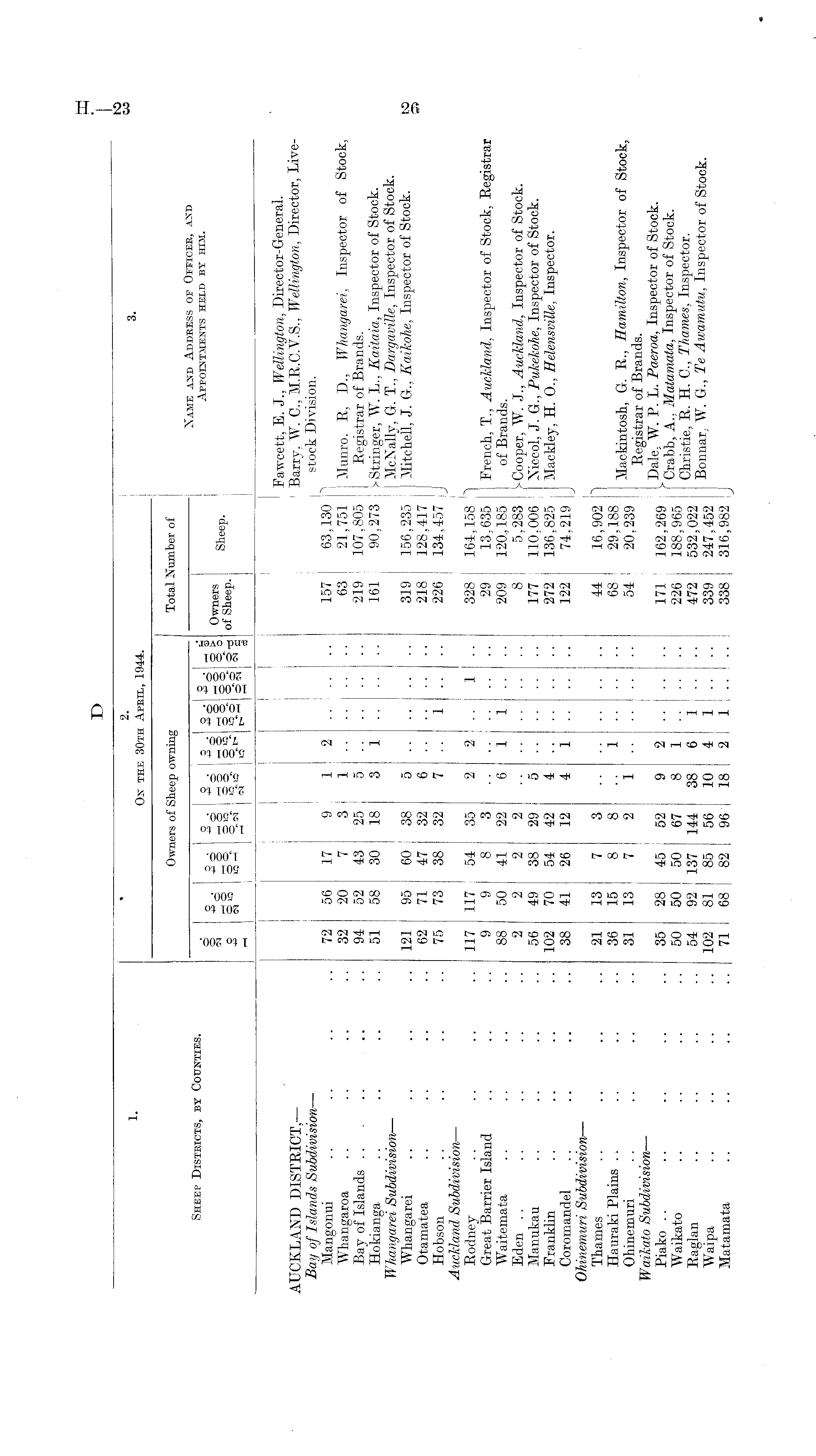1 ' 2 - 3. Ok the 30th Apkil, 1944. Owners of Sheep owning Total Number of „ _ „ ; : Name md Addbess oe Offices, jud Sheep Districts, by Cohkties. q q q q . o . g Appointments held by him. § 43 o g \Z 8 Zg, Owners ™ o Sg o c - 8°- §°- 8:5 §o'§§ o-a of Sheep. Shee P" +> cm o' — i I rjio i- »i;i 0S1 3 I - 1 N >o i> | S § ' Fawcett, E. J., Wellington, Director-General. AUCKLAND DISTRICT,— Barry, W. C., M.R.C.Y.S., Wellington, Director, LiveBay of Islands Subdivision — stock Division. Mangonui .. .. .. 72 56 17 9 1 2 157 63,130 ! ~) Whangaroa .. .. .. .. 32 20 7 3 1 63 21,751 Munro. R, D., Whangarei, Inspector of Stock, Bay of Islands .. .. 94 52 43 25 5 219 107,805 Registrar of Brands. Hokianga .. .. .. .. 51 58 30 18 3 1 161 90,273 W. L., Kaitaia, Inspector of Stock. Whangarei Subdivision — | McNally, G. T., Dargaville, Inspector of Stock. Whangarei .. .. .. .. 121 95 60 38 5 319 156,235 | Mitchell, J. <*., Kaikohe, Inspector of Stock. Otamatea .. .. .. 62 71 47 32 6 218 128,417 | Hobson .. .. .. 75 73 38 32 7 .. 1 .. .. 226 134,457 J Auckland Subdivision — Rodney .. .. .. .. 117 117 54 35 2 2 .. 1 .. 328 164,158 " Great Barrier Island .. .. .. 9 9 8 3 29 13,635 French, T., Auckland, Inspector of Stock, Registrar Waitemata .. .. .. 88 50 41 22 6 1 1.... 209 120., 185 of Brands. Eden .. .. .. .. .. 2 2 2 2 8 5,283 W. J., Auckland, Inspector of Stock. Manukau .. .. .. 56 49 38 29 5 177 110,006 Niccol, J. G., Puhekohe, Inspector of Stock. Franklin .. .. .. .. 102 70 54 42 4 272 136,825 Mackley. H. 0., Helensville, Inspector. Coromandel .. .. .. .. 38 41 26 12 4 1 122 74,219 Ohinemuri Subdivision — Thames .. .. .. 21 13 7 3 44 16,902 1 Hauraki Plains .. . . .. .. 36 15 8 8 . . 1 68 29,188 ,, , • , , n -r, tt -n t + e qa 1 Ohinemuri 31 13 7 2 1 54 20 239 Mackintosh, K Hamilton, Inspector of Stock, «t , o u- • • ' .Registrar 01 .brands. W aikato bubaivision — ° TTr -nr-n t ~ 4. .<? ax i -D- 1 QF\ oq a en q o 171 ico ocn Dale. W. P. L. Paeroa, Inspector ot btock. Piako .. .. .. .. 35 zo 45 52 9 2 171 162,269 >r. , \ . , T r , n 0 , , Waikato .. .. .. 50 50 50 67 8 1 226 188,965 i Crabb, A Inspector of Stock. Raglan .. .. .. 54 92 137 144 38 6 1 .. .. 472 532,022 | Christie R,. H. CThames Inspector Waipa .. .. .. .. 102 81 85 56 10 4 1 .. .. 339 247,452 B ° nnar ; w - &•> Te Awamutu, Inspector of Stock. Matamata .. .. .. 71 68 82 96 18 2 1 .. .. 338 316,982 J