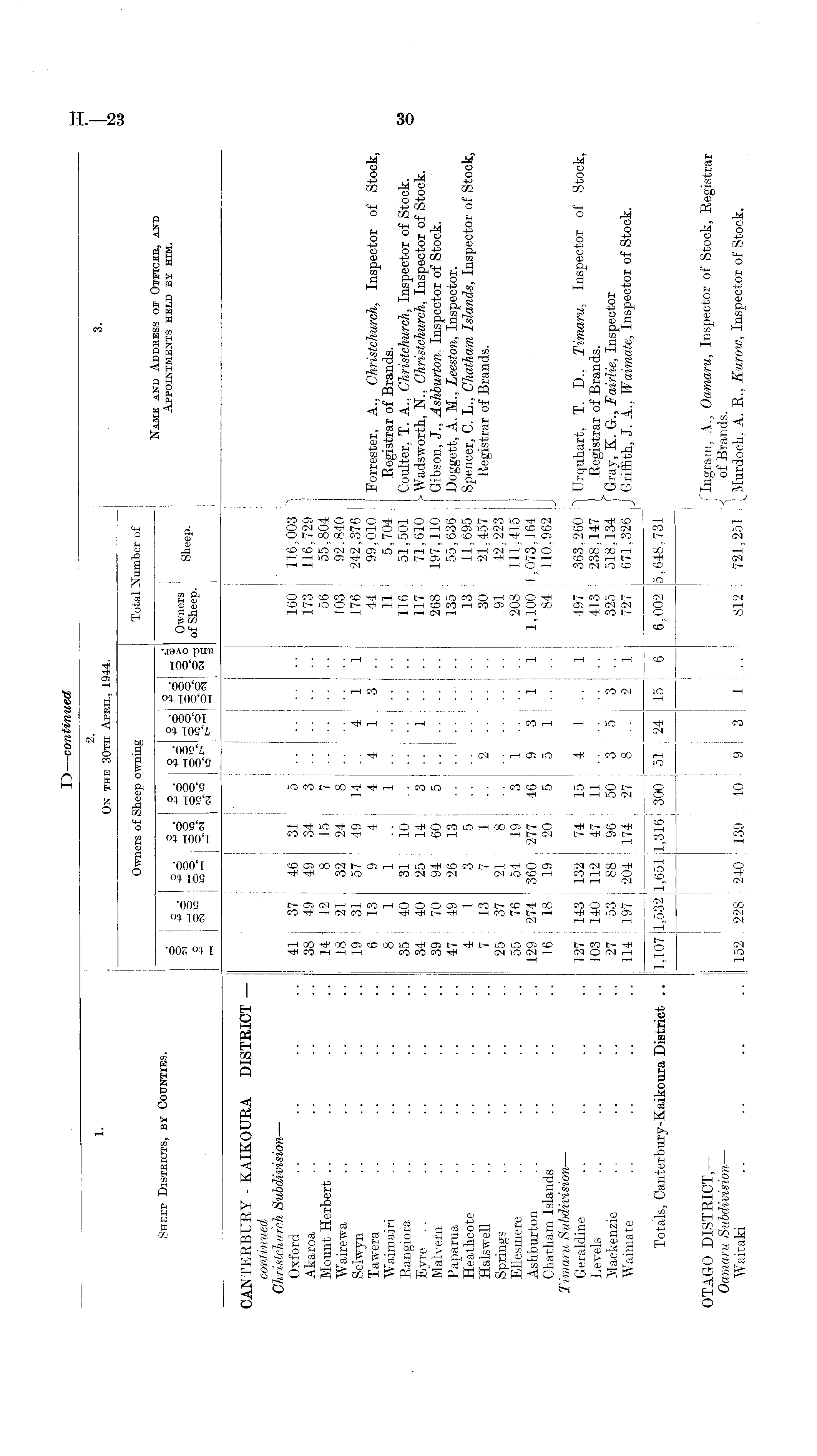 1 * 3 . On the 30th April, 1944. Owners of Sheep owning Total Number of . _ Name and Address of Officer, and Sheep Districts, by Counties. o o o o . .8 • ,_< g Appointments held by him. S "§ :8h| 3 ! §g Owners g , 3 |S 12 8 5- sg 8«- §1 §| §1 ofShee p- p - ,_I (M iO PH eg CANTERBURY - KAIKOURA DISTRICT — continued Christchurch Subdivision — Oxford .. .. .. .. 41 37 46 31 5 160 116,003 "] Akaroa .. .. .. .. 38 49 49 34 3 173 116,729 Mount Herbert .. .. .. .. 14 12 8 15 7 56 55,804 Wairewa .. .. .. 18 21 32 24 8 103 92.840 Selwyn .. .. .. 19 31 57 49 14 .. 4 1 1 176 242,376 Tawera .. .. .. .. 6 13 9 4 4413.. 44 99,010 Forrester, A., Christchurch, Inspector of Stock, Waimairi .. .. .. .. 8 1 1 .. 1 11 5,704 Registrar of Brands. Rangiora .. .. .. .. 35 40 31 10 116 51,501 Coulter, T. A., Christchurch, Inspector of Stock. Eyre .. .. .. .. .. 34 40 25 14 3 1 117 71,610 N., Christchurch, Inspector of Stock. Malvern .. .. .. .. 39 70 94 60 5 268 197,110 Gibson, J., Ashburton. Inspector of Stock. Paparua .. .. .. .. 47 49 26 13 135 55,636 Doggett, A. M.. Leeston, Inspector. Heathcote .. .. .. .. 4 1 3 5 13 11,695 Spencer, C. L., Chatham Islands, Inspector of Stock, Halswell .. .. .. .. 7 13 7 1 .. 2 30 21,457 Registrar of Brands. Springs .. .. .. .. 25 37 21 8 91 42,223 Ellesmere .. .. .. .. 55 76 54 19 3 1 208 111,415 Ashburton .. .. .. .. 129 274 360 277 46 9 3 1 1 1,100 1,073,164 Chatham Islands .. .. .. 16 18 19 20 5 5 1.... 84 110,962 Timaru Subdivision/ Geraldine .. .. .. .. 127 143 132 74 15 4 1 1 497 363,260 "] Urquhart, T. D., Timaru, Inspector of Stock, Levels .. .. .. .. 103 140 112 47 11 413 238,147 / Registrar of Brands. Mackenzie .. .. .. .. 27 53 88 96 50 3 5 3 . . 325 518, 134 f Gray, K. G., Fairlie, Inspector Waimate .. .. .. .. 114 197 204 174 27 8 .. 2 1 727 671,326 J Griffith, J. A., Waimate, Inspector of Stock. Totals, Canterbury-Kaikoura District .. 1.107 1,532 1,651 1,316 300 51 24 15 6 6,002 5,648,731 OTAGO DISTRICT, — flngram, A., Oamaru, Inspector of Stock, Registrar Oamaru Subdivision — •{ of Brands. Waitaki .. .. .. .. 152 ; 228 240 139 40 9 3 1 812 721,251 Murdoch, A. R., Kurow, Inspector of Stock.