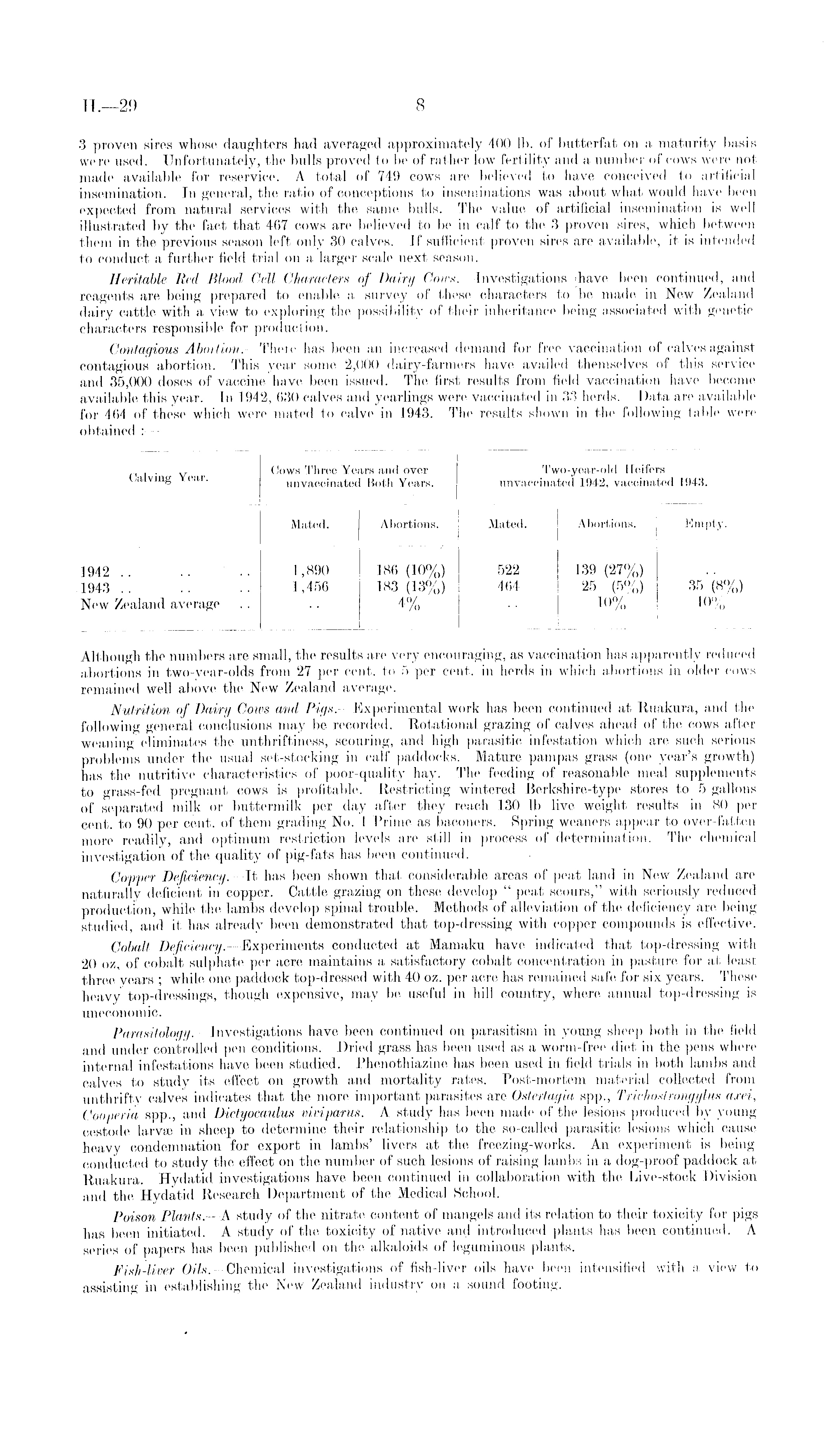 1 „ , . v Cows Three Years and over Two-year-old Heifers Calving Year. unvaccinated Both Years. unvaccinated 1942, vaccinated 1943. : ■ : Mated. Abortions. J Mated. Abortions. j Empty. 1942 1,890 186 (10%) 522 139 (27%) 1943 1,456 183 (13%) 464 25 (5%) 35 (8%) New Zealand average .. . . 4% . . 10% 10% _j