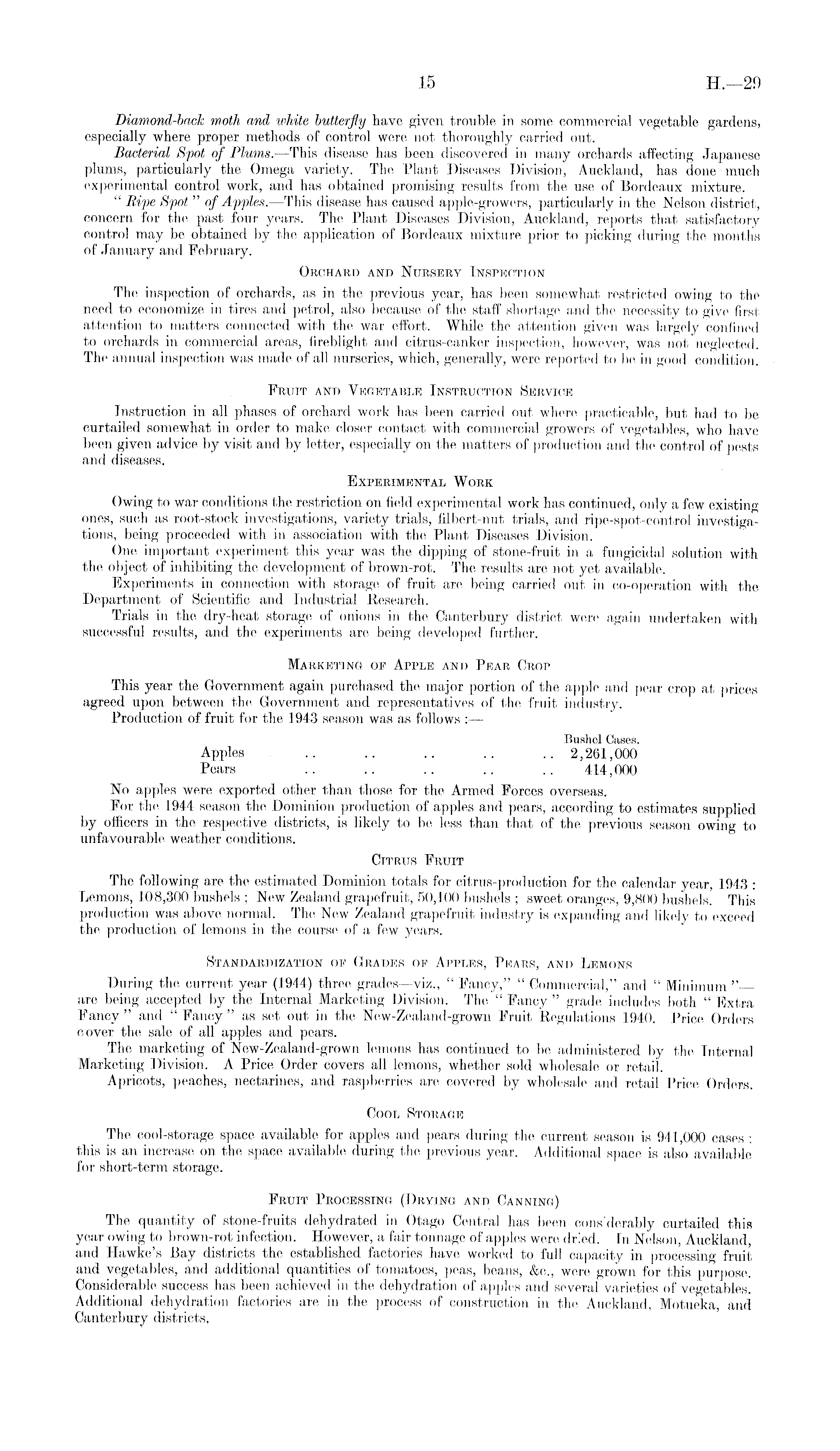 Diamond-back moth and white butterfly have given trouble in some commercial vegetable gardens, especially where proper methods of control were not thoroughly carried out. Bacterial Spot of Plums. —This disease has been discovered in many orchards affecting Japanese plums, particularly the Omega variety. The Plant Diseases Division, Auckland, has done much experimental control work, and has obtained promising results from the use of Bordeaux mixture. " Ripe Spot " of Appies. —This disease has caused apple-growers, particularly in the Nelson district, concern for the past four years. The Plant Diseases Division, Auckland, reports that satisfactory control may be obtained by the application of Bordeaux mixture prior to picking during the months of January and February. Orchard and Nursery Inspection The inspection of orchards, as in the previous year, has been somewhat restricted owing to the need to economize in tires and petrol, also because of the staff shortage and the necessity to give first attention to matters connected with the war effort. While, the attention given was largely confined to orchards in commercial areas, fireblight and citrus-canker inspection, however, was not neglected. The annual inspection was made of all nurseries, which, generally, were reported to be in good condition. Fruit and Vegetable Instruction Service Instruction in all phases of orchard work has been carried out where practicable, but had to be curtailed somewhat in order to make closer contact with commercial growers of vegetables, who have been given advice by visit and by letter, especially on the matters of production and the control of pests and diseases. Experimental Work Owing to war conditions the restriction on field experimental work has continued, only a few existing ones, such as root-stock investigations, variety trials, filbert-nut trials, and ripe-spot-control investigations, being proceeded with in association with the Plant Diseases Division. One important experiment this year was the dipping of stone-fruit in a fungicidal solution with the object of inhibiting the development of brown-rot. The results are not yet available. Experiments in connection with storage of fruit are being carried out in co-operation with the Department of Scientific and Industrial Research. Trials in the dry-heat storage of onions in the Canterbury district were again undertaken with successful results, and the experiments are being developed further. Marketing op Apple and Pear Crop This year the Government again purchased the major portion of the apple and pear crop at prices agreed upon between the Government and representatives of the fruit industry. Production of fruit for the 1943 season was as follows :— Bushel Cases. Apples .. .. .. .. .. 2,261,000 Pears .. .. .. .. .. 414,000 No apples were exported other than those for the Armed Forces overseas. For the 1944 season the Dominion production of apples and pears, according to estimates supplied by officers in the respective districts, is likely to be less than that of the previous season owing to unfavourable weather conditions. Cttrus Fruit The following are the estimated Dominion totals for citrus-production for the calendar year, 1943 : Lemons, 108,300 bushels ; New Zealand grapefruit, 50,100 bushels ; sweet oranges, 9,800 bushels. This production was above normal. The New Zealand grapefruit industry is expanding and likely to exceed the production of lemons in the course of a few years. Standardization op Grades op Apples, Pears, and Lemons During the current year (1944) three grades —viz., " Fancy," " Commercial," and " Minimum " are being accepted by the Internal Marketing Division. The " Fancy " grade includes both " Extra Fancy" and "Fancy" as set out in the New-Zealand-grown Fruit Regulations 1940. Price Orders cover the sale of all apples and pears. The marketing of New-Zealand-grown lemons has continued to be administered by the Internal Marketing Division. A Price Order covers all lemons, whether sold wholesale or retail. Apricots, peaches, nectarines, and raspberries are covered by wholesale and retail Price Orders. Cool Storage The cool-storage space available for apples and pears during the current season is 941,000 cases ; this is an increase on the space available during the previous year. Additional space is also available for short-term storage. Fruit Processing (Drying and Canning) The quantity of stone-fruits dehydrated in Otago Central has been cons'derably curtailed this year owing to brown-rot infection. However, a fair tonnage of apples were dried. In Nelson, Auckland, and Hawke's Bay districts the established factories have worked to full capacity in processing fruit and vegetables, and additional quantities of tomatoes, peas, beans, &c., were grown for this purpose. Considerable success has been achieved in the dehydration of apples and several varieties of vegetables. Additional dehydration factories are in the process of construction in the Auckland, Motueka, and Canterbury districts,