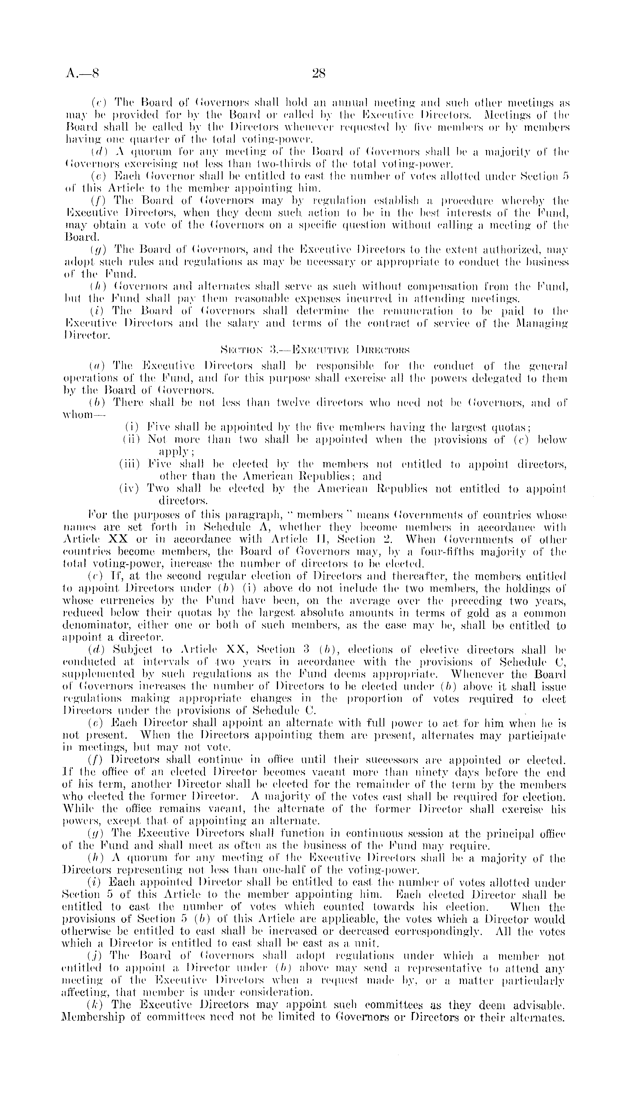 (c) The Boa I'd of Governors shall hold an annual meeting and such other meetings as may be provided for by the Board or called by the Executive Directors. Meetings of the Board shall be called by the Directors whenever requested by five members or by members having one quarter of the total voting-power. (d) A quorum for any meeting of the Board of Governors shall be a majority of the Governors exercising not less than two-thirds of the total voting-power. (e) Each Governor shall be entitled to cast the number of votes allotted under Section 5 of this Article to the member appointing him. (/') The Board of Governors may by regulation establish a procedure whereby the Executive Directors, when they deem such, action to be in the best interests of the Fund, may obtain a vote of the Governors on a specific question without calling a meeting of the Board. (g) The Board of Governors, and the Executive Directors to the extent authorized, may adopt such rules and regulations as may be necessary or appropriate to conduct the business of the Fund. (h) Governors and alternates shall serve as such without compensation from the Fund, but the Fund shall pay them reasonable expenses incurred in attending meetings. (t) The Board of Governors shall determine the remuneration to be paid to the Executive Directors and the salary and terms of the contract of service of the Managing Director. Section 3.—Executive Directors («) The Executive Directors shall be responsible for the conduct of the general operations of the Fund, and for this purpose shall exercise all the powers delegated to them by the Board of Governors. (i») There shall be not less than twelve directors who need not be Governors, and of whom— (i) Five shall be appointed by the five members having the largest quotas; (ii) Not more than two shall be appointed when the provisions of (c) below apply; (iii) Five shall be elected by the members not entitled to appoint directors, other than the American Republics; and (iv) Two shall be elected by the American Republics not entitled to appoint directors. For the purposes of this paragraph, " members " means Governments of countries whose names are set forth in Schedule A, whether they become members in accordance with Article XX or in accordance with Article 11, Section 2. When Governments of other countries become members, the Board of Governors may, by a four-fifths majority of the total voting-power, increase the number of directors to be elected. (c) If, at the second regular election of Directors and thereafter, the members entitled to appoint Directors under (b) (i) above do not include the two members, the holdings of whose currencies by the Fund have been, on the average over the preceding two years, reduced below their quotas by the largest absolute amounts in terms of gold as a common denominator, either one or both of such members, as the case may be, shall be entitled to appoint a director. (d) Subject to Article XX, Section 3 (6), elections of elective directors shall be conducted at intervals of -two years in accordance with the provisions of Schedule C, supplemented by such regulations as the Fund deems appropriate. Whenever the Board of Governors increases the number of Directors to be elected under (b) above it shall issue regulations making appropriate changes in the proportion of votes required to elect Directors under the provisions of Schedule C. (e) Each Director shall appoint an alternate with full power to act for him when he is not present. When the Directors appointing them are present, alternates may participate in meetings, but may not vote. (/) Directors shall continue in office until their successors are appointed or elected. If the office of an elected Director becomes vacant more than ninety days before the end of his term, another Director shall be elected for the remainder of the term by the members who elected the former Director. A majority of the votes cast shall be required for election. While the office remains vacant, the alternate of the former Director shall exercise his powers, except that of appointing an alternate. (g) The Executive Directors shall function in continuous session at the principal office of the Fund and shall meet as often as the business of the Fund may require. (h) A quorum for any meeting of the Executive Directors shall be a majority of the Directors representing not less than one-half of the voting-power. (i) Each appointed Director shall be entitled to cast the number of votes allotted under Section 5 of this Article to the member appointing him. Each elected Director shall be entitled to cast the number of votes which counted towards his election. When the provisions of Section 5 (b) of this Article are applicable, the votes which a Director would otherwise be entitled to cast shall be increased or decreased correspondingly. All the votes which a Director is entitled to cast shall be cast as a unit. (j) The Board of Governors shall adopt regulations under which a member not entitled to appoint a, Director under (ft) above may send a representative to attend any meeting of the Executive Directors whpn a request made by, or a matter particularly affecting, that member is under consideration. (k) The Executive Directors may appoint such committees as they deem advisable. Membership of committees need not be limited to Governors or Directors or their alternates.