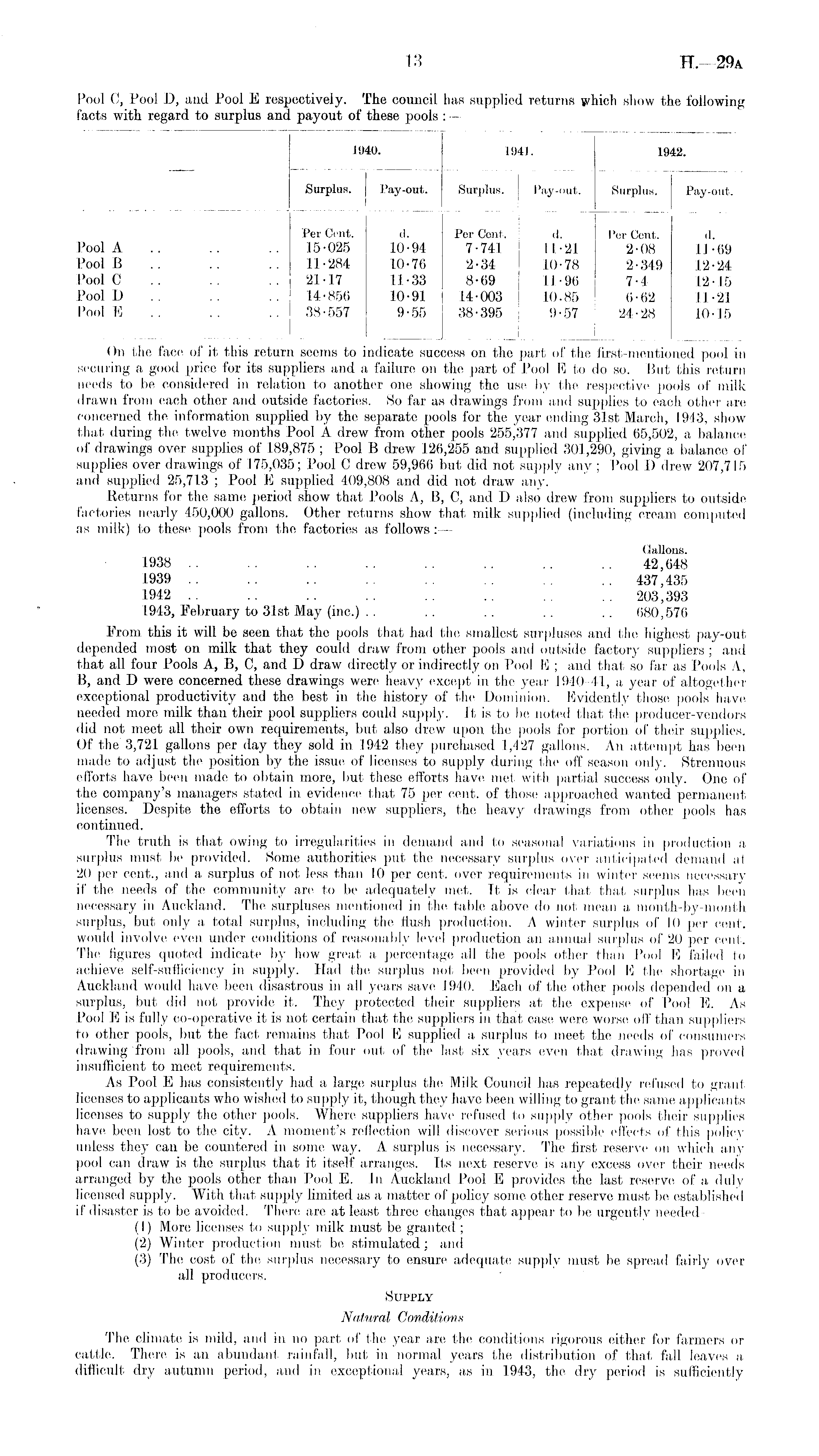On the face of it this return seems to indicate success on the part of the first-mentioned pool in securing a good price for its suppliers and a failure on the part of Pool Eto do so. But this return needs to be considered in relation to another one showing the use by the respective pools of milk drawn from each other and outside factories. So far as drawings from and supplies to each other are concerned the information supplied by the separate pools for the year ending 31st March, 1943, show that during the twelve months Pool A drew from other pools 255,377 and supplied 65,502, a balance of drawings over supplies of 189,875 ; Pool B drew 126,255 and supplied 301,290, giving a balance of supplies over drawings of 175,035; Pool C drew 59,966 but did not supply any; Pool D drew 207,715 and supplied 25,713 ; Pool B supplied 409,808 and did not draw any. Returns for the same period show that Pools A, B, C, and D also drew from suppliers to outside factories nearly 450,000 gallons. Other returns show that milk supplied (including cream computed as milk) to these pools from the factories as follows: — Gallons. 1938 .. .. .. .. .. .. .. .. 42,648 1939 .. .. 437,435 1942 .. .. .. .. .. .. 203,393 1943, February to 31st May (inc.) .. .. .. .. .. 680,576 From this it will be seen that the pools that had the smallest surpluses and the highest pay-out depended most on milk that they could draw from other pools and outside factory suppliers ; and that all four Pools A, B, C, and D draw directly or indirectly on Pool B ; and that so far as Pools A, B, and D were concerned these drawings were heavy except in the year 1940-41, a year of altogether exceptional productivity and the best in the history of the Dominion. Evidently those pools have needed more milk than their pool suppliers could supply. It is to be noted that the producer-vendors did not meet all their own requirements, but also drew upon the pools for portion of their supplies. Of the' 3,721 gallons per day they sold in 1942 they purchased 1,427 gallons. An attempt has been made to adjust the position by the issue of licenses to supply during the off season only. Strenuous efforts have been made to obtain more, but these efforts have met with partial success only. One of the company's managers stated in evidence that 75 per cent, of those approached wanted permanent licenses. Despite the efforts to obtain new suppliers, the heavy drawings from other pools has continued. The truth is that owing to irregularities in demand and to seasonal variations in production a surplus must be provided. Some authorities put the necessary surplus over anticipated demand at 20 per cent., and a surplus of not less than 10 per cent, over requirements in winter seems necessary if the needs of the community are to be adequately met. It is clear that that surplus has been necessary in Auckland. The surpluses mentioned in the table above do not mean a month-by-month surplus, but only a total surplus, including the flush production. A winter surplus of 10 per cent, would involve even under conditions of reasonably level production an annual surplus of 20 per cent. The figures quoted indicate by how great a percentage all the pools other than Pool E failed to achieve self-sufficiency in supply. Had the surplus not been provided by Pool E the shortage in Auckland would have been disastrous in all years save 1940. Each of the other pools depended on a surplus, but did not provide it. They protected their suppliers at the expense of Pool E. As Pool E is fully co-operative it is not certain that the suppliers in that case were worse off than suppliers to other pools, but the fact remains that Pool E supplied a surplus to meet the needs of consumers drawing from all pools, and that in four out of the last six years even that drawing has proved insufficient to meet requirements. As Pool E has consistently had a large surplus the Milk Council has repeatedly refused to grant licenses to applicants who wished to supply it, though they have been willing to grant the same applicants licenses to supply the other pools. Where suppliers have refused to supply other pools their supplies have been lost to the city. A moment's reflection will discover serious possible effects of this policy unless they can be countered in some way. A surplus is necessary. The first reserve on which any pool can draw is the surplus that it itself arranges. Its next reserve is any excess over their needs arranged by the pools other than Pool E. In Auckland Pool E provides the last reserve of a duly licensed supply. With that supply limited as a matter of policy some other reserve must be established if disaster is to be avoided. There are at least three changes that appear to be urgently needed— (1) More licenses to supply milk must be granted ; (2) Winter production must be stimulated; and (3) The cost of the surplus necessary to ensure adequate supply must be spread fairly over all producers. Supply Natural Conditions The climate is mild, and in no part of the year are the conditions rigorous either for farmers or cattle. There is an abundant rainfall, but in normal years the distribution of that fall leaves a difficult dry autumn period, and in exceptional years, as in 1943, the dry period is sufficiently