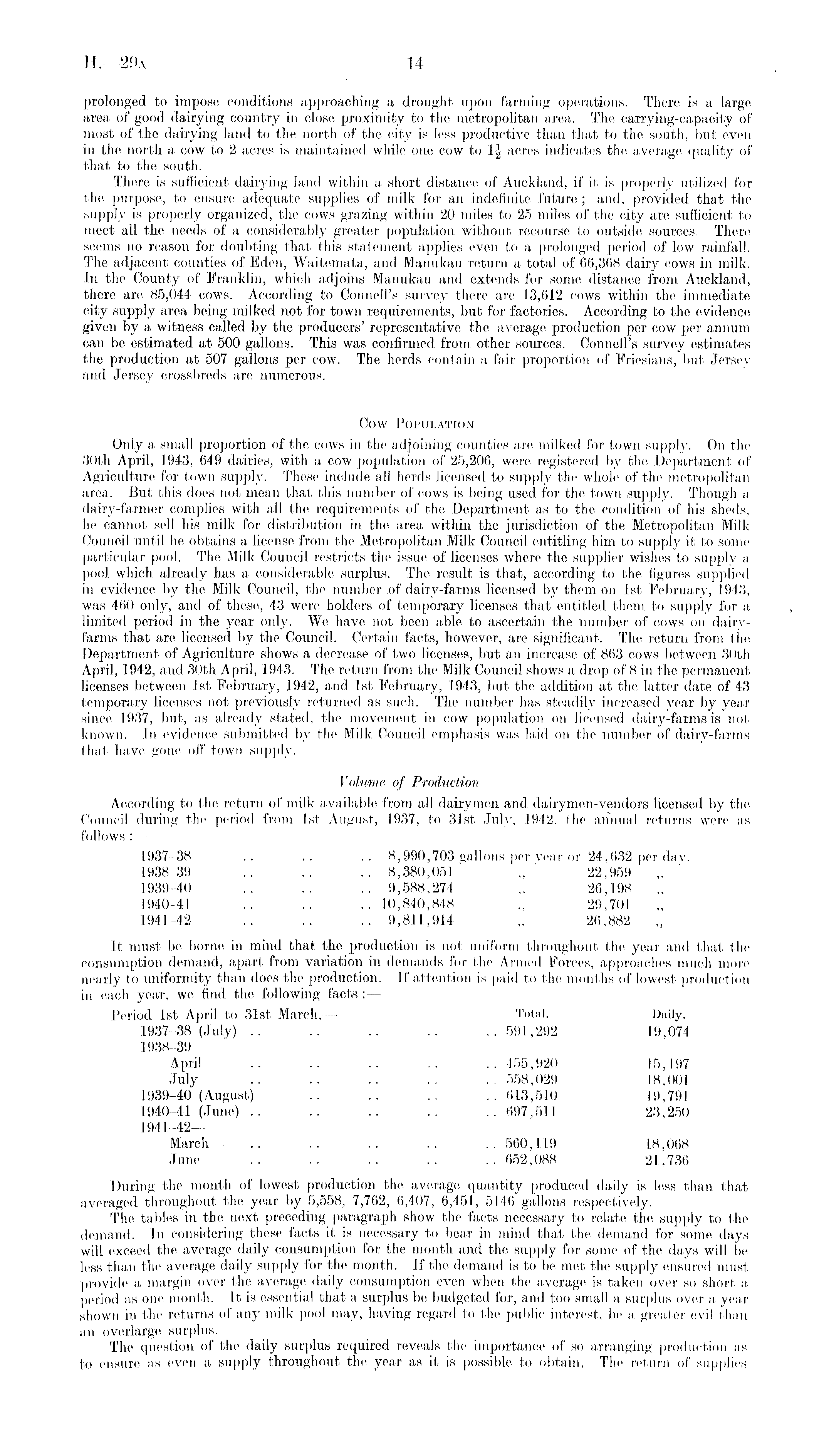 prolonged to impose conditions approaching a drought upon farming operations. There is a large area of good dairying country in close proximity to the metropolitan area. The carrying-capacity of most of the dairying land to the north of the city is less productive than that to the south, but even in the north a cow to 2 acres is maintained while one cow to If acres indicates the average quality of that to the south. There is sufficient dairying land within a short distance of Auckland, if it is properly utilized for the purpose, to ensure adequate supplies of milk for an indefinite future; and, provided that the supply is properly organized, the cows grazing within 20 miles to 25 miles of the city are sufficient to meet all the needs of a considerably greater population without recourse to outside sources. There seems no reason for doubting that this statement applies even to a prolonged period of low rainfall. The adjacent counties of Eden, Waitemata, and Manukau return a total of 66,368 dairy cows in milk. In the County of Franklin, which adjoins Manukau and extends for some distance from Auckland, there are 85,044 cows. According to Connell's survey there are 13,612 cows within the immediate city supply area being milked not for town requirements, but for factories. According to the evidence given by a witness called by the producers' representative the average production per cow per annum can be estimated at 500 gallons. This was confirmed from other sources. Connell's survey estimates the production at 507 gallons per cow. The herds contain a fair proportion of Friesians, but Jersey and Jersey crossbreds are numerous. Cow Population Only a small proportion of the cows in the adjoining counties are milked for town supply. On the 30th April, 1943, 649 dairies, with a cow population of 25,206, were registered by the Department of Agriculture for town supply. These include all herds licensed to supply the whole of the metropolitan area. But this does not mean that this number of cows is being used for the town supply. Though a dairy-farmer complies with all the requirements of the Department as to the condition of his sheds, he cannot sell his milk for distribution in the area within the jurisdiction of the Metropolitan MilkCouncil until he obtains a license from the Metropolitan Milk Council entitling him to supply it to some particular pool. The Milk Council restricts the issue of licenses where the supplier wishes to supply a pool which already has a considerable surplus. The result is that, according to the figures supplied in evidence by the Milk Council, the number .of dairy-farms licensed by them on Ist February, 1943, was 460 only, and of these, 43 were holders of temporary licenses that entitled them to supply for a limited period in the year only. We have not been able to ascertain the number of cows on dairyfarms that are licensed by the Council. Certain facts, however, are significant. The return from the Department of Agriculture shows a decrease of two licenses, but an increase of 863 cows between 30th April, 1942, and 30th April, 1943. The return from the Milk Council shows a drop of Bin the permanent licenses between Ist February, 1942, and Ist February, 1943, but the addition at the latter date of 43 temporary licenses not previously returned as such. The number has steadily increased year by year since 1937, but, as already stated, the movement in cow population on licensed dairy-farms is not known. In evidence submitted by the Milk Council emphasis was laid on the number of dairy-farms that have gone off town supply. Volume of Production According to the return of milk available from all dairymen and dairymen-vendors licensed by the Council during the period from Ist August, 1937, to 31st July, 1942, the annual returns were as follows: — 1937-38 .. .. .. 8,990,703 gallons per year or 24,632 per day. 1938-39 .. .. .. 8,380,051' „ 22,959 1939-40 .. .. .. 9,588,274 „ 26,198 „ 1940-41 .. .. .. 10,840,848 „ 29,701 1941-42 .. .. .. 9,811,914 „ 26,882 It must be borne in mind that the production is not uniform throughout the. year and that the consumption demand, apart from variation in demands for the Armed Forces, approaches much more nearly to uniformity than does the production. If attention is paid to the months of lowest production in each year, we find the following facts: — Period Ist April to 31st March, — Total. Daily. 1937-38 (July) .. .. .. .. ..591,292 19,074 1938-39— April .. .. .. .. ..455,920 15,197 July .. .. .. .. .. 558,029 18,001 1939-40 (August) .. .. .. ..613,510 19,791 1940-41 (June) .. .. .. .. ..697,511 23,250 1941-42 — March .. .. .. .. .. 560,119 18,068 June .. .. .. .. .. 652,088 21,736 During the month of lowest production the average quantity produced daily is less than that averaged throughout the year by 5,558, 7,762, 6,407, 6,451, 5146 gallons respectively. The tables in the next preceding paragraph show the facts necessary to relate the supply to the demand. In considering these facts it is necessary to bear in mind that the demand for some days will exceed the average daily consumption for the month and the supply for some of the days will be less than the average daily supply for the month. If the demand is to be met the supply ensured must provide a margin over the average daily consumption even when the average is taken over so short a period as one month. It is essential that a surplus be budgeted for, and too small a surplus over a year shown in the returns of any milk pool may, having regard to the public interest, be a greater evil than an overlarge surplus. The question of the daily surplus required reveals the importance of so arranging production as to ensure as even a supply throughout the year as it is possible to obtain, The return of supplies