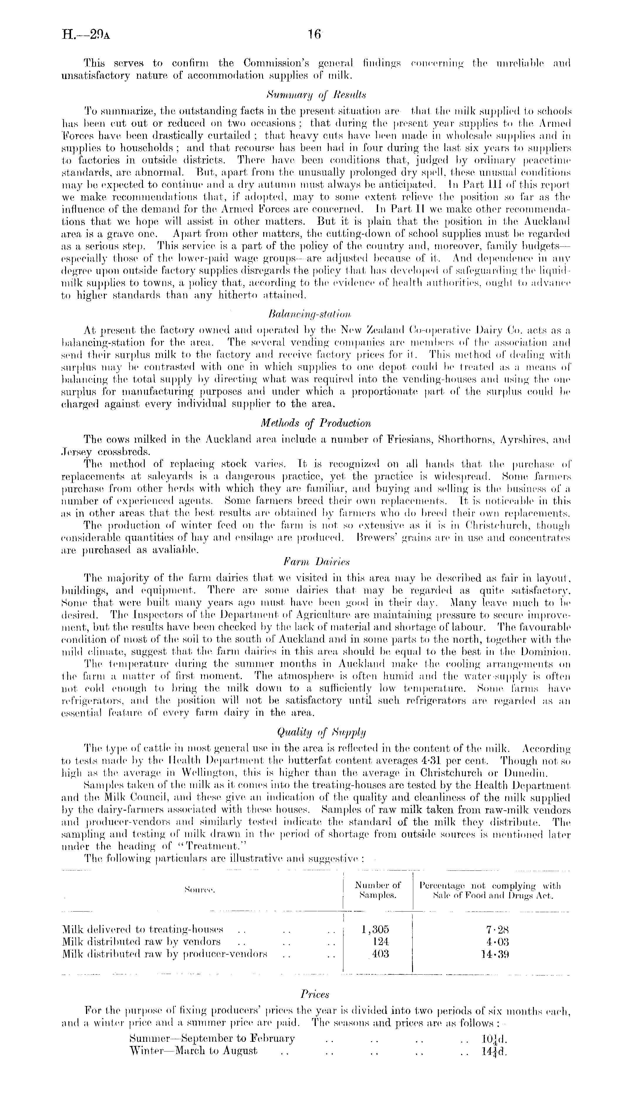 This serves to confirm the Commission's general findings concerning the unreliable and unsatisfactory nature of accommodation supplies of milk. Summary of Results To summarize, the outstanding facts in the present situation are —that the milk supplied to schools has been cut out or reduced on two occasions ; that during the present year supplies to the Armed Forces have been drastically curtailed ; that heavy cuts have been made in wholesale supplies and in supplies to households ; and that recourse has been had in four during the last six years to suppliers to factories in outside districts. There have been conditions that, judged by ordinary peacetime standards, are abnormal. But, apart from the unusually prolonged dry spell, these unusual conditions may be expected to continue and a dry autumn must always be anticipated. In Part 111 of this report we make recommendations that, if adopted, may to some extent relieve the position so far as the influence of the demand for the Armed Forces are concerned. In Part II we make other recommendations that we hope will assist in other matters. But it is plain that the position in the Auckland area is a grave one. Apart from other matters, the cutting-down of school supplies must be regarded as a serious step. This service is a part of the policy of the country and, moreover, family budgets — especially those of the lower-paid wage groups —are adjusted because of it. And dependence in any degree upon outside factory supplies disregards the policy that has developed of safeguarding the liquidmilk supplies to towns, a policy that, according to the evidence of health authorities, ought to advance to higher standards than any hitherto attained. Balancing-station At present the factory owned and operated by the New Zealand Co-operative Dairy Co. acts as a balancing-station for the area. The several vending companies are members of the association and send their surplus milk to the factory and receive factory prices for it. This method of dealing with surplus may be contrasted with one in which supplies to one depot could be treated as a means of balancing the total supply by directing what was required into the vending-houses and using the one surplus for manufacturing purposes and under which a proportionate part of the surplus could be charged against every individual supplier to the area. Methods of Production The cows milked in the Auckland area include a number of Friesians, Shorthorns, Ayrshires, and Jersey crossbreds. The method of replacing stock varies. It is recognized on all hands that the purchase of replacements at saleyards is a dangerous practice, yet the practice is widespread. Some farmers purchase from other herds with which they are familiar, and buying and selling is the business of a number of experienced agents. Some farmers breed their own replacements. It is noticeable in this as in other areas that the best results are obtained by farmers who do breed their own replacements. The production of winter feed on the farm is not so extensive as it is in Christchurch, though considerable quantities of hay and ensilage are produced. Brewers' grains are in use and concentrates are purchased as available. Farm Dairies The majority of the farm dairies that we visited in this area may be described as fair in layout, buildings, and equipment. There are some dairies that may be regarded as quite satisfactory. Some that were built many years ago must have been good in their day. Many leave much to be desired. The Inspectors of the Department of Agriculture are maintaining pressure to secure improvement, but the results have been checked by the lack of material and shortage of labour. The favourable condition of most of the soil to the south of Auckland and in some parts to the north, together with the mild climate, suggest that the farm dairies in this area should be equal to the best in the Dominion. The temperature during the summer months in Auckland make the cooling arrangements on the farm a matter of first moment. The atmosphere is often humid and the water-supply is often not cold enough to bring the milk down to a sufficiently low temperature. Some farms have refrigerators, and the position will not be satisfactory until such refrigerators are regarded as an essential feature of every farm dairy in the area. Quality of Supply The type of cattle in most general use in the area is reflected in the content of the milk. According to tests made by the Health Department the butterfat content averages 4-31 per cent. Though not so high as the average in Wellington, this is higher than the average in Christchurch or Dunedin. Samples taken of the milk as it comes into the treating-houses are tested by the Health Department and the Milk Council, and these give an indication of the quality and cleanliness of the milk supplied by the dairy-farmers associated with these houses. Samples of raw milk taken from raw-milk vendors and producer-vendors and similarly tested indicate the standard of the milk they distribute. The sampling and testing of milk drawn in the period of shortage from outside sources is mentioned later under the heading of "Treatment." The following particulars are illustrative and suggestive : —