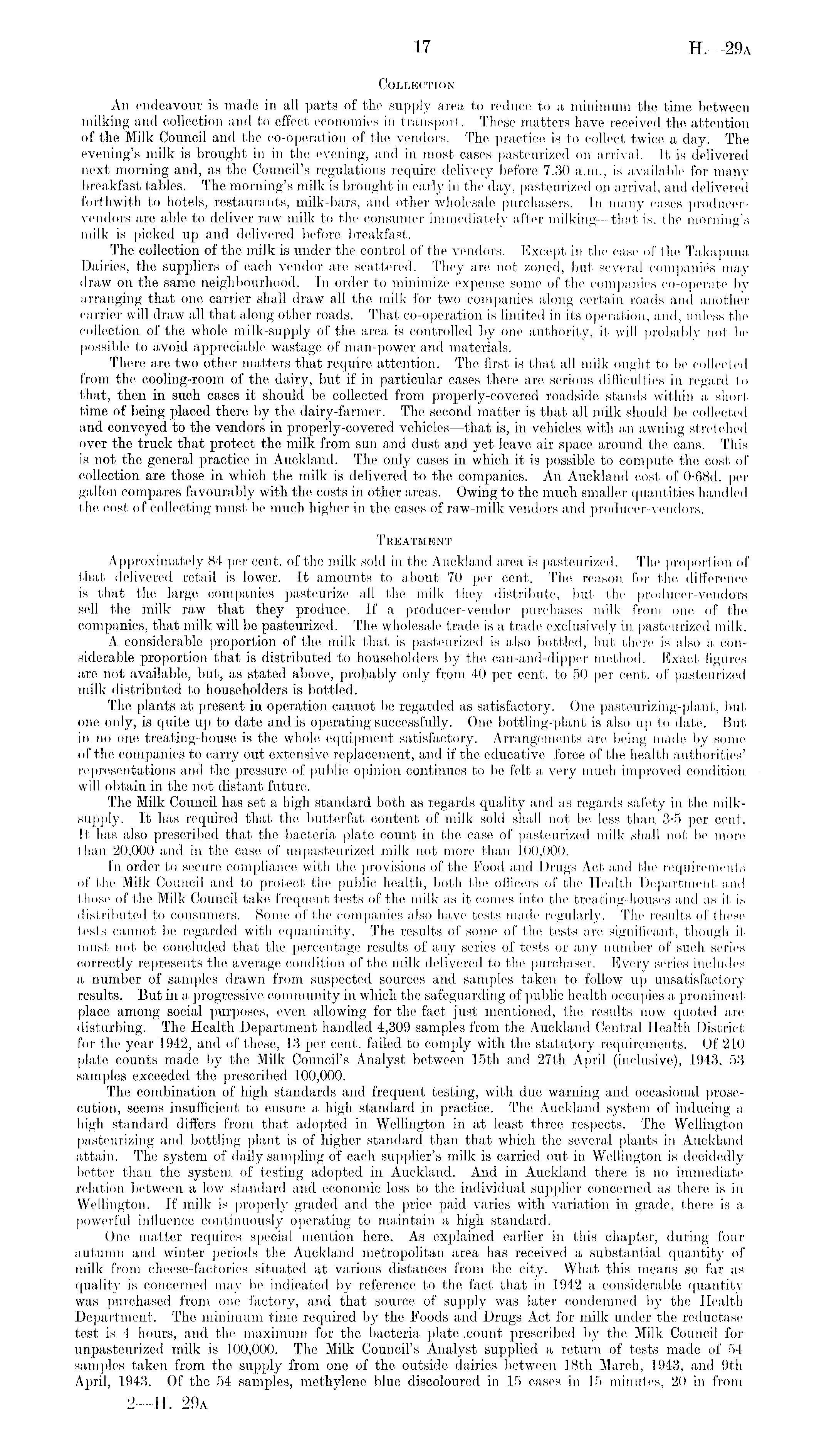 Collection An endeavour is made in all parts of the supply area to reduce to a minimum the time between milking and collection and to effect economies in transport. These matters have received the attention of the Milk Council and the co-operation of the vendors. The practice is to collect twice a day. The evening's milk is brought in in the evening, and in most cases pasteurized on arrival. Tt is delivered next morning and, as the Council's regulations require delivery before 7.30 a.m., is available for many breakfast tables. The morning's milk is brought in early in the day, pasteurized on arrival, and delivered forthwith to hotels, restaurants, milk-bars, and other wholesale purchasers. In many cases producervendors are able to deliver raw milk to the consumer immediately after milking—that is, the morning's milk is picked up and delivered before breakfast. The collection of the milk is under the control of the vendors. Except in the case of the Takapuna Dairies, the suppliers of each vendor are scattered. They are not zoned, but several companies may draw on the same neighbourhood. In order to minimize expense some of the companies co-operate by arranging that one carrier shall draw all the milk for two companies along certain roads and another carrier will draw all that along other roads. That co-operation is limited in its operation, and, unless the collection of the whole milk-supply of the area is controlled by one authority, it will probably not be possible to avoid appreciable wastage of man-power and materials. There are two other matters that require attention. The first is that all milk ought to be collected from the cooling-room of the dairy, but if in particular cases there are serious difficulties in regard to that, then in such cases it should be collected from properly-covered roadside stands within a short time of being placed there by the dairy-farmer. The second matter is that all milk should be collected and conveyed to the vendors in properly-covered vehicles—that is, in vehicles with an awning stretched over the truck that protect the milk from sun and dust and yet leave air space around the cans. This is not the general practice in Auckland. The only cases in which it is possible to compute the cost of collection are those in which the milk is delivered to the companies. An Auckland cost of 0-68 d. per gallon compares favourably with the costs in other areas. Owing to the much smaller quantities handled the cost of collecting must be much higher in the cases of raw-milk vendors and producer-vendors. Tbeatment Approximately 84 per cent, of the milk sold in the Auckland area is pasteurized. The proportion of that delivered retail is lower. It amounts to about 70 per cent. The reason for the difference is that the large companies pasteurize all the milk they distribute, but the producer-vendors sell the milk raw that they produce. If a producer-vendor purchases milk from one of the companies, that milk will be pasteurized. The wholesale trade is a trade exclusively in pasteurized milk. A considerable proportion of the milk that is pasteurized is also bottled, but there is also a considerable proportion, that is distributed to householders by the can-and-dipper method. Exact figures are not available, but, as stated above, probably only from 40 per cent, to 50 per cent, of pasteurized milk distributed to householders is bottled. The plants at present in operation cannot be regarded as satisfactory. One pasteurizing-plant, but one only, is quite up to date and is operating successfully. One bottling-plant is also up to date. But in no one treating-house is the whole equipment satisfactory. Arrangements are being made by some of the companies to carry out extensive replacement, and if the educative force of the health authorities' representations and the pressure of public opinion continues to be felt a very much improved condition will obtain in the not distant future. The Milk Council has set a high standard both as regards quality and as regards safety in the milksupply. It has required that the butterfat content of milk sold shall not be less than 3-5 per cent. It has also prescribed that the bacteria plate count in the case of pasteurized milk shall not be more I lian 20,000 and in the case of unpasteurized milk not more than 100,000. In order to secure compliance with the provisions of the Pood and Drugs Act and the requirements of the Milk Council and to protect the public health, both the officers of the Health Department and those of the Milk Council take frequent tests of the milk as it comes into the treating-houses and as it is distributed to consumers. Some of the companies also have tests made regularly. The results of these tests cannot be regarded with equanimity. The results of some of the tests are significant, though it must not be concluded that the percentage results of any series of tests or any number of such series correctly represents the average condition of the milk delivered to the purchaser. Every series includes a number of samples drawn from suspected sources and samples taken to follow up unsatisfactory results. But in a progressive community in which the safeguarding of public health occupies a prominent place among social purposes, even allowing for the fact just mentioned, the results now quoted are disturbing. The Health Department handled 4,309 samples from the Auckland Central Health District for the year 1942, and of these, 13 per cent, failed to comply with the statutory requirements. Of 210 plate counts made by the Milk Council's Analyst between 15th and 27th April (inclusive), 1943, 53 samples exceeded the prescribed 100,000. The combination of high standards and frequent testing, with due warning and occasional prosecution, seems insufficient to ensure a high standard in practice. The Auckland system of inducing a high standard differs from that adopted in Wellington in at least three respects. The Wellington pasteurizing 