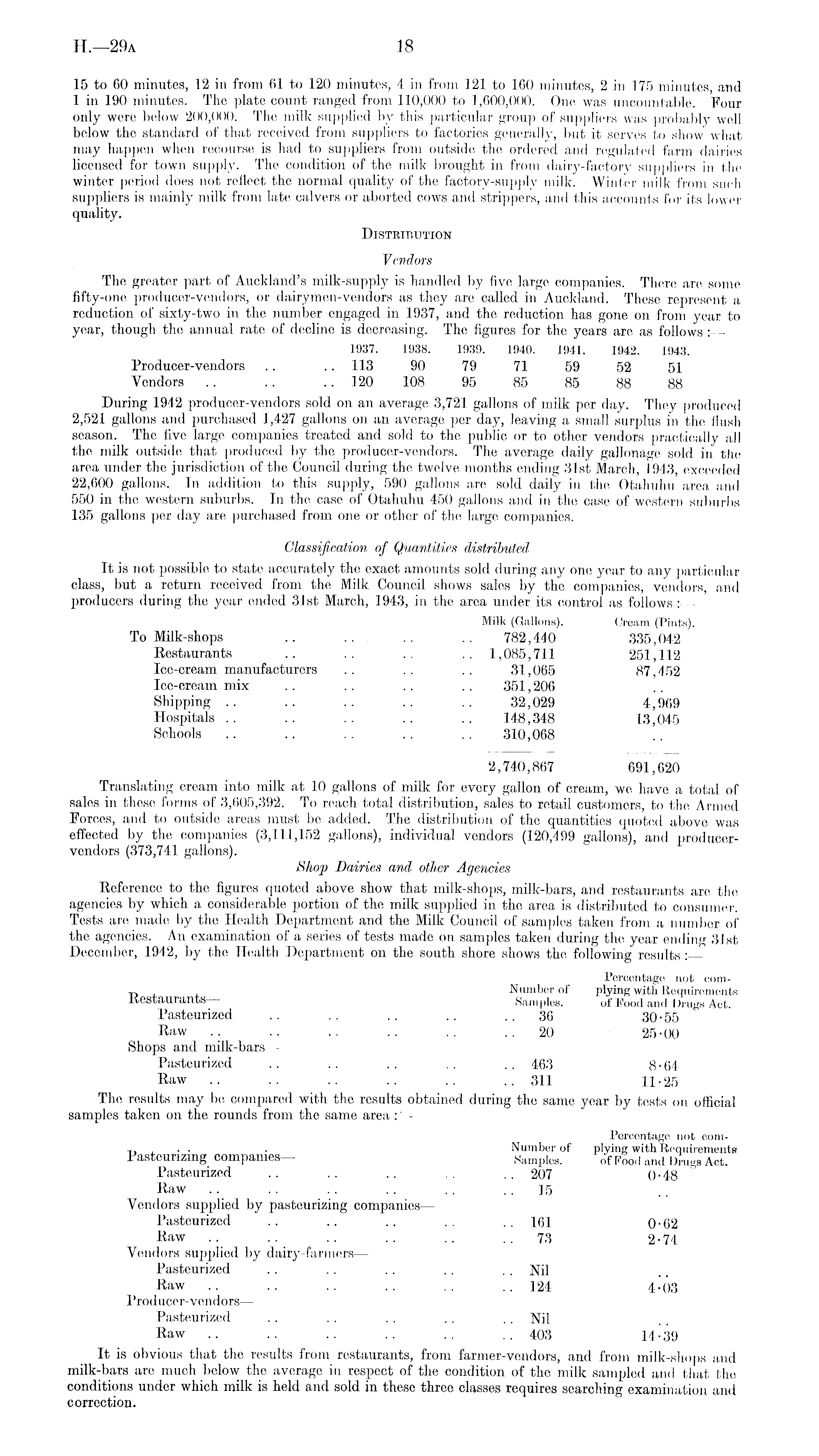 15 to 60 minutes, 12 in from 61 to 120 minutes, 4 in from 121 to 160 minutes, 2 in 175 minutes, and lin 190 minutes. The plate count ranged from 110,000 to 1,600,000. One was uncountable. Four only were below 200,000. The milk supplied by this particular group of suppliers was probably well below the standard «f that received from suppliers to factories generally, but it serves to show what may happen when recourse is had to suppliers from outside the ordered and regulated farm dairies licensed for town supply. The condition of the milk brought in from dairy-factory suppliers in the winter period does not reflect the normal quality of the factory-supply milk. Winter milk from such suppliers is mainly milk from late calvers or aborted cows and strippers, and this accounts for its lower quality. Distribution Vendors The greater part of Auckland's milk-supply is handled by five largo companies. There are some fifty-one producer-vendors, or dairymen-vendors as they are called in Auckland. These represent a reduction of sixty-two in the number engaged in 1937, and the reduction has gone on from year to year, though the annual rate of decline is decreasing. The figures for the years are as follows : 1937. 1938. 1939. 1940. 1941. 1942. 1943. Producer-vendors .. .. 113 90 79 71 59 52 51 Vendors .. .. .. 120 108 95 85 85 88 88 During 1942 producer-vendors sold on an average 3,721 gallons of milk per day. They produced 2,521 gallons and purchased 1,427 gallons on an average per day, leaving a small surplus in the flush season. The five large companies treated and sold to the public or to other vendors practically all the milk outside that produced by the producer-vendors. The average daily gallonage sold in the area under the jurisdiction of the Council during the twelve months ending 31st March, 1943, exceeded 22,600 gallons. In addition to this supply, 590 gallons are sold daily in the Otahuhu area and 550 in the western suburbs. In the case of Otahuhu 450 gallons and in the case of western suburbs 135 gallons per day are purchased from one or other of the largo companies. Classification of Quantities distributed It is not possible to state accurately the exact amounts sold during any one year to any particular class, but a return received from the Milk Council shows sales by the companies, vendors, and producers during the year ended 31st March, 1943, in the area under its control as follows : Milk (Gallons). Cream (Pints). To Milk-shops .. .. .. .. 782,440 335,042 Restaurants .. .. .. .. 1,085,711 251,112 Ice-cream manufacturers .. .. .. 31,065 87,452 Ice-cream mix .. .. .. .. 351,206 Shipping .. .. .. .. .. 32,029 4,969 Hospitals .. .. .. .. .. 148,348 13,045 Schools .. .. .. .. .. 310,068 2,740,867 691,620 Translating cream into milk at 10 gallons of milk for every gallon of cream, we have a total of sales in these forms of 3,605,392. To reach total distribution, sales to retail customers, to the Armed Forces, and to outside areas must be added. The distribution of the quantities quoted above was effected by the companies (3,111,152 gallons), individual vendors (120,499 gallons), and producervendors (373,741 gallons). Shop Dairies and other Agencies Reference to the figures quoted above show that milk-shops, milk-bars, and restaurants are the agencies by which a considerable portion of the milk supplied in the area is distributed to consumer. Tests are made by the Health Department and the Milk Council of samples taken from a number of the agencies. An examination of a series of tests made on samples taken during the year ending 31st December, 1942, by the Health Department on the south shore shows the following results : Percentage not com--r, , , Number of plying with Requirements Kestaurants Samples. of Pood and Drugs Act. Pasteurized . . . . .. . . . . 36 30-55 Raw .. .. .. .. .. ..20 25-00 Shops and milk-bars— Pasteurized .. .. .. .. .. 463 8• 64 Raw .. .. .. .. .. ..311 11-25 The results may be compared with the results obtained during the same year by tests on official samples taken on the rounds from the same area Percentage not com--r. , . . . Number of plying with Requirements Pasteurizing companies— Samples. of F6od and Drugs Act. Pasteurized .. .. .. .. .. 207 0-48 Raw .. .. .. .. .. 15 Vendors supplied by pasteurizing companies— Pasteurized .. .. .. .. .. 161 0-62 Raw .. .. .. .. ..73 2-74 Vendors supplied by dairy-farmers— Pasteurized .. .. .. .. .. Nil Raw .. .. .. .. .. .. 124 4-03 Producer-vendors— Pasteurized .. .. .. .. .. Nil Raw .. .. .. .. .. ..403 14-39 It is obvious that the results from restaurants, from farmer-vendors, and from milk-shops and milk-bars are much below the average in respect of the condition of the milk sampled and that the conditions under which milk is held and sold in these three classes requires searching examination and correction.