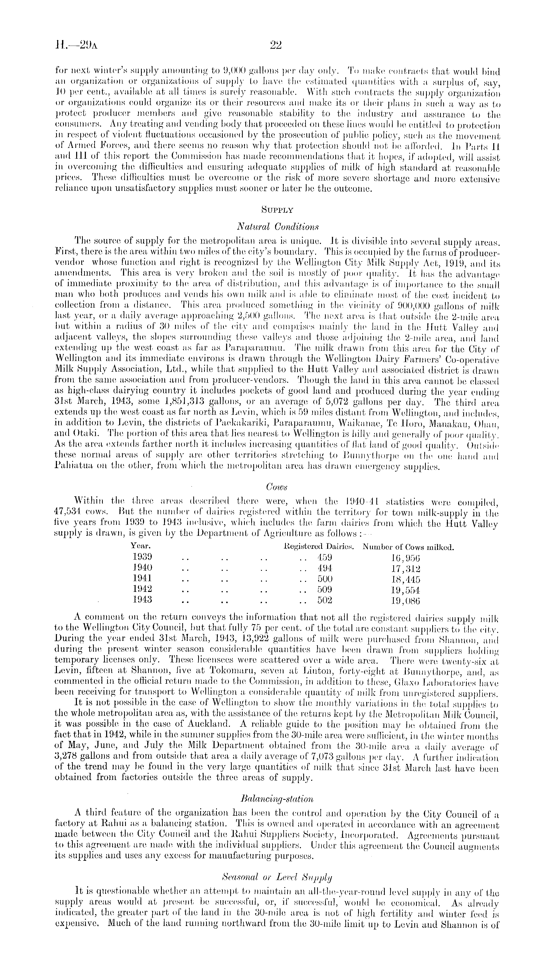 for next winter's supply amounting to 9,000 gallons per day only. To make contracts that would bind an organization or organizations of supply to have the estimated quantities with a surplus of, say, 10 per cent., available at all times is surely reasonable. With such contracts the supply organization or organizations could organize its or their resources and make its or their plans in such a way as to protect producer members and give reasonable stability to the industry and assurance to the consumers. Any treating and vending body that proceeded on these lines would be entitled to protection in respect of violent fluctuations occasioned by the prosecution of public policy, such as the movement of Armed Forces, and there seems no reason why that protection should not be afforded. In Parts II and 111 of this report the Commission has made recommendations that it hopes, if adopted, will assist in overcoming the difficulties and ensuring adequate supplies of milk of high standard at reasonable prices. These difficulties must be overcome or the risk of more severe shortage and more extensive reliance upon unsatisfactory supplies must sooner or later be the outcome. Supply Natural Conditions The source of supply for the metropolitan area is unique. It is divisible into several supply areas. First, there is the area within two miles of the city's boundary. This is occupied by the farms of producervendor whose function and right is recognized by the Wellington City Milk Supply Act, 1919, and its amendments. This area is very broken and the soil is mostly of poor quality. It has the advantage of immediate proximity to the area of distribution, and this advantage is of importance to the small man who both produces and vends his own milk and is able to eliminate most of the cost incident to collection from a distance. This area produced something in the vicinity of 900,000 gallons of milk last year, or a daily average approaching 2,500 gallons. The next area is that outside the 2-mile area but within a radius of 30 miles of the city and comprises mainly the land in the Hutt Valley and adjacent valleys, the slopes surrounding these valleys and those adjoining the 2-mile area, and land extending up the west coast as far as Paraparaumu. The milk drawn from this area for the City of Wellington and its immediate environs is drawn through the Wellington l)airy Farmers' Co-operative Milk Supply Association, Ltd., while that supplied to the Hutt Valley and associated district is drawn from the same association and from producer-vendors. Though the land in this area cannot be classed as high-class dairying country it includes pockets of good land and produced during the year ending 31st March, 1943, some 1,851,313 gallons, or an average of 5,072 gallons per day. The third area extends up the west coast as far north as Levin, which is 59 miles distant from Wellington, and includes, in addition to Levin, the districts of Paekakariki, Paraparaumu,. Waikanae, Te Horo, Manakau, Ohau, and Otaki. The portion of this area that lies nearest to Wellington is hilly and generally of poor quality. As the area extends farther north it includes increasing quantities of flat land of good quality. Outside these normal areas of supply are other territories stretching to Bunnythorpe on the one hand and Pahiatua on the other, from which the metropolitan area has drawn emergency supplies. Cows Within the three areas described there were, when the 1940-41 statistics were compiled, 47,534 cows. But the number of dairies registered within the territory for town milk-supply in the five years from 1939 to 1943 inclusive, which includes the farm dairies from which the Hutt Valley supply is drawn, is given by the Department of Agriculture as follows Year. Registered Dairies. Number of Cows milked. 1939 .. .. .. ..459 16,956 1940 .. .. .. ..494 17,312 1941 .. .. .. ..500 18,445 1942 .. .. .. ..509 19,554 1943 502 19,086 A comment on the return conveys the information that not all the registered dairies supply milk to the Wellington City Council, but that fully 75 per cent, of the total are constant suppliers to the city. During the year ended 31st March, 1943, 13,922 gallons of milk were purchased from Shannon, and during the present winter season considerable quantities have been drawn from suppliers holding temporary licenses only. These licensees were scattered over a wide area. There were twenty-six at Levin, fifteen at Shannon, five at Tokomaru, seven at Linton, forty-eight at Bunnythorpe, and, as commented in the official return made to the Commission, in addition to these, Glaxo Laboratories have been receiving for transport to Wellington a considerable quantity of milk from unregistered suppliers. It is not possible in the case of Wellington to show the monthly variations in the total supplies to the whole metropolitan area as, with the assistance of the returns kept by the Metropolitan Milk Council, it was possible in the case of Auckland. A reliable guide to the position may be obtained from the fact that in 1942, while in the summer supplies from the 30-milc area were sufficient, in the winter months of May, June, and July the Milk Department obtained from the 30-mile area a daily average of 3,278 gallons and from outside that area a daily average of 7,073 gallons per day. A further indication of the trend may be found in the very large quantities of milk that since 31st March last have been obtained from factories outside the three areas of supply. Balancing-station A third feature of the organization has been the control and operation by the City Council of a factory at Rahui as a balancing station. This is owned and operated in accordance with an agreement made between the City Council and the Rahui Suppliers Society, Incorporated. Agreements pursuant to this agreement arc made with the individual suppliers. Under this agreement the Council augments its supplies and uses any excess for manufacturing purposes. Seasonal o