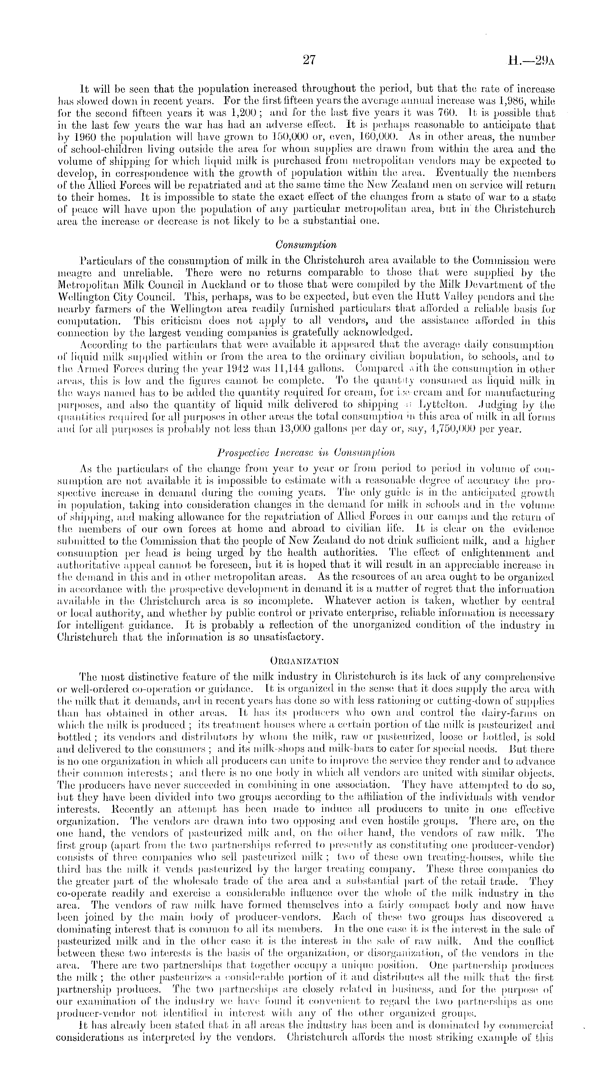 It will be seen that the population increased throughout the period, but that the rate of increase lias slowed down in recent years. For the first fifteen years the average annual increase was 1,986, while for the second fifteen years it was 1,200; and for the last five years it was 760. It is possible that in the last few years the war has had an adverse effect. It is perhaps reasonable to anticipate that by 1960 the population will have grown to 150,000 or, even, 160,000. As in other areas, the number of school-children living outside the area for whom supplies are drawn from within the area and the volume of shipping for which liquid milk is purchased from metropolitan vendors may bo expected to develop, in correspondence with the growth of population within the area. Eventually the members of the Allied Forces will be repatriated and at the same time the New Zealand men on service will return to their homes. It is impossible to state the exact effect of the changes from a state of war to a state of peace will have upon the population of any particular metropolitan area, but in' the Christchurch area the increase or decrease is not likely to be a substantial one. Consumption Particulars of the consumption of milk in the Christchurch area available to the Commission were meagre and unreliable. There were no returns comparable to those that were supplied by the Metropolitan Milk Council in Auckland or to those that were compiled by the Milk Devartment of the Wellington City Council. This, perhaps, was to be expected, but even the Hutt Valley pendors and the nearby farmers of the Wellington area readily furnished particulars that afforded a reliable basis for computation. This criticism does not apply to all vendors, and the assistance afforded in this connection by the largest vending companies is gratefully acknowledged. According to the particulars that were available it appeared that the average daily consumption of liquid milk supplied within or from the area to the ordinary civilian bopulation, to schools, and to the Armed Forces during the year 1942 was 11,144 gallons. Compared with the consumption in other areas, this is low and the figures cannot be complete. To the quantity consumed as liquid milk in the ways named has to be added the quantity required for cream, for ii;e- cream and for manufacturing purposes, and also the quantity of liquid milk delivered to shipping at Lyttelton. Judging by the quantities required for all purposes in other areas the total consumption in this area of milk in all forms and for all purposes is probably not less than 13,000 gallons per day or, say, 4,750,000 per year. Prospective Increase in Consumption As the particulars of the change from year to year or from period to period in volume of consumption are not available it is impossible to estimate with a reasonable degree of accuracy the prospective increase in demand during the coming years. The only guide is in the anticipated growth in population, taking into consideration changes in the demand for milk in schools and in the volume of shipping, and making allowance for the repatriation of Allied Forces in our camps and the return of the members of our own forces at home and abroad to civilian life. It is clear on the evidence submitted to the Commission that the people of New Zealand do not drink sufficient milk, and a higher consumption per head is being urged by the health authorities. The effect of enlightenment and authoritative appeal cannot be foreseen, but it is hoped that it will result in an appreciable increase in the demand in this and in other metropolitan areas. As the resources of an area ought to be organized in accordance with the prospective development in demand it is a matter of regret that the information available in the Christchurch area is so incomplete. Whatever action is taken, whether by central or local authority, and whether by public control or private enterprise, reliable information is necessary for intelligent guidance. It is probably a reflection of the unorganized condition of the industry in Christchurch that the information is so unsatisfactory. Organization The most distinctive feature of the milk industry in Christchurch is its lack of any comprehensive or well-ordered co-operation or guidance. It is .organized in the sense that it does supply the area with the milk that it demands, and in recent years has done so with less rationing or cutting-down of supplies than has obtained in other areas. It has its producers who own and control the dairy-farms on which the milk is produced ; its treatment houses where a certain portion of the milk is pasteurized and bottled ; its vendors and distributors by whom the milk, raw or pasteurized, loose or bottled, is sold and delivered to the consumers ; and its milk-shops and milk-bars to cater for special needs. But there is no one organization in which all producers can unite to improve the service they render and to advance their common interests; and there is no one body in which all vendors are united with similar objects. The producers have never succeeded in combining in one association. They have attempted to do so, but they have been divided into two groups according to the affiliation of the individuals with vendor interests. Recently an attempt has been made to induce all producers to unite in one effective organization. The vendors are drawn into two opposing and even hostile groups. There are, on the one hand, the vendors of pasteurized milk and, on the other hand, the vendors of raw milk. The first group (apart from the two partnerships referred to presently as constituting one producer-vendor) consists of three companies who sell pasteurized milk; two of these own treating-houses, while the third has the milk it vends pasteurized by the larger treating company. These three companies do the greater part of the wholesale trade of the area and a substantial part of the retail trade. They co-operate readily 