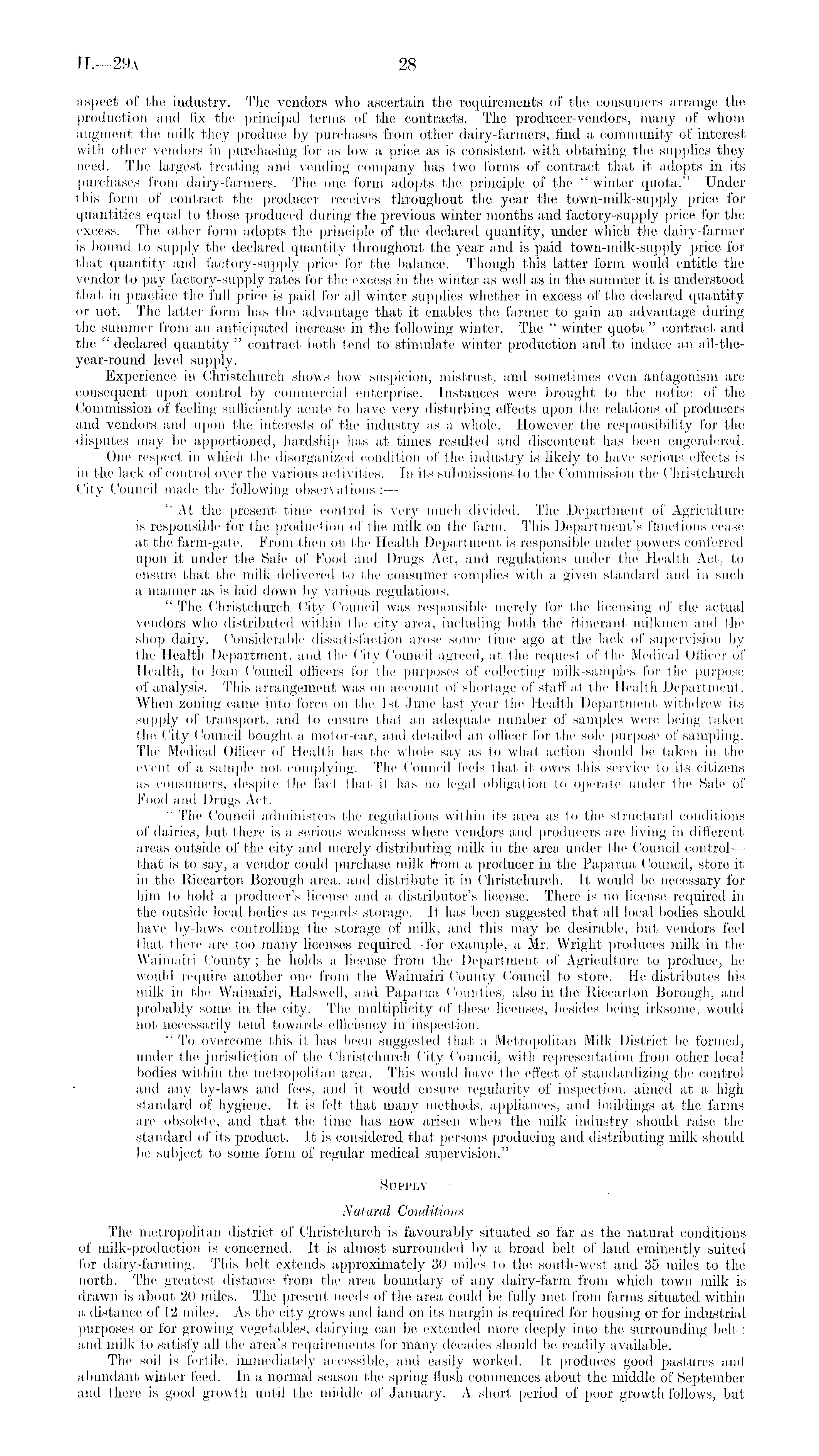 aspect of the industry. The vendors who ascertain the requirements of the consumers arrange the production and fix the principal terms of the contracts. The producer-vendors, many of whom augment the milk they produce by purchases from other dairy-farmers, find a community of interest with other vendors in purchasing for as low a price as is consistent, with obtaining the supplies they need. The largest treating and vending company has two forms of contract that it adopts in its purchases from dairy-farmers. The one form adopts the principle of the " winter quota." Under this form of contract the producer receives throughout the year the town-milk-supply price for quantities equal to those produced during the previous winter months and factory-supply price for the excess. The other form adopts the principle of the declared quantity, under which the dairy-farmer is bound to supply the declared quantity throughout the year and is paid town-milk-supply price for that quantity and factory-supply price for the balance. Though this latter form would entitle the vendor to pay factory-supply rates for the excess in the winter as well as in the summer it is understood that in practice the full price is paid for all winter supplies whether in excess of the declared quantity or not. The latter form has the advantage that it enables the farmer to gain an advantage during the summer from an anticipated increase in the following winter. The " winter quota " contract and the " declared quantity " contract both tend to stimulate winter production and to induce an all-the-year-round level supply. Experience in Christchurch shows how suspicion, mistrust, and sometimes even antagonism are consequent upon control by commercial enterprise. Instances were brought to the notice of the Commission of feeling sufficiently acute to have very disturbing effects upon the relations of producers and vendors and upon the interests of the industry as a whole. However the responsibility for the disputes may be apportioned, hardship has at times resulted and discontent has been engendered. One respect in which the disorganized condition of the industry is likely to have serious effects is in the lack of control over the various activities. In its submissions to the Commission the Christchurch City Council made the following observations: — "At the present time control is very much divided. The Department of Agriculture is responsible for the production of the milk on the farm. This Department's functions cease at the farm-gate. From then on the Health Department is responsible under powers conferred upon it under the Sale of Food and Drugs Act, and regulations under the Health Act, to ensure that the milk delivered to the consumer complies with a given standard and in such a manner as is laid down by various regulations. " The Christchurch City Council was responsible merely for the licensing of the actual vendors who distributed within the city area, including both the itinerant milkmen and the shop dairy. Considerable dissatisfaction arose some time ago at the lack of supervision by the Health Department, and the City Council agreed, at the request of the Medical Officer of Health, to loan Council officers for the purposes of collecting milk-samples for the purpose of analysis. This arrangement was on account of shortage of staff at the Health Department. When zoning came into force on the Ist June last year the Health Department withdrew its supply of transport, and to ensure that an adequate number of samples were being taken the City Council bought a motor-car, and detailed an officer for the sole purpose of sampling. The Medical Officer of Health has the whole say as to what action should be taken in the event of a sample not complying. The Council feels that it owes this service to its citizens as consumers, despite the feet that it has no legal obligation to operate under the Sale of Food and Drugs Act. " The Council administers the regulations within its area as to the structural conditions of dairies, but there is a serious weakness where vendors and producers are living in different areas outside of the city and merely distributing milk in the area under the Council control— that is to say, a vendor could purchase milk from a producer in the Paparua Council, store it in the Riccarton Borough area, and distribute it in Christchurch. It would be necessary for him to hold a producer's license and a distributor's license. There is no license required in the outside local bodies as regards storage. It has been suggested that all local bodies should have by-laws controlling the storage of milk, and this may be desirable, but vendors feel that there are too many licenses required—for example, a Mr. Wright produces milk in the Waimairi County; he holds a license from the Department of Agriculture to produce, he would require another one from the Waimairi County Council to store. He distributes his milk in the Waimairi, Halswell, and Paparua Counties, also in the Riccarton Borough, and probably some in the city. The multiplicity of these licenses, besides being irksome, would not necessarily tend towards efficiency in inspection. " To overcome this it has been suggested that a Metropolitan Milk District be formed, under the jurisdiction of the Christchurch City Council, with representation from other local bodies within the metropolitan area. This would have the effect of standardizing the control and any by-laws and fees, and it would ensure regularity of inspection, aimed at a high standard of hygiene. It is felt that many methods, appliances, and buildings at the farms are obsolete, and that the time has now arisen when the milk industry should raise the standard of its product. It is considered that persons producing and distributing milk should be subject to some form of regular medical supervision." Supply Natural Conditions The metropolitan district of Christchurch is favourably situated so far as the natur