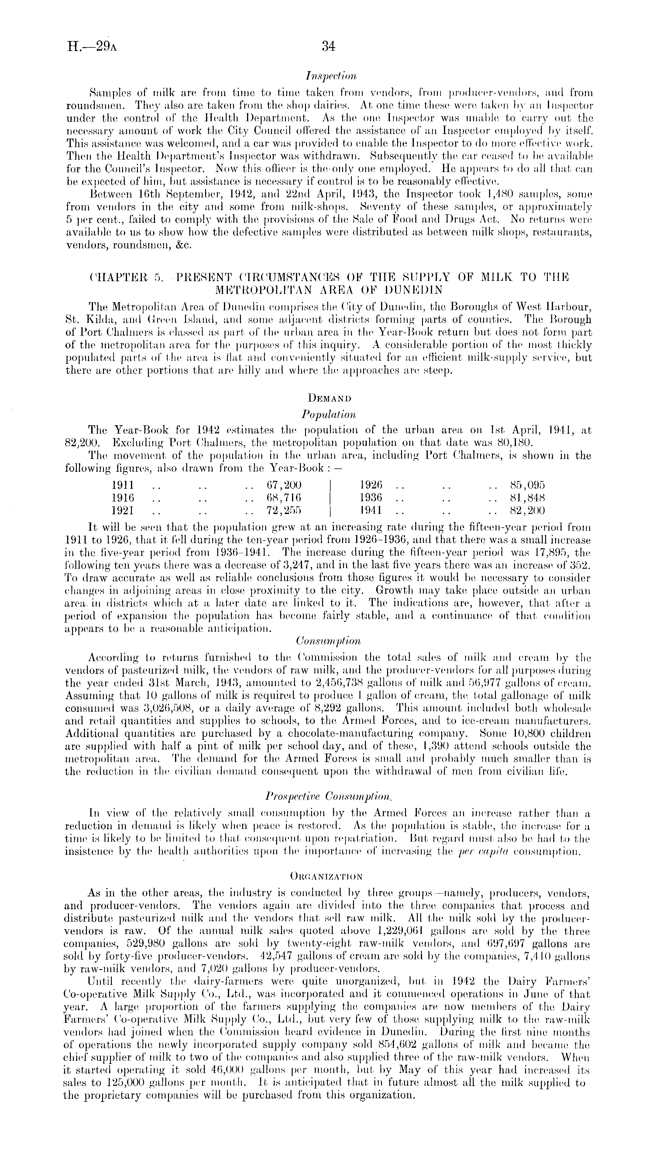Inspection Samples of milk are from time to time taken from vendors, from producer-vendors, and from roundsmen. They also are taken from the shop dairies. At one time these were taken by an Inspector under the control of the Health Department. As the one Inspector was unable to carry out the necessary amount of work the City Council offered the assistance of ail Inspector employed by itself. This assistance was welcomed, and a car was provided to enable the Inspector to do more effective work. Then the Health Department's Inspector was withdrawn. Subsequently the car ceased to be available for the Council's Inspector. Now this officer is the-only one employed. He appears to do all that can be expected of him, but assistance is necessary if control is to be reasonably effective. Between 16th September, 1942, and 22nd April, 1943, the Inspector took 1,480 samples, some from vendors in the city and some from milk-shops. Seventy of these samples, or approximately 5 per cent., failed to comply with the provisions of the Sale of Food and Drugs Act. No returns were available to us to show how the defective samples were distributed as between milk shops, restaurants, vendors, roundsmen, &c. CHAPTER S.—PRESENT CIRCUMSTANCES OF THE SUPPLY OF MILK TO THE METROPOLITAN AREA OF DUNEDIN The Metropolitan Area of Dunedin comprises the City of Dunedin, the Boroughs of West Harbour, St. Kilda, and Green Island, and some adjacent districts forming parts of counties. The Borough of Port Chalmers is classed as part of the urban area in the Year-fiook return but does not form part of the metropolitan area for the purposes of this inquiry. A considerable portion of the most thickly populated parts of the area is flat and conveniently situated for an efficient milk-supply service, but there are other portions that are hilly and where the approaches are steep. Demand Population The Year-Book for 1942 estimates the population of the urban area on Ist April, 1941, at 82,200. Excluding Port Chalmers, the metropolitan population on that date was 80,180. The movement of the population in the urban area, including Port Chalmers, is shown in the following figures, also drawn from the Year-Book : — 1911 .. .. .. 67,200 1926 .. .. .. 85,095 1916 .. .. .. 68,716 1936 .. .. .. 81,848 1921 .. .. .. 72,255 .1941 .. .. .. 82,200 It will be seen that the population grew at an increasing rate during the fifteen-year period from 1911 to 1926, that it fell during the ten-year period from 1926-1936, and that there was a small increase in the five-year period from 1936-1941. The increase during the fifteen-year period was 17,895, the following ten years there was a decrease of 3,247, and in the last five years there was an increase of 352. To draw accurate as well as reliable conclusions from those figures it would be necessary to consider changes in adjoining areas in close proximity to the city. Growth may take place outside an urban area, in districts which at a later date are linked to it. The indications are, however, that after a period of expansion the population has become fairly stable, and a continuance of that condition appears to be a reasonable anticipation. Consumption According to returns furnished to the Commission the total sales of milk and cream by the vendors of pasteurized milk, the vendors of raw milk, and the producer-vendors for all purposes during the year ended 31st March, 1943, amounted to 2,456,738 gallons of milk and 56,977 gallons of cream. Assuming that 10 gallons of milk is required to produce 1 gallon of cream, the total gallonage of milk consumed was 3,026,508, or a daily average of 8,292 gallons. This amount included both wholesale and retail quantities and supplies to schools, to the Armed Forces, and to ice-cream manufacturers. Additional quantities are purchased by a chocolate-manufacturing company. Some 10,800 children are supplied with half a pint of milk per school day, and of these, 1,390 attend schools outside the metropolitan area. The demand for the Armed Forces is small and probably much smaller than is the reduction in the civilian demand consequent upon the withdrawal of men from civilian life. Prospective Consumption. In view of the relatively small consumption by the Armed Forces an increase rather than a reduction in demand is likely when peace is restored. As the population is stable, the increase for a time is likely to be limited to that consequent upon repatriation. But regard must also be had to the insistence by the health authorities upon the importance of increasing the per capita consumption. Organization As in the other areas, the industry is conducted by three groups —namely, producers, vendors, and producer-vendors. The vendors again are divided into the three companies that process and distribute pasteurized milk and the vendors that sell raw milk. All the milk sold by the producervendors is raw. Of the annual milk sales quoted above 1,229,061 gallons are sold by the three companies, 529,980 gallons are sold by twenty-eight raw-milk vendors, and 697,697 gallons are sold by forty-five producer-vendors. 42,547 gallons of cream are sold by the companies, 7,410 gallons by raw-milk vendors, and 7,020 gallons by producer-vendors. Until recently the dairy-farmers were quite unorganized, but in 1942 the Dairy Farmers' Co-operative Milk Supply Co., Ltd., was incorporated and it commenced operations in June of that year. A large proportion of the farmers supplying the companies are now members of the Dairy Farmers' Co-operative Milk Supply Co., Ltd., but very few of those supplying milk to the raw-milk vendors had joined when the Commission heard evidence in Dunedin. During the first nine months of operations the newly incorporated supply company sold 854,602 gallons of milk and becamc the chief supplier of milk to two of the companies and also supplied three of the raw-milk vendors. When it started operating it sold 46,000 gallons per month, but by May of this year had inc