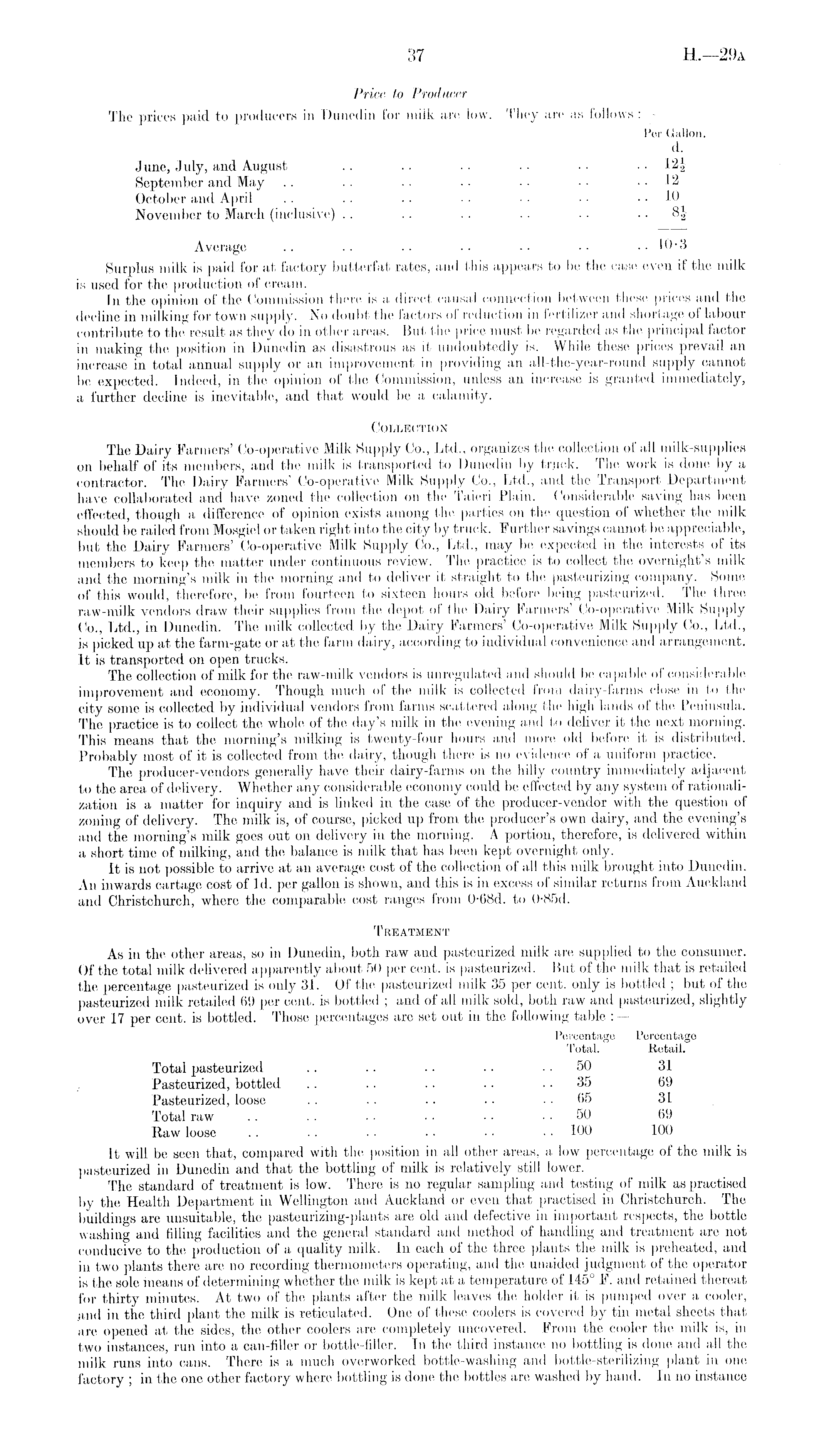 Price to Producer The prices paid to producers in Dunedin for milk are low. They are as follows Per Gallon. d. June, July, and August .. .. .. . ■ ■ • . • 12£ September and May .. .. .. ■ • • • • • .. 12 October and April .. .. .. • • • • • • .. •10 November to March (inclusive) .. .. .. .. • • .. 8| Average .. .. .. ■ • • • • • .. 10 • 3 Surplus milk is paid for at factory butterfat rates, and this appears to be the case even if the milk is used for the production of cream. In the opinion of the Commission there is a direct causal connection between these prices and the decline in milking for town supply. No doubt the factors of reduction in fertilizer and shortage of labour contribute to the result as they do in other areas, But the price must be regarded as the principal factor in making the position in Dunedin as disastrous as it undoubtedly is. While these prices prevail an increase in total annual supply or an improvement in providing an all-the-year-round supply cannot be expected. Indeed, in the opinion of the Commission, unless an increase is granted immediately, a further decline is inevitable, and that would be a calamity. Collection The Dairy Farmers' Co-operative Milk Supply Co., Ltd., organizes the collection of all milk-supplies on behalf of its members, and the milk is transported to Dunedin by truck. The work is done by a contractor. The Dairy Farmers' Co-operative Milk Supply Co., Ltd., and the Transport Department have collaborated and have zoned the collection on the Taieri Plain. Considerable saving has been effected, though a difference of opinion exists among the parties on the question of whether the milk should be railed from Mosgiel or taken right into the city by truck. Further savings cannot be appreciable, but the Dairy Farmers' Co-operative Milk Supply Co., Ltd., may bo expected in the interests of its members to keep the matter under continuous review. The practice is to collect the overnight's milk and the morning's milk in the morning and to deliver it straight to the pasteurizing company. Some of this would, therefore, be from fourteen to sixteen hours old. before being pasteurized. The three raw-milk vendors draw their supplies from the depot of the Dairy Farmers' Co-operative Milk Supply Co., Ltd., in Dunedin. The milk collected by the Dairy Farmers' Co-operative Milk Supply Co., Ltd., is picked up at the farm-gate or at the farm dairy, according to individual convenience and arrangement. It is transported on open trucks. The collection of milk for the raw-milk vendors is unregulated and should be capable of considerable improvement and economy. Though much of the milk is collected from dairy-farms close in to the city some is collected by individual vendors from farms scattered along the high lands of the Peninsula. The practice is to collect the whole of the day's milk in the evening and to deliver it the next morning. This means that the morning's milking is twenty-four hours and more old before it is distributed. Probably most of it is collected from the dairy, though there is no evidence of a uniform practice. The producer-vendors generally have their dairy-farms on the hilly country immediately adjacent to the area of delivery. Whether any considerable economy could be effected by any system of rationalization is a matter for inquiry and is linked in the case of the producer-vendor with the question of zoning of delivery. The milk is, of course, picked up from the producer's own dairy, and the evening's and the morning's milk goes out on delivery in the morning. A portion, therefore, is delivered within a short time of milking, and the balance is milk that has been kept overnight only. It is not possible to arrive at an average cost of the collection of all this milk brought iuto Dunedin. An inwards cartage cost of Id. per gallon is shown, and this is in excess of similar returns from Auckland and Christchurch, where the comparable cost ranges from 0-68 d. to 0-85 d. Treatment As in the other areas, so in Dunedin, both raw and pasteurized milk are supplied to the consumer. Of the total milk delivered apparently about 50 per cent, is pasteurized. But of the milk that is retailed the percentage pasteurized is only 31. Of the pasteurized milk 35 per cent, only is bottled ; but of the pasteurized milk retailed 69 per cent, is bottled ; and of all milk sold, both raw and pasteurized, slightly over 17 per cent, is bottled. Those percentages are set out in the following table : — Percentage Percentage Total. Retail. Total pasteurized .. .. .. .. 50 31 Pasteurized, bottled .. .. .. •. 35 69 Pasteurized, loose .. .. .. • • 65 31 Total raw .. .. . • • • 50 69 Raw loose . . . . .. ■ ■ • • ■ • 100 100 It will be seen that, compared with the position in all other areas, a low percentage of the milk is pasteurized in Dunedin and that the bottling of milk is relatively still lower. The standard of treatment is low. There is no regular sampling and testing of milk as practised by the Health Department in Wellington and Auckland or even that practised in Christchurch. The buildings are unsuitable, the pasteurizing-plants are old and defective in important respects, the bottle washing and filling facilities and the general standard and method of handling and treatment are not conducive to the production of a quality milk. In each of the three plants the milk is preheated, and in two plants there are no recording thermometers operating, and the unaided judgment of the operator is the sole means of determining whether the milk is kept at a temperature of 145° F. and retained thereat for thirty minutes. At two of the plants after the milk leaves the holder it is pumped over a cooler, .and in the third plant the milk is reticulated. One of these coolers is covered by tin metal sheets that are opened at the sides, the other coolers are completely uncovered. From the cooler the milk is, in t