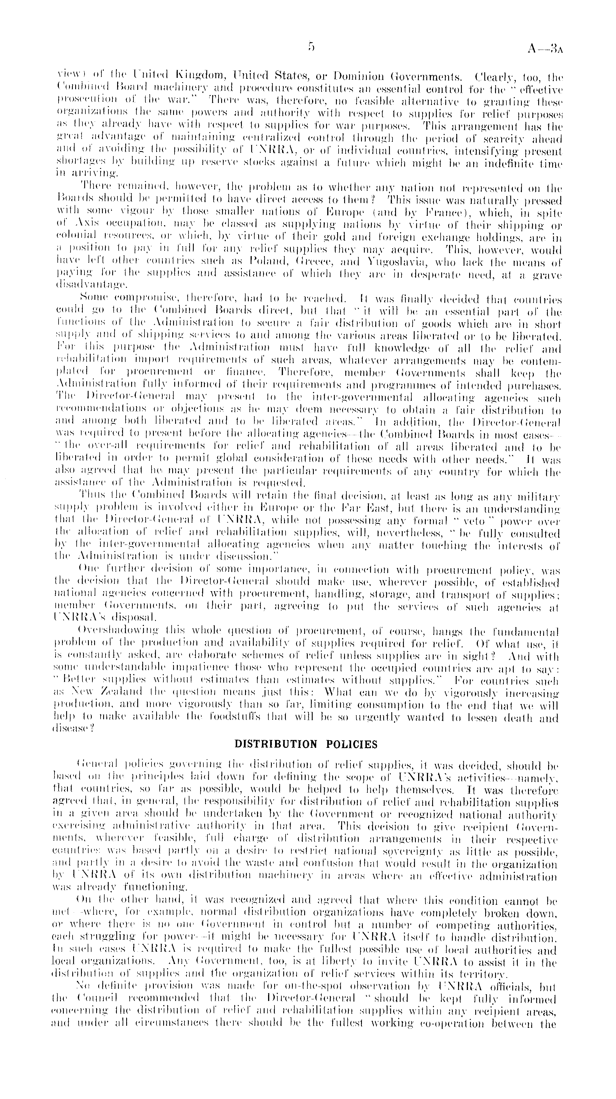 view) of the United Kingdom, United States, or Dominion Governments. Clearly, too, the Combined Board machinery and procedure constitutes an essential control for the " effective prosecution of the war." There was, therefore, no feasible alternative to granting these organizations the same powers and authority witii respect to supplies for relief purposes as they already have with respect to supplies for war purposes. This arrangement has the great advantage of maintaining centralized control through the period of scarcity ahead and of avoiding the possibility of UNRRA, or of individual countries, intensifying present shortages by building up reserve stocks against a future which might be an indefinite time in arriving. There remained, however, the problem as to whether any nation not represented on the Boards should be permitted to have direct access to them? This issue was naturally pressed with some vigour by those smaller nations of Europe (and by France), which, in spite of Axis occupation, may be classed as supplying nations by virtue of their shipping or colonial resources, or which, by virtue of their gold and foreign exchange holdings, are in a position to pay in full for any relief supplies they may acquire. This, however, would have left other countries such as Poland, Greece, and Yugoslavia, who lack the means of paying for the supplies and assistance of which they are in desperate need, at a grave disadvantage. Some compromise, therefore, had to be reached. It was finally decided that countries could go to the Combined Boards direct, but that " it will be an essential part of the functions of the Administration to secure a fair distribution of goods which are in short supply and of shipping services to and among the various areas liberated or to be liberated. For this purpose the Administration must have full knowledge of all the relief and rehabilitation import requirements of such areas, whatever arrangements may be contemplated for procurement or finance. Therefore, member Governments shall keep the Administration fully informed of their requirements and programmes of intended purchases. The Director-General may present to the inter-governmental allocating agencies such recommendations or objections as he may deem necessary to obtain a fair distribution to and among both liberated and to be liberated areas." In addition, the Director-General was required to present before the allocating agencies—the Combined Boards in most cases— ''the over-all requirements for relief and rehabilitation of all areas liberated and to be liberated in order to permit global consideration of these needs with other needs." It was also agreed that he may present the particular requirements of any country for which the assistance of the Administration is requested. Thus the Combined Boards will retain the final decision, at least as long as any military supply problem is involved either in Europe or the Far East, but there is an understanding that the Director-General of UNRRA, while not possessing any formal " veto " power over the allocation of relief and rehabilitation supplies, will, nevertheless, " be fully consulted by the inter-governmental allocating agencies when any matter touching the interests of the Administration is under discussion." One further decision of some importance, in connection with procurement policy, was the decision that the Director-General should make use, wherever possible, of established national agencies concerned with procurement, handling, storage, and transport of supplies; member Governments, on their part, agreeing to put the services of such agencies at UNRRA's disposal. Overshadowing this whole question of procurement, of course, hangs the fundamental problem of the production and availability of supplies required for relief. Of what use, it is constantly asked, are elaborate schemes of relief unless supplies are in sight? And with some understandable impatience those who represent the occupied countries are apt to say: "Better supplies without estimates than estimates without supplies." For countries such as New Zealand the question means just this: What can we do by vigorously increasing production, and more vigorously than so far, limiting consumption to the end that we will help to make available the foodstuffs that will be so urgently wanted to lessen death and disease? DISTRIBUTION POLICIES General policies governing the distribution of relief supplies, it was decided, should be based on the principles laid down for defining the scope of UNRRA's activities—namely, that countries, so far as possible, would be helped to help themselves. It was therefore agreed that, in general, the responsibility for distribution of relief and rehabilitation supplies in a given area should be undertaken by the Government or recognized national authority exercising administrative authority in that area. This decision to give recipient Governments, wherever feasible, full charge of distribution arrangements in their respective countries was based partly on a desire to restrict national sovereignty as little as possible, and partly in a desire to avoid the waste and confusion that would result in the organization by UNRRA of its own distribution machinery in areas where an effective administration was already functioning. On the other hand, it was recognized and agreed that where this condition cannot be met—-where, for example, normal distribution organizations have completely broken down, or where there is no one Government in control but a number of competing authorities, each struggling for power—it might be necessary for UNRRA itself 1o handle distribution. In such eases UNRRA is required to make the fullest possible use of local authorities and local organizations. Any Government, too, is at liberty to invite UNRRA to assist it in the distribution of supplies and the organization of relief services within its territory. No definite provision was made for o