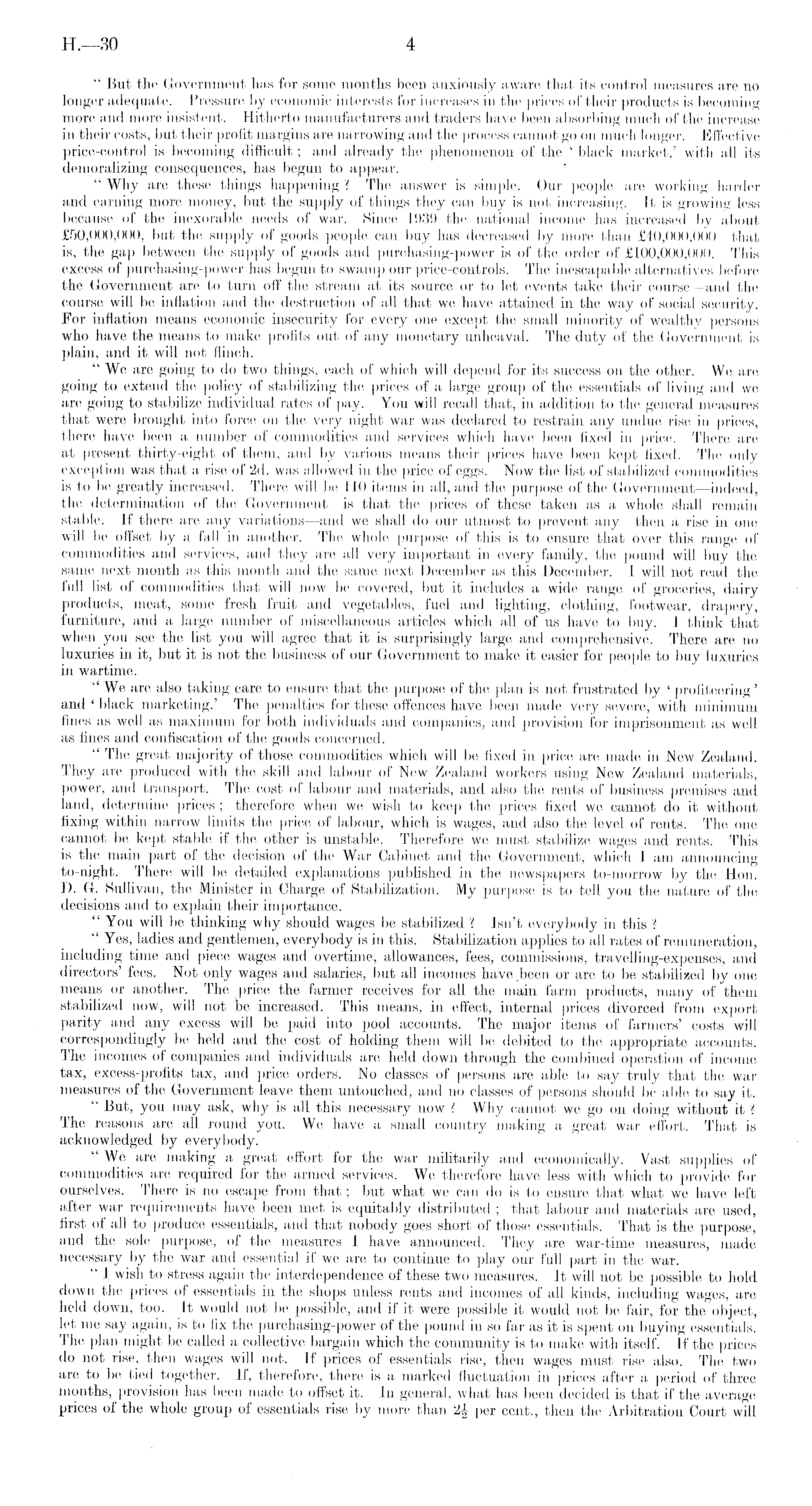 " But the Government has for some months been anxiously aware that its control measures are no longer adequate. Pressure by economic interests for increases in the prices of their products is becoming more and more insistent. Hitherto manufacturers and traders have been absorbing much of the increase in their costs, but their profit margins are narrowing and the process cannot go on much longer. Effective price-control is becoming difficult; and already the phenomenon of the ' black market,' with all its demoralizing consequences, has begun to appear. " Why are these things happening ? The answer is simple. Our people are working harder and earning more money, but the supply of things they can buy is not increasing. It is growing less because of the inexorable needs of war. Since 1939 the national income has increased by about £50,000,000, but the supply of goods people can buy has decreased by more than £40,000,000 —that is, the gap between the supply of goods and purchasing-power is of the order of £100,000,000. This excess of purchasing-power has begun to swamp our price-controls. The inescapable alternatives before the Government are to turn off the stream at its source or to let events take their course—and the course will be inflation and the destruction of all that we have attained in the way of social security. For inflation means economic insecurity for every one except the small minority of wealthy persons who have the means to make profits out of any monetary unheaval. The duty of the Government is plain, and it will not flinch. "We are going to do two things, each of which will depend for its success on the other. We are going to extend the policy of stabilizing the prices of a large group of the essentials of living and we are going to stabilize individual rates of pay. You will recall that, in addition to the general measures that were brought into force on the very night war was declared to restrain any undue rise in prices, there have been a number of commodities and services which have been fixed in price. There are at present thirty-eight of them, and by various means their prices have been kept fixed. The only exception was that a rise of 2d. was allowed in the price of eggs. Now the list of stabilized commodities is to be greatly increased. There will be ilO items in all, and the purpose of the Government—-indeed, the determination of the Government—is that the prices of these taken as a whole shall remain stable. If there are any variations—and we shall do our utmost to prevent any then a rise in one will be offset by a fall in another. The whole purpose of this is to ensure that over this range of commodities and services, and they are all very important in every family, the pound will buy the same next month as this month and the same next December as this December. I will not read the full list of commodities that will now be covered, but it includes a wide range of groceries, dairy products, meat, some fresh fruit and vegetables, fuel and lighting, clothing, footwear, drapery, furniture, and a large number of miscellaneous articles which all of us have to buy. 1 think that when you see the list you will agree that it is. surprisingly large and comprehensive. There are no luxuries in it, but it is not the business of our Government to make it easier for people to buy luxuries in wartime. "We are also taking care to ensure that the purpose of the plan is not frustrated by ' profiteering ' and ' black marketing.' The penalties for these offences have been made very severe, with minimum fines as well as maximum for both individuals and companies, and provision for imprisonment as well as fines and confiscation of the goods concerned. " The great majority of those commodities which will be fixed in price are made in Now Zealand. They are produced with the skill and labour of New Zealand workers using New Zealand materials, power, and transport. The cost of labour and materials, and also the rents of business premises and land, determine prices ; therefore when we wish to keep the prices fixed we cannot do it without fixing withiti narrow limits the price of labour, which is wages, and also the level of rents. The one cannot be kept stable if the other is unstable. Therefore we must stabilize wages and rents. This is the main part of the decision of the War Cabinet and the Government, which I am announcing to-night. There will be detailed explanations published in the newspapers to-morrow by the Hon. D. G. Sullivan, the Minister in Charge of Stabilization. My purpose is to tell you the nature of the decisions and to explain their importance. " You will be thinking why should wages be stabilized ? Isn't everybody in this ? " Yes, ladies and gentlemen, everybody is in this. Stabilization applies to all rates of remuneration, including time and piece wages and overtime, allowances, fees, commissions, travelling-expenses, and directors' fees. Not only wages and salaries, but all incomes have been or are to be stabilised by one means or another. The price the farmer receives for all the main farm products, many of them stabilized now, will not be increased. This means, in effect, internal prices divorced from export parity and any excess will be paid into pool accounts. The major items of farmers' costs will correspondingly be held and the cost of holding them will be debited to the appropriate accounts. The incomes of companies and individuals are held down through the combined operation of income tax, excess-profits tax, and price orders. No classes of persons are able to say truly that the war measures of the Government leave them untouched, and no classes of persons should be able to say it. " But, you may ask, why is all this necessary now ? Why cannot we go on doing without it '( The reasons are all round you. We have a small country making a great war effort. That is acknowledged by everybody. "We are making a great effort for the war militarily and econ