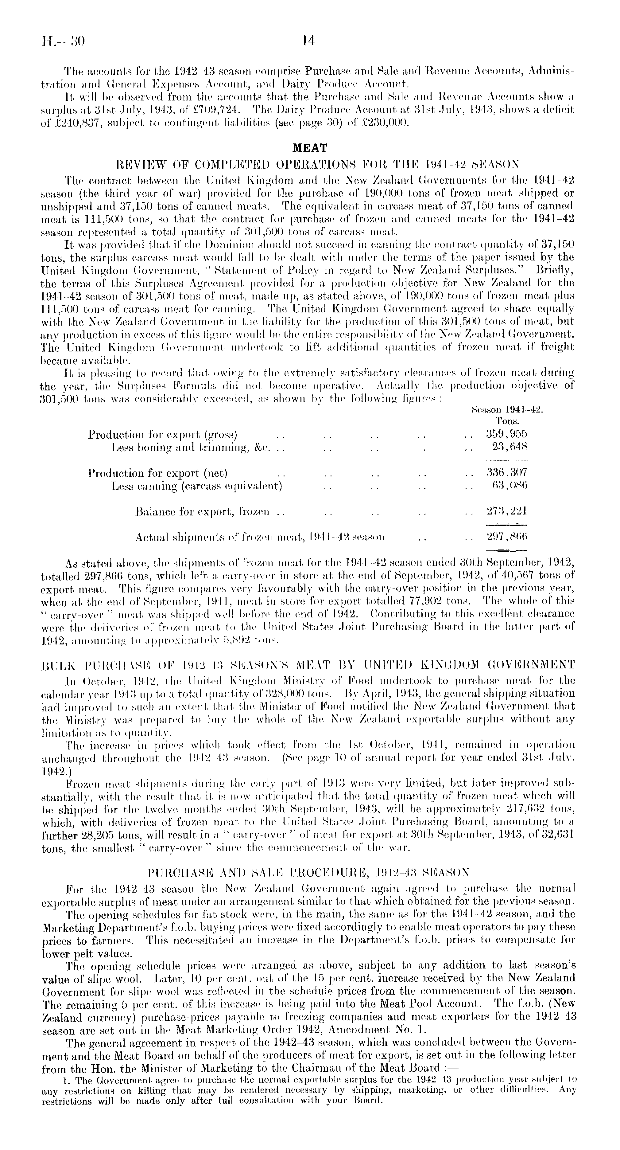 The accounts for the 1942-43 season comprise Purchase and Sale and Revenue Accounts, Administration and General Expenses Account, and Dairy Produce Account. It will be observed from the accounts that the Purchase and Sale and Revenue Accounts show a surplus at 31st July, 1943, of £709,724. The Dairy Produce Account at 31st July, 1943, shows a deficit of £240,837, subject to contingent liabilities (see page 30) of £230,000. MEAT REVIEW OF COMPLETED OPERATIONS FOR THE 1941-42 SEASON The contract between the United Kingdom and the New Zealand Governments for the 1941-42 season (the third year of war) provided for the purchase of 190,000 tons of frozen meat shipped or unshipped and 37,150 tons of canned meats. The equivalent in carcass meat of 37,150 tons of canned meat is 111,500 tons, so that the contract for purchase of frozen and canned meats for the 1941-42 season represented a total quantity of 301,500 tons of carcass meat. It was provided that if the Dominion should not succeed in canning the contract quantity of 37,150 tons, the surplus carcass meat would fall to be dealt with under the terms of the paper issued by the United Kingdom Government, " Statement of Policy in regard to New Zealand Surpluses." Briefly, the terms of this Surpluses Agreement provided for a production objective for New Zealand for the 1941-42 season of 301,500 tons of meat, made up, as stated above, of 190,000 tons of frozen meat plus 111,500 tons of carcass meat for canning. The United Kingdom Government agreed to share equally with the New Zealand Government in the liability for the production of this 301,500 tons of meat, but any production in excess of this figure would be the entire responsibility of the New Zealand Government. The United Kingdom Government undertook to lift additional quantities of frozen meat if freight became available. It is pleasing to record that owing to the extremely satisfactory clearances of frozen meat during the year, the Surpluses Formula did not become operative. Actually the production objective of 301,500 tons was considerably exceeded, as shown by the following figures Season 1941-42. Tons. Production for export (gross) .. .. .. .. .. 359,955 Less boning and trimming, &c. .. .. .. .. .. 23,648 Production for export (net) .. .. .. .. .. 336,307 Less canning (carcass equivalent) .. .. . . .. 63,086 Balance for export, frozen .. .. .. .. .. 273,221 Actual shipments of frozen meat, 1941-42 season .. .. 297,866 As stated above, the shipments of frozen meat for the 1941-42 season ended 30th September, 1942, totalled 297,866 tons, which left a carry-over in store at the end of September, 1942, of 40,567 tons of export meat. This figure compares very favourably with the carry-over position in the previous year, when at the end of September, 1941, meat in store for export totalled 77,902 tons. The whole of this " carry-over " meat was shipped well before the end of 1942. Contributing to this excellent clearance were the deliveries "of frozen meat to the United States Joint Purchasing Board in the latter part of 1942, amounting to approximately 5,892 tons. BULK PURCHASE OF 1942 43 SEASON'S MEAT BY UNITED KINGDOM GOVERNMENT In October, 1942, the United Kingdom Ministry of Food undertook to purchase meat for the calendar year 1943 up to a total quantity of 328,000 tons. By April, 1943, the general shipping situation had improved to such an extent that the Minister of Food notified the New Zealand Government that the Ministry was prepared to buy the whole of the New Zealand exportable surplus without any limitation as to quantity. The increase in prices which took effect from the Ist October, 1941, remained in operation unchanged throughout the 1942-43 season. (See page 10 of annual report for year ended 31st July, 1942.) Frozen meat shipments during the early part of 1943 were very limited, but later improved substantially, with the result that it is now anticipated that the total quantity of frozen meat which will be shipped for the twelve months ended 30th September, 1943, will be approximately 217,632 tons, which, with deliveries of frozen meat to the United States Joint Purchasing Board, amounting to a further 28,205 tons, will result in a " carry-over " of meat for export at 30th September, 1943, of 32,631 tons, the smallest " carry-over " since the commencement of the war. PURCHASE AND SALE PROCEDURE, 1942-43 SEASON For the 1942-43 season the New Zealand Government again agreed to purchase the normal exportable surplus of meat under an arrangement similar to that which obtained for the previous season. The opening schedules for fat stock were, in the main, the same as for the 1941-42 season, and the Marketing Department's f.o.b. buying prices were fixed accordingly to enable meat operators to pay these prices to farmers. This necessitated an increase in the Department's f.o.b. prices to compensate for lower pelt values. The opening schedule prices were arranged as above, subject to any addition to last season's value of slipe wool. Later, 10 per cent, out of the 15 per cent, increase received by the New Zealand Government for slipe wool was reflected in the schedule prices from the commencement of the season. The remaining 5 per cent, of this increase is being paid into the Meat Pool Account. The f.o.b. (New Zealand currency) purchase-prices payable to freezing companies and meat exporters for the 1942-43 season are set out in the Meat Marketing Order 1942, Amendment No. 1. The general agreement in respect of the 1942-43 season, which was concluded between the Government and the Meat Board on behalf of the producers of meat for export, is set out in the following letter from the Hon. the Minister of Marketing to the Chairman of the Meat Board :— 1. The Government agree to purchase the normal exportable surplus for the 1942-43 production year subject to any restrictions on killing that may be rendered necessary by shipping, marketing, or other difficulties. Any restrictions