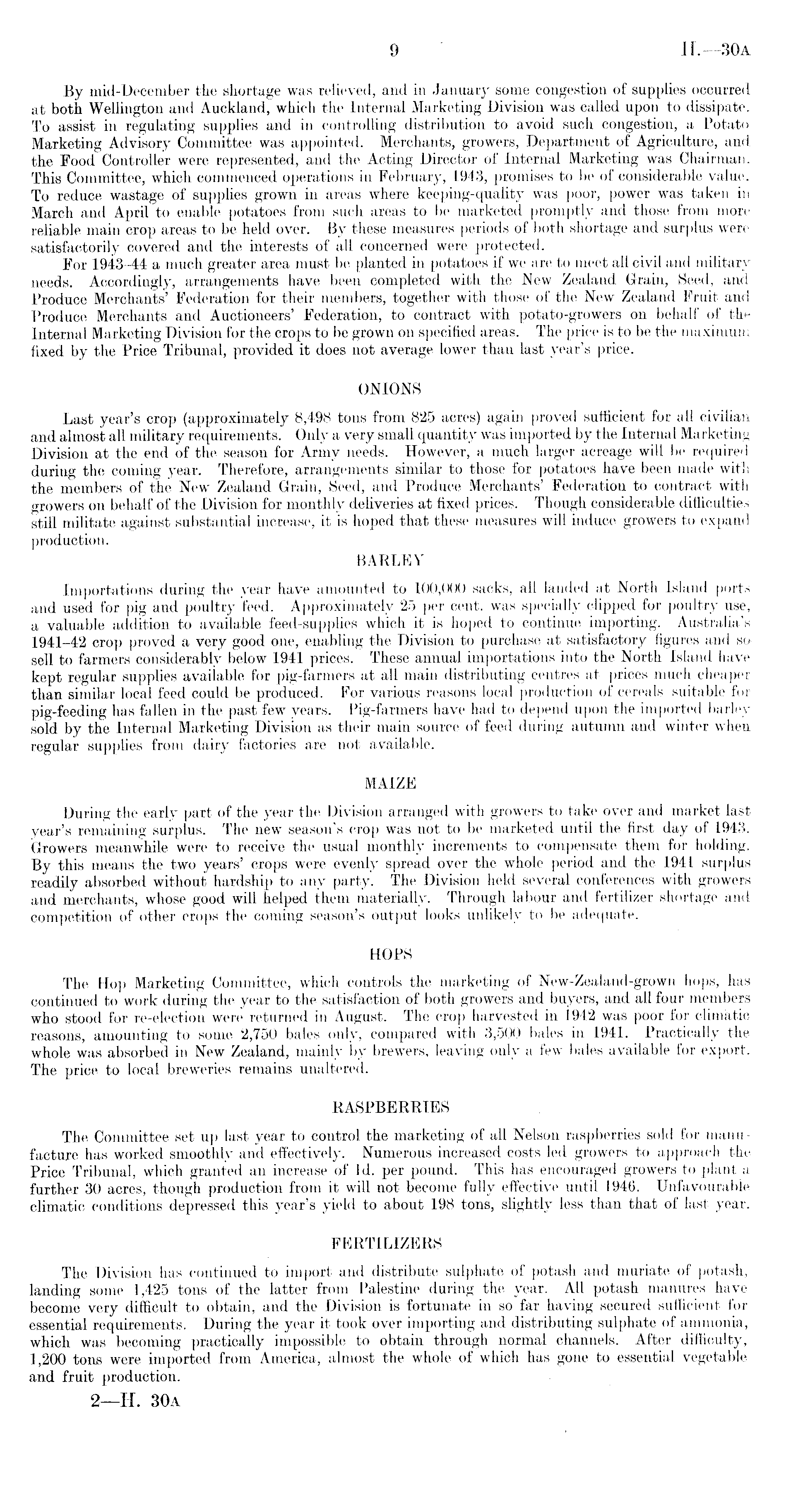 By mid-December the shortage was relieved, and in January some congestion of supplies occurred at both Wellington and Auckland, which the Internal Marketing Division was called upon to dissipate. To assist in regulating supplies and in controlling distribution to avoid such congestion, a Potato Marketing Advisory Committee was appointed. Merchants, growers, Department of Agriculture, and the Food Controller were represented, and the Acting Director of,lnternal Marketing was Chairman. This Committee, which commenced operations in February, 1943, promises to be of considerable value. To reduce wastage of supplies grown in areas where keeping-quality was poor, power was taken in March and April to enable potatoes from such areas to be marketed promptly and those from more reliable main crop areas to be held over. By these measures periods of both shortage and surplus were satisfactorily covered and the interests of all concerned were protected. For 1943-44 a much greater area must be planted in potatoes if we are to meet all civil and military needs. Accordingly, arrangements have beeii completed with the New Zealand Grain, Seed, and Produce Merchants' Federation for their members, together with those of the New Zealand Fruit and Produce Merchants and Auctioneers' Federation, to contract with potato-growers on behalf of the Internal Marketing Division for the crops to be grown oil specified areas. The price is to be the maximum fixed by the Price Tribunal, provided it does not average lower than last year's price. ONIONS Last year's crop (approximately 8,498 tons from 825 acres) again proved sufficient for all civilian and almost all military requirements. Only a very small quantity was imported by the Internal Marketing Division at the end of the season for Army needs. However, a much larger acreage will be required during the coming year. Therefore, arrangements similar to those for potatoes have been made witli the members of the New Zealand Grain, Seed, and Produce Merchants' Federation to contract with growers on behalf of the Division for monthly deliveries at fixed prices. Though considerable difficulties still militate against substantial increase, it is hoped that these measures will induce growers to expand production. BARLEY Importations during the year have amounted to 100,000 sacks, all landed at North Island ports and used for pig and poultry feed. Approximately 25 per cent, was specially clipped for poultry use, a valuable addition to available feed-supplies which it is hoped to continue importing. Australia's 1941-42 crop proved a very good one, enabling the Division to purchase at satisfactory figures and so sell to farmers considerably below 1941 prices. These annual importations into the North Island have kept regular supplies available for pig-farmers at all main distributing centres at prices much cheaper than similar local feed could be produced. For various reasons local production of cereals suitable for pig-feeding has fallen in the past few years. Pig-farmers have had to depend upon the imported barley sold by the Internal Marketing Division as their main source of feed during autumn and winter when regular supplies from dairy factories are not available. MAIZE During the early part of the year the Division arranged with growers to take over and market last year's remaining surplus. The new season's crop was not to be marketed until the first day of 1943. Growers meanwhile were to receive the usual monthly increments to compensate them for holding. By this means the two years' crops were evenly spread over the whole period and the 1941 surplus readily absorbed without hardship to any party. The Division held several conferences with growers and merchants, whose good will helped them materially. Through labour and fertilizer shortage and competition of other crops the coming season's output looks unlikely to be adequate. HOPS The Hop Marketing Committee, which controls the marketing of New-Zealand-grown hops, has continued to work during the year to the satisfaction of both growers and buyers, and all four members who stood for re-election were returned in August. The crop harvested in 1942 was poor for climatic reasons, amounting to some 2,750 bales only, compared with 3,500 bales in 1941. Practically the whole was absorbed in New Zealand, mainly by brewers, leaving only a few bales available for export. The price to local breweries remains unaltered. RASPBERRIES The Committee set up last year to control the marketing of all Nelson raspberries sold for manufacture has worked smoothly and effectively. Numerous increased costs led growers to approach the Price Tribunal, which granted an increase of Id. per pound. This has encouraged growers to plant a further 30 acres, though production from it will not become fully effective until 1946. Unfavourable climatic conditions depressed this year's yield to about 198 tons, slightly less than that of last year. FERTILIZERS The Division has continued to import and distribute sulphate of potash and muriate of potash, landing some 1,425 tons of the latter from Palestine during the year. All potash manures have become very difficult to obtain, and the Division is fortunate in so far having secured sufficient for essential requirements. During the year it took over importing and distributing sulphate of ammonia, which was becoming practically impossible to obtain through normal channels. After difficulty, 1,200 tons were imported from America, almost the whole of which has gone to essential vegetable and fruit production.
