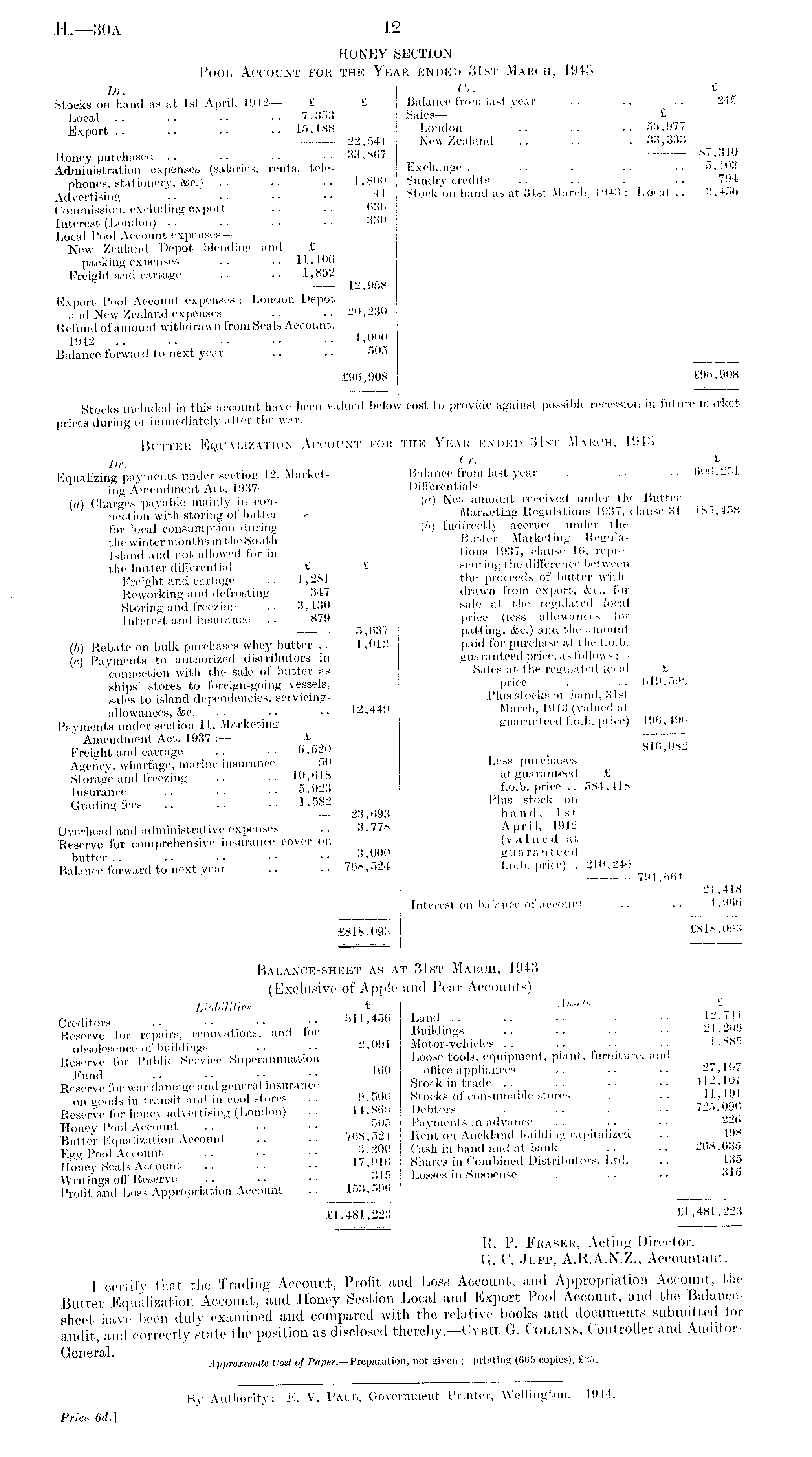 HONEY SECTION Pool Account for the Year ended 31st March, 1943 Dr. Or. £ Stoeks on hand as at Ist April, 1942— £ £ Balance from last year .. .. -. 245 Local . • ~ .. .. 7,353 Sales — £ Export .. .. •• •• 15,188 London .. .. .. 53,977 22,541 New Zealand .. .. .. 33,333 Honey purchased .. .. • • .. 33,807 87,310 Administration expenses (salaries, rents, tele- Exchange.. .. .. .. . ■ 5,11 M phones, stationery, &c.) .. .. •• 1,800 Sundry credits .. .. •• •• 794 Advertising .. •• •• •• 41 Stock on hand as at 31st March. 1943 : Local.. 3,45t> Commission, excluding export .. .. 636 Interest (London) .. .. • • • ■ 330 Local Pool Account expenses— New Zealand Depot blending and £ packing expenses .. 11,106 Freight and cartage .. .. 1,852 s 12,958 Export Pool Account expenses : London Depot and New Zealand expenses .. .. 20,230 Refund of amount withdrawn from Seals Account, 1942 .... .. •• •• 4 .000 Balance forward to next year .. .. 505 £96,908 £90,908 Stocks included in this account have been valued below cost to provide against possible recession in future market prices during or immediately alter the war. Butter Equalization Account for the Year ended 31st March, 1943 Dr. O. £ Equalizing payments under section 12, Market- Balance from last year .. .. . . 600,251 ing Amendment Act, 1937— Differentials— (а) Charles payable mainly in con- (a) Net amount received under the Butter nection with storing of butter r- Marketing Regulations 1937, clause 31 185,458 for local consumption during (?>) Indirectly accrued under the the winter months in the South Butter Marketing RegulaIsland and not allowed for in tions 1937, clause 10, reprethe butter differential— £ £ senting the difference between Freight and cartage ..1,281 the proceeds of butter withReworking and defrosting 347 drawn from export, &c., for Storing and freezing .. 3,130 sale at the regulated local Interest and insurance .. 879 price (less allowances for 5,637 patting, &c.) and the amount (б) Rebate on bulk purchases whey butter .. 1,012 paid for purchase at the f.o.b. (c) Payments to authorized distributors in guaranteed price, as follows: — connection with the sale of butter as Sales at the regulated local £^_ ships' stores to foreign-going vessels, price . . .. 619,592 sales to island dependencies, servicing- Plus stocks on hand, 31st allowances, &c 12,449 March, 1943 (valued at Payments under section 11, Marketing guaranteed f.o.b. price) 196,490 Amendment Act, 1937 :— £ Freight and cartage . . .. 5,520 Agency, wharfage, marine insurance 50 Less purchases Storage and freezing . . .. 10,018 at guaranteed £ Insurance .. .. •• 5,923 f.o.b price .. 584,418 Grading fees 1,582 Plus stock on 23,093 hand, Ist Overhead and administrative expenses .. 3,778 April, 1942 Reserve for comprehensive insurance cover on (valued at butter.. .. •• •• •• 3 ,000 guaranteed Balance forward to next year .. •• 708,524 i.o.b. price).. 210,246 21,418 Interest on balance of account .. .. 4,906 £818,093 £818,093 Balance-sheet as at 31st March, 1943 (Exclusive of Apple and Pear Accounts) Liabilities £ sse^s Creditors .. •• •• 511,450 Land .. .. .. •• •• \'l Reserve for repairs, renovations, and for Buildings .. .. .. •• 2 J'aur obsolesence of buildings .. 2,091 Motor-vehicles .. •• •• J ' BS5 Reserve for Public Service Superannuation Loose tools, equipment, plant, furniture, and Fund .. •• •• 160 office appliances 27, 97 Reserve for war damage and general insurance Stock in trade .. .. .. .. " on goods in transit and in cool stores .. 9,500 Stocks of consumable stores .. .. 11,191 Reserve for honey advertising (London) .. 14 Debtors . ,'' •• " " ',L Honey Pool Account 505 Payments m advance .. .. .. <"»> Butter Equalization Account .. •• 708,524 Rent on Auckland building capitalized .. 498 Vc, Pr.nl Account, .. •• 3,200 Cash m hand and at bank .. .. <.b8,635 Honey Seals Account 17,010 Shares in Combined Distributors, Ltd. .. 135 Writings off Reserve , 0 316 Losses m Suspense 315 Profit and Loss Appropriation Account .. 153,596 £1,481,223 £1,481,223 R. P. Fraser, Acting-Director. G. C. Jupp, A.R.A.N.Z., Accountant. I certify that the Trading Account, Profit and Loss Account, and Appropriation Account, the Butter Equalization Account, and Honey Section Local and Export Pool Account, and the Balancesheet have been duly examined and compared with the relative books and documents submitted for audit, and correctly state the position as disclosed thereby.—Cyrii. G. Collins, Controller and AuditorApproximate Cost of Paper.—Preparation, not given ; printing (065 copies), £25.