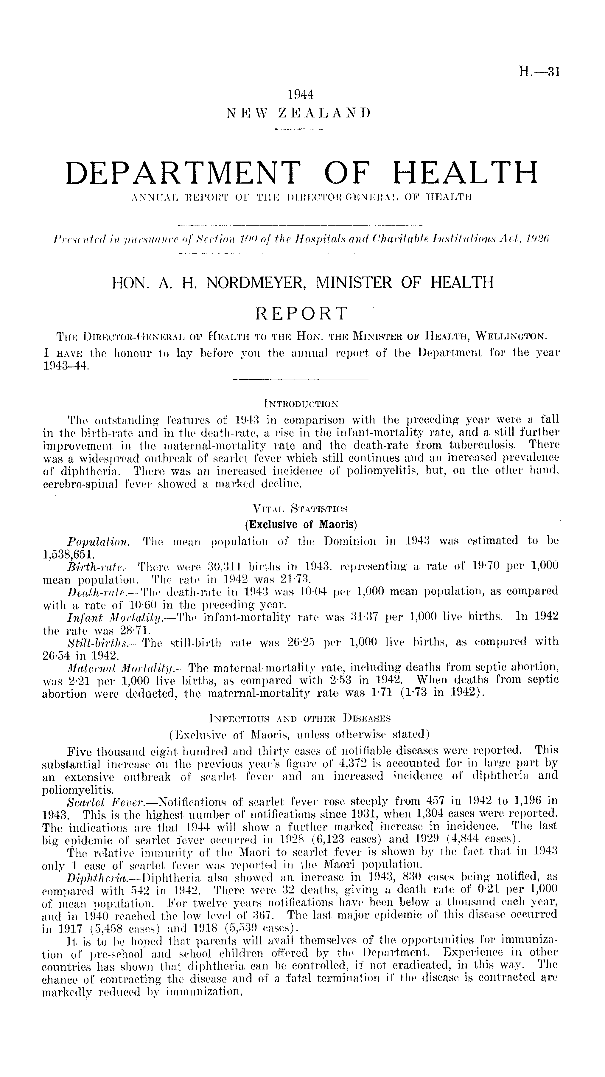 REPORT The Director-General of Health to the Hon. the Minister of Health, Wellington. I have the honour to lay before you the annual report of the Department for the year 1943-44.