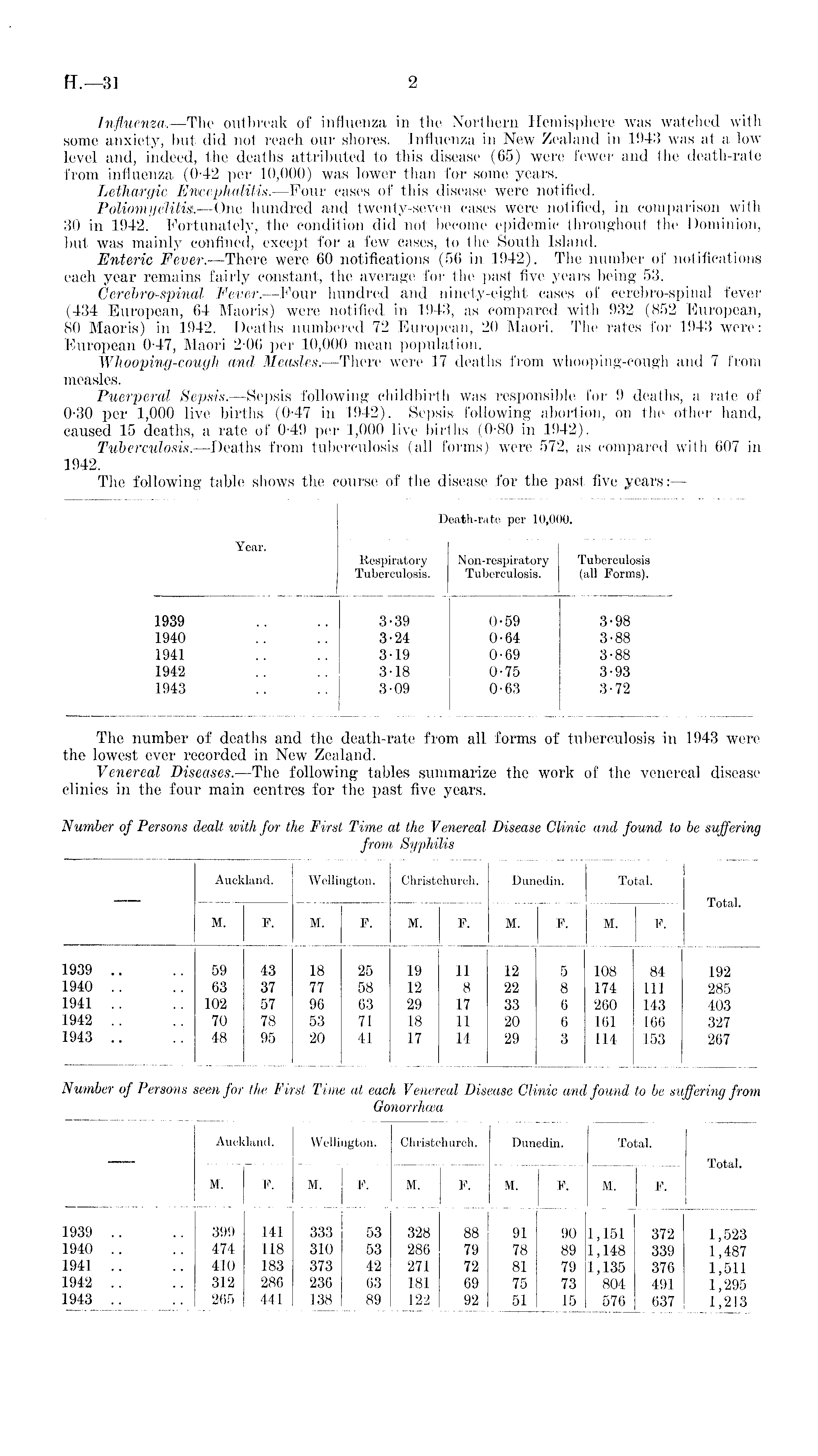The number of deaths and the death-rate from all forms of tuberculosis in 1943 were the lowest ever recorded in New Zealand. Venereal Diseases.—The following tables summarize the work of the venereal disease clinics in the four main centres for the past five years.