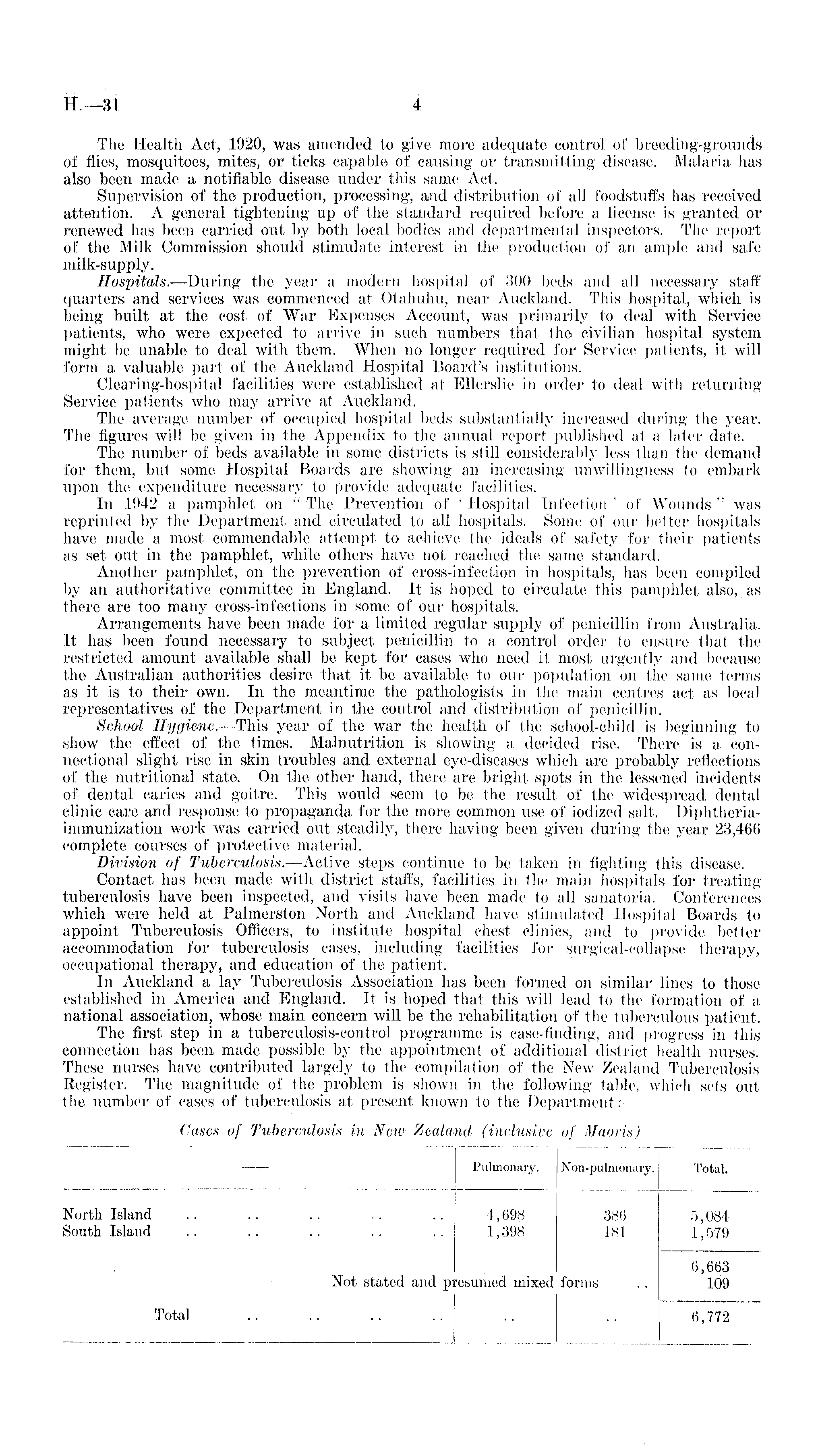 The Health Act, 1920, was amended to give more adequate control of breeding-grounds of flies, mosquitoes, mites, or ticks capable of causing or transmitting disease. Malaria has also been made a notifiable disease under this same Act. Supervision of the production, processing, and distribution of all foodstuffs has received attention. A general tightening up of the standard required before a license is granted or renewed has been carried out by both local bodies and departmental inspectors. The report of the Milk Commission should stimulate interest in the production of an ample and safe milk-supply. Hospitals.—During the year a modern hospital of 300 beds and all necessary staff quarters and services was commenced at Otahuhu, near Auckland. This hospital, which is being built at the cost of War Expenses Account, was primarily to deal with Service patients, who were expected to arrive in such numbers that the civilian hospital system might be unable to deal with them. When no longer required for Service patients, it will form a valuable part of the Auckland Hospital Board's institutions. Clearing-hospital facilities were established at Ellerslie in order to deal with returning Service patients who may arrive at Auckland. The average number of occupied hospital beds substantially increased during the year. The figures will be given in the Appendix to the annual report published at a later date. The number of beds available in some districts is still considerably less than the demand for them, but some Hospital Boards are showing an increasing unwillingness to embark upon the expenditure necessary to provide adequate facilities. In 1942 a pamphlet on " The Prevention of ' Hospital Infection ' of Wounds " was reprinted by the Department and circulated to all hospitals. Some of our better hospitals have made a most commendable attempt to achieve the ideals of safety for their patients as set out in the pamphlet, while others have not reached the same standard. Another pamphlet, on the prevention of cross-infection in hospitals, has been compiled by an authoritative committee in England. It is hoped to circulate this pamphlet also, as there are too many cross-infections in some of our hospitals. Arrangements have been made for a limited regular supply of penicillin from Australia. It has been found necessary to subject penicillin to a control order to ensure that the restricted amount available shall be kept for cases who need it most urgently and because the Australian authorities desire that it be available to our population on the same terms as it is to their own. In the meantime the pathologists in the main centres act as local representatives of the Department in the control and distribution of penicillin. School Hygiene.—This year of the war the health of the school-child is beginning to show the effect of the times. Malnutrition is showing a decided rise. There is a conneetional slight rise in skin troubles and external eye-diseases which are probably reflections of the nutritional state. On the other hand, there are bright spots in the lessened incidents of dental caries and goitre. This would seem to be the result of the widespread dental clinic care and response to propaganda for the mox*e common use of iodized salt. Diphtheriaimmunization work was carried out steadily, there having been given during the year 23,466 complete courses of protective material. Division of Tuberculosis. —Active steps continue to be taken in fighting this disease. Contact has been made with district staffs, facilities in the main hospitals for treating tuberculosis have been inspected, and visits have been made to all sanatoria. Conferences which were held at Palmerston North and Auckland have stimulated Hospital Boards to appoint Tuberculosis Officers, to institute hospital chest clinics, and to provide better accommodation for tuberculosis cases, including facilities for surgical-collapse therapy, occupational therapy, and education of the patient. In Auckland a lay Tuberculosis Association has been formed on similar lines to those established in America and England. It is hoped that this will lead to the formation of a national association, whose main concern will be the rehabilitation of the tuberculous patient. The first step in a tuberculosis-control programme is case-finding, and progress in this connection has been made possible by the appointment of additional district health nurses. These nurses have contributed largely to the compilation of the New Zealand Tuberculosis Register. The magnitude of the problem is shown in the following table, which sets out the number of cases of tuberculosis at present known to the Department:-—