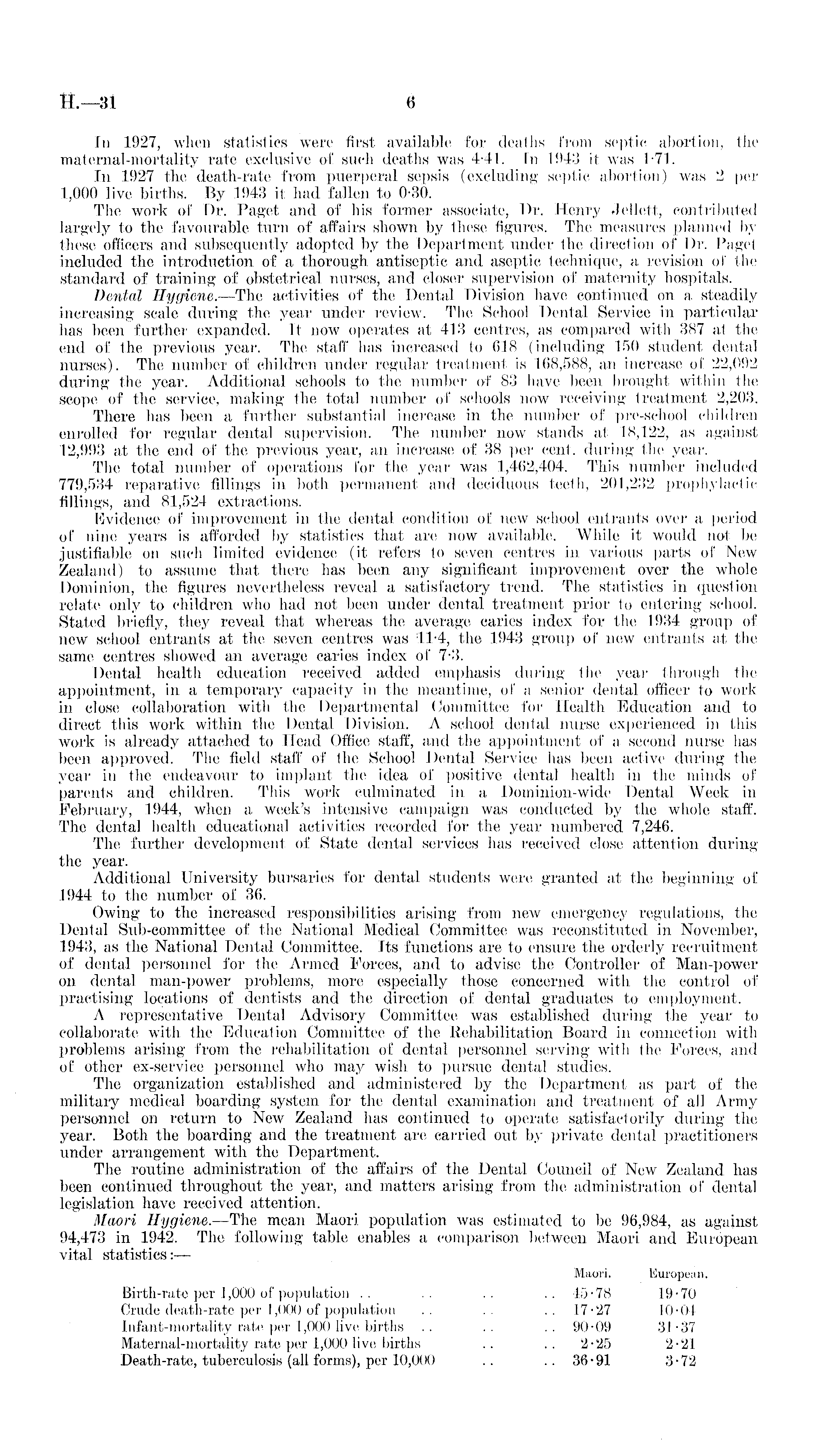 In 1927, when statistics were first available for deaths from septic abortion, the maternal-mortality rate exclusive of such deaths was 4-41. In 1943 it was 1-71. In 1927 the death-rate from puerperal sepsis (excluding septic abortion) was 2 per 1,000 live births. By 1943 it had fallen to 0-30. The work of Dr. Paget and of his former associate, Dr. Henry Jellett, contributed largely to the favourable turn of affairs shown by these figures. The measures planned by these officers and subsequently adopted by the Department under the direction of Dr. Paget included the introduction of a thorough antiseptic and aseptic technique, a revision of the standard of training of obstetrical nurses, and closer supervision of maternity hospitals. Dental Hygiene.—The activities of the Dental Division have continued on a steadily increasing scale during the year under review. The School Dental Service in particular has been further expanded. It now operates at 413 centres, as compared with 387 at the end of the previous year. The staff has increased to 618 (including 150 student dental nurses). The number of children under regular treatment is 168,588, an increase of 22,092 during the year. Additional schools to the number of 83 have been brought within the scope of the service, making the total number of schools now receiving treatment 2,203. There has been a further substantial increase in the number of pre-school children enrolled for regular dental supervision. The number now stands at 18,122, as against 12,993 at the end of the previous year, an increase of 38 per cent, during the year. The total number of operations for the year was 1,462,404. This number included 779,534 reparative fillings in both permanent and deciduous teeth, 201,232 prophylactic fillings, and 81,524 extractions. Evidence of improvement in the dental condition of new school entrants over a period of nine years is afforded by statistics that are now available. While it would not be justifiable on such limited evidence (it refers to seven centres in various parts of New Zealand) to assume that there has been any significant improvement over the whole Dominion, the figures nevertheless reveal a satisfactory trend. The statistics in question relate only to children who had not been under dental treatment prior to entering school. Stated briefly, they reveal that whereas the average caries index for the 1934 group of new school entrants at the seven centres was : 11-4, the 1943 group of new entrants at the same centres showed an average caries index of 7-3. Dental health education received added emphasis during the year through the appointment, in a temporary capacity in the meantime, of a senior dental officer to work in close collaboration with the Departmental Committee for Health Education and to direct this work within the Dental Division. A school dental nurse experienced in this work is already attached to Head Office staff, and the appointment of a second nurse lias been approved. The field staff of the School Dental Service has been active during the year in the endeavour to implant the idea of positive dental health in the minds of parents and children. This work culminated in a Dominion-wide Dental Week in February, 1944, when a- week's intensive campaign was conducted by the whole staff. The dental health educational activities recorded for the year numbered 7,246. The further development of State dental services has received close attention during the year. Additional University bursaries for dental students were granted at the beginning of 1944 to the number of 36. Owing to the increased responsibilities arising from new emergency regulations, the Dental Sub-committee of the National Medical Committee was reconstituted in November, 1943, as the National Dental Committee. Its functions are to ensure the orderly recruitment of dental personnel for the Armed Forces, and to advise the Controller of Man-power on dental man-power problems, more especially those concerned with the control of practising locations of dentists and the direction of dental graduates to employment. A representative Dental Advisory Committee was established during the year to collaborate with the Education Committee of the Rehabilitation Board in connection with problems arising from the rehabilitation of dental personnel serving with the Forces, and of other ex-service personnel who may wish to pursue dental studies. The organization established and administered by the Department as part of the military medical boarding system for the dental examination and treatment of all Army personnel on return to New Zealand has continued to operate satisfactorily during the year. Both the boarding and the treatment are carried out by private dental practitioners under arrangement with the Department. The routine administration of the affairs of the Dental Council of New Zealand has been continued throughout the year, and matters arising from the administration of dental legislation have received attention. Maori Hygiene.—The mean Maori population was estimated to be 96,984, as against 94,473 in 1942. The following table enables a comparison between Maori and European vital statistics:— Maori. European. Birth-rate per 1,000 of population .. .. .. .. 45-78 19-70 Crude death-rate per 1,000 of population .. .. 17-27 10-04 Infant-mortality rate per 1,000 live births .. .. .. 90-09 31-37 Maternal-mortality rate per 1,000 live births .. .. 2-25 2-21 Death-rate, tuberculosis (all forms), per 10,000 .. .. 36-91 3-72