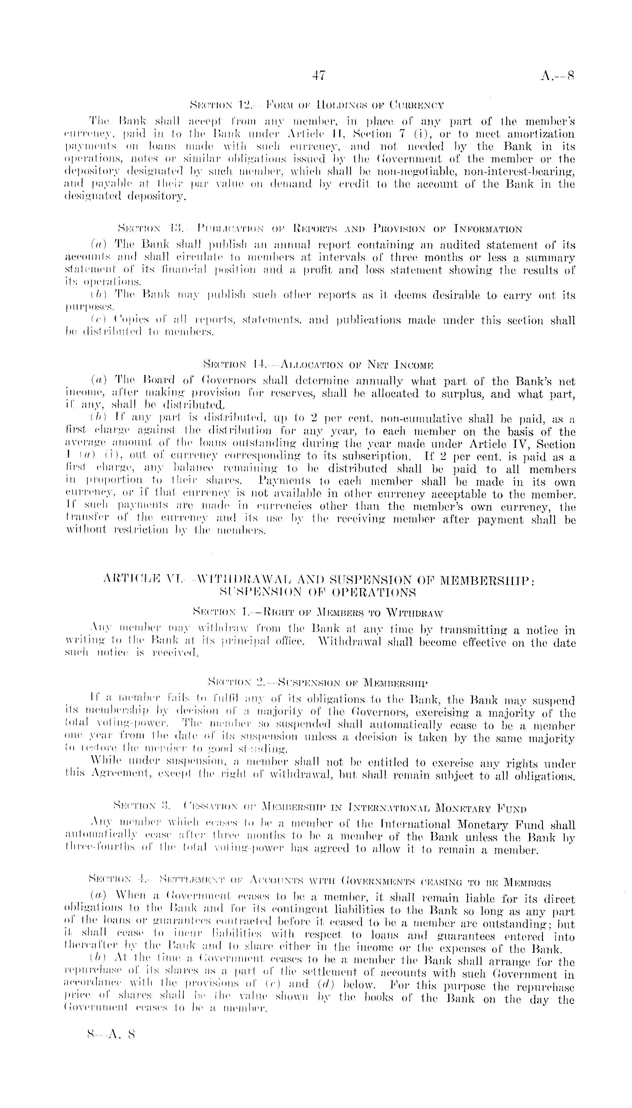 Section 12.—Form of Holdings of Currency The Bank shall accept from any member, in place of any part of the member's currency, paid in to the Bank under Article 11, Section 7 (i), or to meet amortization payments on loans made with such currency, and not needed by the Bank in its operations, notes or similar obligations issued by the Government of the member or the depository designated by such member, which shall be non-negotiable, non-interest-bearing, and payable at their par value on demand by credit to the account of the Bank in the designated depository. Section 13.—Publication of Reports and Provision of Information (a.) The Bank shall publish an annual report containing an audited statement of its accounts and shall circulate to members at intervals of three months or less a summary statement of its financial position and a profit and loss statement showing the results of its operations. (b) The Bank may publish such other reports as it deems desirable to carry out its purposes. (c) Copies of all reports, statements, and publications made under this section shall be distributed to members. Section 14.—Allocation of Net Income (a) The Board of Governors shall determine annually what part of the Bank's net income, after making provision for reserves, shall be allocated to surplus, and what part, if any, shall be distributed. (b) If any part is distributed, up to 2 per cent, non-cumulative shall be paid, as a first charge against the distribution for any year, to each member on the basis of the average amount of the loans outstanding during the year made under Article IV, Section .1 (a) (i), out of currency corresponding to its subscription. If 2 per cent, is paid as a first charge, any balance remaining to be distributed shall be paid to all members in proportion to their shares. Payments to each member shall be made in its own currency, or if that currency is not available in other currency acceptable to the member. If such payments are made in currencies other than the member's own currency, the transfer of the currency and its use by the receiving member after payment shall be without restriction by tbe members. ARTICLE YI.—WITHDRAWAL AND SUSPENSION OF MEMBERSHIP: SUSPENSION OF OPERATIONS Section I.—Right of Members to Withdraw Any member may withdraw from the Bank at any time by transmitting a notice in writing to the Bank at its principal office. Withdrawal shall become effective on the date such notice is received. Section 2.—Suspension of Membership I' a member tails to fulfil any of its obligations to the Bank, the Bank may suspend its membership by decision ol' a majority of the Governors, exercising a majority of the total voting-power. The mchiber so suspended shall automatically cease to be a member one year from the date of it's suspension unless a decision is taken by the same majority to restore the member to good standing. A\ liilo under suspension, a member shall not be entitled to exercise any rights under this Agreement, except the right of withdrawal, but shall remain subject to all obligations. Section 3.—Cessation of Membership in International Monetary Fund Any member which ceases to be a member of the International Monetary Fund shall automatically cease after three months to be a member of the Bank unless the Bank by three-fourths of the total voting-power has agreed to allow it to remain a member. Section 4.—Settlement of Accounts with Governments ceasing to be Members (a) When a Government ceases to be a member, it shall remain liable for its direct obligations to the Bank and for its contingent liabilities to the Bank so long as any part of the loans or guarantees contracted before it ceased to be a member are outstanding; but it shall cease to incur liabilities with respect to loans and guarantees entered into thereafter by the Bank and to share either in the income or the "expenses of the Bank. (?)) At the time a Government ceases to be a member the Bank shall arrange for the repurchase of its shares as a part of the settlement of accounts with such Government in accordance with the provisions ol (c) and (d) below. For this purpose the repurchase price of shares shall be the value shown by the books of the Bank on the day the Government ceases to be a member.