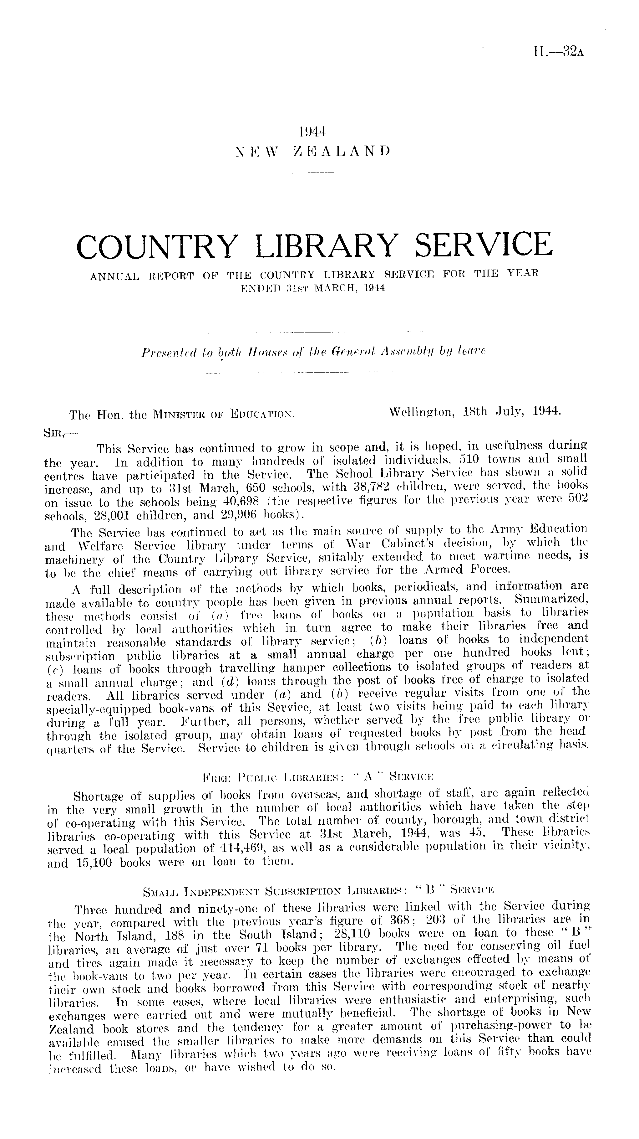 COUNTRY LIBRARY SERVICE ANNUAL REPORT OF THE COUNTRY LIBRARY SERVICE FOR THE YEAR ENDED 31st MARCH, 1944