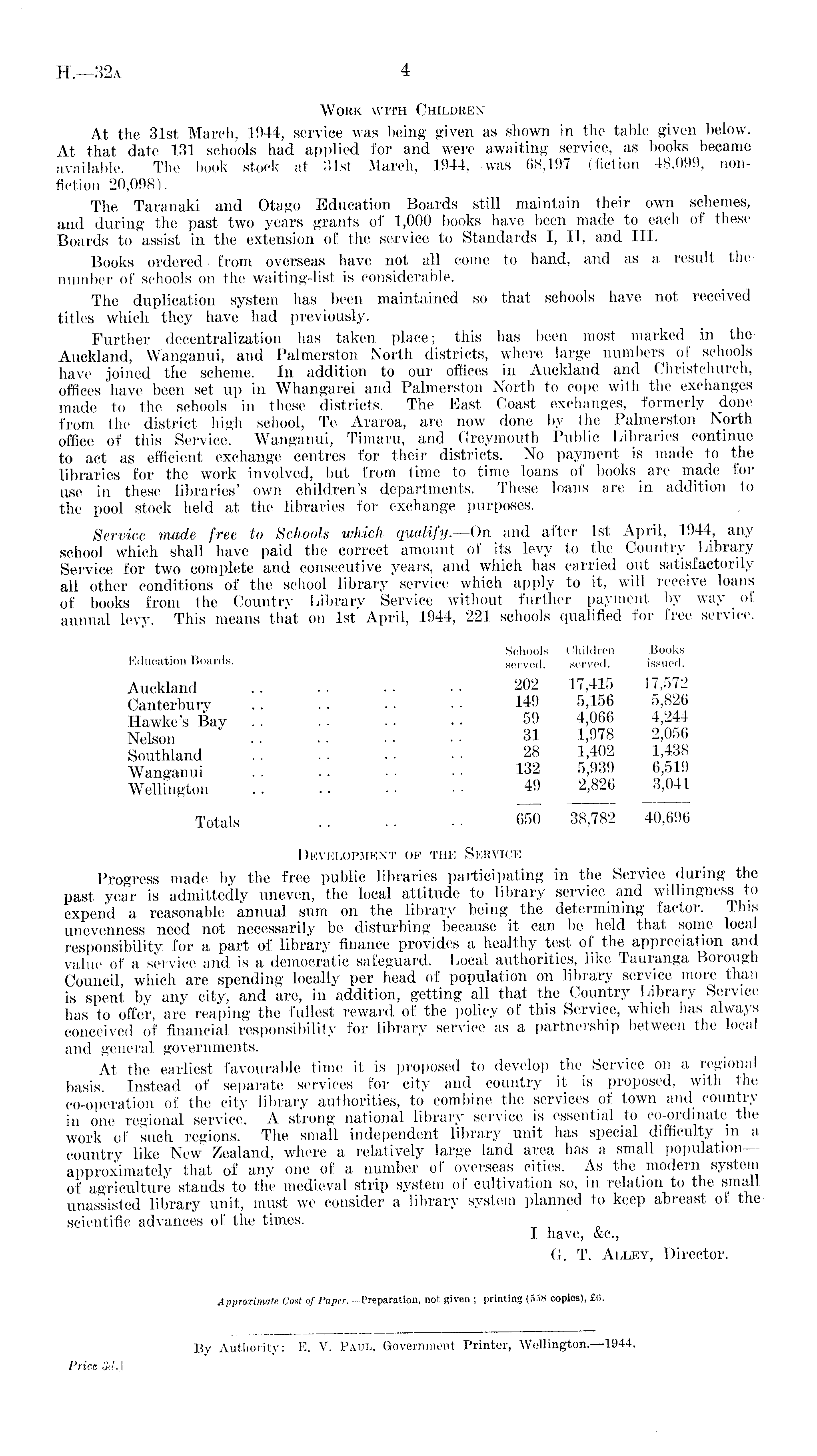Work with Children At the 31st March, 1944, service was being given as shown in the table given below. At that date 131 schools had applied for and were awaiting service, as books became available. The book stock at 31st March, 1944, was 68,197 (fiction 48,099, nonfiction 20,098). The Taranaki and Otago Education Boards still maintain their own schemes, and during the past two years grants of 1,000 books have been made to each of these Boards to assist in the extension of the service to Standards I, 11, and 111. Books ordered from overseas have not all come to hand, and as a result the number of schools on the waiting-list is considerable. The duplication system has been maintained so that schools have not received titles which they have had previously. Further decentralization has taken place; this has been most marked in theAuckland, Wanganui, and Palmerston North districts, where large numbers of schools have joined the scheme. In addition to our offices in Auckland and Christchurch, offices have been set up in Whangarei and Palmerston North to cope with the exchanges made to the schools in these districts. The East Coast exchanges, formerly done from the district high school, Te Araroa, are now done by the Palmerston North office of this Service. Wanganui, Timaru, and Greymouth Public Libraries continue to act as efficient exchange centres for their districts. No payment is made to the libraries for the work involved, but from time to time loans of books _ are made for use in these libraries' own children's departments. These loans are in addition to the pool stock held at the libraries for exchange purposes. Service made free to Schools which qualify.—On and after Ist April, 1944, any school which shall have paid the correct amount of its levy to the Country Library Service for two complete and consecutive years, and which has carried out satisfactorily all other conditions of the school library service which apply to it, will receive loans of books from the Country Library Service without further payment by way of annual levy. This means that on Ist April, 1944, 221 schools qualified for free service. Schools Children Books Education Boards. served. served. issued. Auckland .. • • ■ • • • 202 17,415 17,572 Canterbury .. . . .. • • 149 5,156 5,826 Hawke's Bay . . . . • • • • 59 4,066 4,244 Nelson 31 1,978 2,056 Southland . . • • • • ■ • 28 1,402 Wanganui . . .. • • • • 132 5,939 6,51.) Wellington .. .. • • • • 49 2,826 3,041 Totals 650 38,782 40,696 Development op the Service Progress made by the free public libraries participating in the Service during the past year is admittedly uneven, the local attitude to library service and willingness to expend a reasonable annual sum on the library being_ the determining factor. This unevenness need not necessarily be disturbing_ because it can be held that some local responsibility for a part of library finance provides a healthy test of the appreciation and value of a service and is a democratic safeguard. Local authorities, like Tauranga Borough Council, which are spending locally per head of population on library service more than is spent by any city, and are, in addition, getting all that the Country Library Service has to offer, are reaping the fullest reward of the policy of this Service, which has always conceived of financial responsibility for library service as a partnership between the local and general governments. At the earliest favourable time it is proposed to develop the Service on a regional basis. Instead of separate services for city and country it is proposed, with the co-operation of the city library authorities, to combine the services of town and country in one regional service. A strong national library service is essential to co-ordinate the work of such regions. The small independent library unit has special difficulty in a country like New Zealand, where a relatively large land area has a small population— approximately that of any one of a number of overseas cities. As the modern system of agriculture stands to the medieval strip system of cultivation so, in relation to the small unassisted library unit, must we consider a library system planned to keep abreast of the scientific advances of the times. I have, &c., G. T. Alley, Director.
