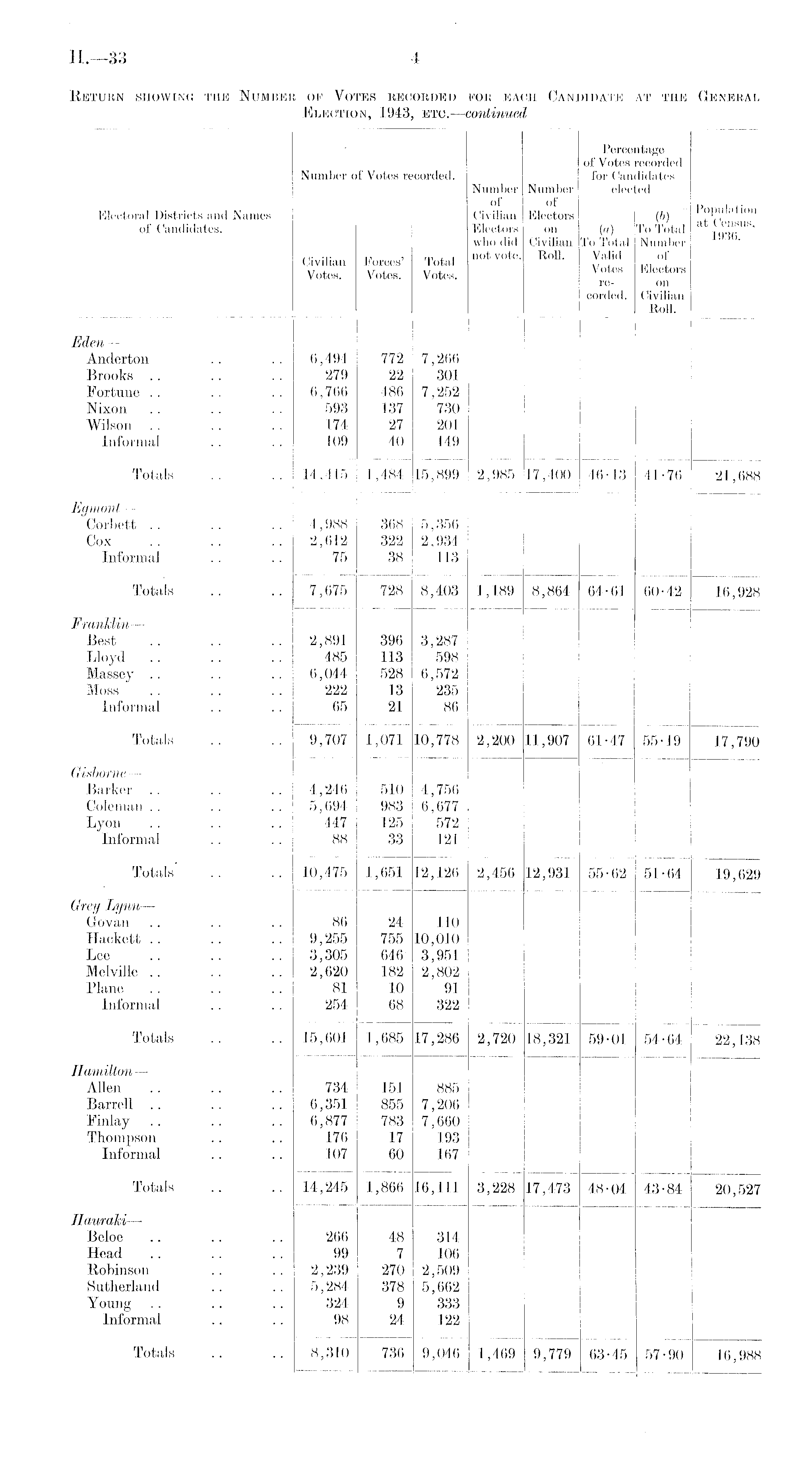 Percentage of Votes recorded Number of Votes recorded, for Candidates Number Number elected Electoral Districts and Names Civilian Electors (b) Population of Candidates. Electors on (a) To Total <l . US ' who did Civilian To Total Number '' ' Civilian Forces' Total notvote ' RolL Valid °J Votes. Votes. Votes. Votea Electors re- on corded. Civilian Roll. Eden — Anderton .. .. 6,494 772 7,266 Brooks .. .. .. 279 22 301 Fortune .. .. .. 6,766 486 7,252 Nixon .. .. .. 593 137 730 Wilson .. . . . . 174 27 201 Informal . . . . 109 40 149 Totals .. .. 14,415 1,484 15,899 2,985 17,400 46-13 41-76 21,688 Egmont— Corbett .. .. .. 4,988 368 5,356 Cox .. .. .. 2,612 322 2,934 Informal .. . . 75 38 113 Totals .. .. 7,675 728 8,403 1,189 8,864 64-61 60-42 16,928 Franklin— Best .. .. .. 2,891 396 3,287 Lloyd .. .. .. 485 113 598 Massey .. .. .. 6,044 528 6,572 Moss .. • .. .. 222 13 235 Informal .. .. 65 21 86 Totals .. .. 9,707 1,071 10,778 2,200 11,907 61-47 55-19 17,790 Gisborne — Barker .. .. .. 4,246 510 4,756 Coleman.. .. .. 5,694 983 6,677 Lyon .. .. .. 447 125 572 Informal .. .. 88 33 121 Totals' .. .. 10,475 1,651 12,126 2,456 12,931 55-62 51-64 19,629 Grey Lynn — Govan .. .. .. 86 24 110 Hackett .. .. .. 9,255 755 10,010 Lee .. .. .. 3,305 646 3,951 Melville .. .. .. 2,620 182 2,802 Plane .. .. .. 81 10 91 Informal .. .. 254 68 322 Totals .. .. 15,601 1,685 17,286 2,720 18,321 59-01 54-64 22,138 Hamilton— Allen .. .. .. 734 151 885 Barrell .. .. .. 6,351 855 7,206 Finlay .. .. .. 6,877 783 7,660 Thompson .. .. 176 17 193 Informal .. .. 107 60 167 Totals .. .. 14,245 1,866 16,111 3,228 17,473 48-04 43-84 20,527 Hauraki— Beloe .. .. .. 266 48 314 Head .. .. .. 99 7 106 Robinson .. .. 2/239 270 2,509 Sutherland .. .. 5,284- 378 5,662 Young .. .. .. 324 9 333 Informal .. .. 98 24 122 Totals .. .. 8,310 736 9,046 1,469 9,779 63-45 57-90 16,988
