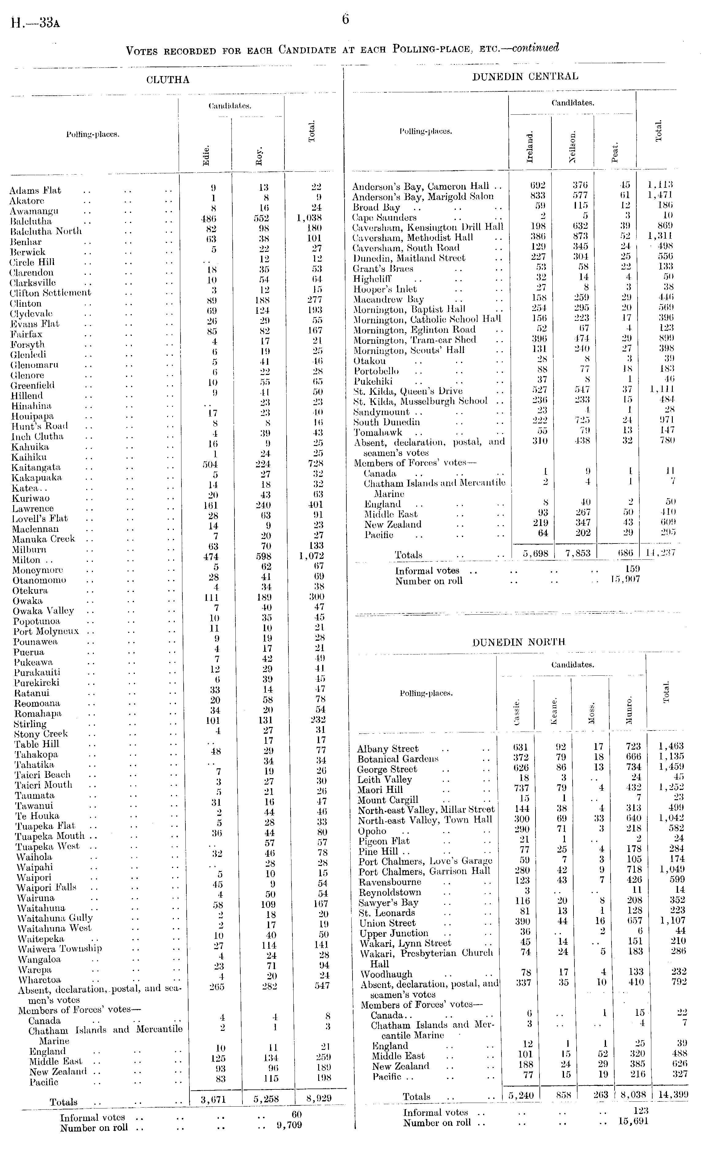 DUNEDIN CENTRAL Candidates. Polling-places. • • -g f S . H - a S g % g m A AH Anderson's Bay, Cameron Hall .. 692 376 45 1,113 Anderson's Bay, Marigold Salon 833 577 61 1,471 Broad Bay .. •. • • 59 115 12 186 Cape Saunders . • • • 2 5 3 10 Cavershain, Kensington Drill Hall 198 632 39 869 Caversham, Methodist Hall .. 386 873 52 1,311 Caversham, South Road • • 129 345 24 • 498 Dunedin, Maitland Street .. 227 304 25 556 Grant's Braes .. •. 53 58 22 133 Highcliff .. .. •• 32 14 4 50 Hooper's Inlet .. • • 27 8 3 38 Maeandrew Bay .. •. 158 259 29 446 Mornington, Baptist Hall .. 254 295 20 569 Mornington, Catholic School HaU 156 223 17 396 Mornington, Eglinton Road .. 52 67 4 123 Mornington, Tram-car Shed .. 396 474 29 899 Mornington, Scouts' Hall •. 131 240 27 398 Otakou .. .. • • 28 8 3 39 Portobello .. .. • • 88 77 18 183 Pukehiki .. .. • • 37 8 1 46 St. Kilda, Queen's Drive .. 527 547 37 1,111 St. Kilda, Musselburgh School .. 236 233 15 484 Sandymount .. .. • • 23 4 I 28 South Dunedin .. • • 222 725 24 971 Tomahawk .. •• 55 79 13 147 Absent, declaration, postal, and 310 438 32 780 seamen's votes Members of Forces' votesCanada .. ■• • • 1 0 1 11 Chatham Islands and Mercantile 2 4 17 Marine England 8 40 2 50 Middle East .. • • 93 267 50 410 New Zealand .. • • 219 347 43 609 Pacific .. • • • • 64 202 29 295 Totals .. 5,698 7,853 686 14,237 Informal votes .. .. .. • • 159 Number on roll .. 15,907 DUNEDIN NORTH Candidates. Polling-places. # -§ ■ 2 8 3 ® 2 O 3 Swag Albany Street .. .. 631 92 17 723 1,463 Botanical Gardens •• 372 79 18 666 1,135 George Street .. •• 626 86 13 734 1,459 Leith Valley .. .. 18 3 24 45 Maori Hill .. •• 737 79 4 432 1,252 Mount Cargill • ■ • • 15 1 • • 7 23 North-east Valley, Millar Street 144 38 4 313 499 North-east Valley, Town Hall 300 69 33 640 1,042 Opoho 290 71 3 218 582 Pigeon Flat .. • ■ 21 1 . • 2 24 Pine Hill 77 25 4 178 284 Port Chalmers, Love's Garage 59 7 3 105 174 Port Chalmers, Garrison Hall 280 42 9 718 1,049 Ravensbourne .. ■ • 123 43 7 426 599 Reynoldstown .. • • 3 • • ■ • 11 14 Sawyer's Bay . • • • 116 20 8 208 352 St. Leonards .. • • 81 13 1 128 223 Union Street .. 390 44 16 657 1,107 Upper Junction .. • . 36 .. 2 6 44 Wakari, Lynn Street .. 45 14 .. 151 210 Wakari, Presbyterian Church 74 24 5 183 286 Hall „ Woodhaugh .. • • 78 17 4 133 232 Absent, declaration, postal, and 337 35 10 410 792 seamen's votes Members of Forces' votes — Canada.. .. •• 6 .. I 15 22 Chatham Islands and Mer- 3 .. .. 4 7 cantile Marine England . • • • 12 1 1 25 39 Middle East .. . • 101 15 52 320 488 New Zealand .. ■ • 188 24 29 385 626 Pacific .. .. • • 77 15 19 216 327 Totals .. 5,240 858 263 I 8,038 14,399 Informal votes .. .. • • • • 123 Number on roll .. .. .. •• 15,691