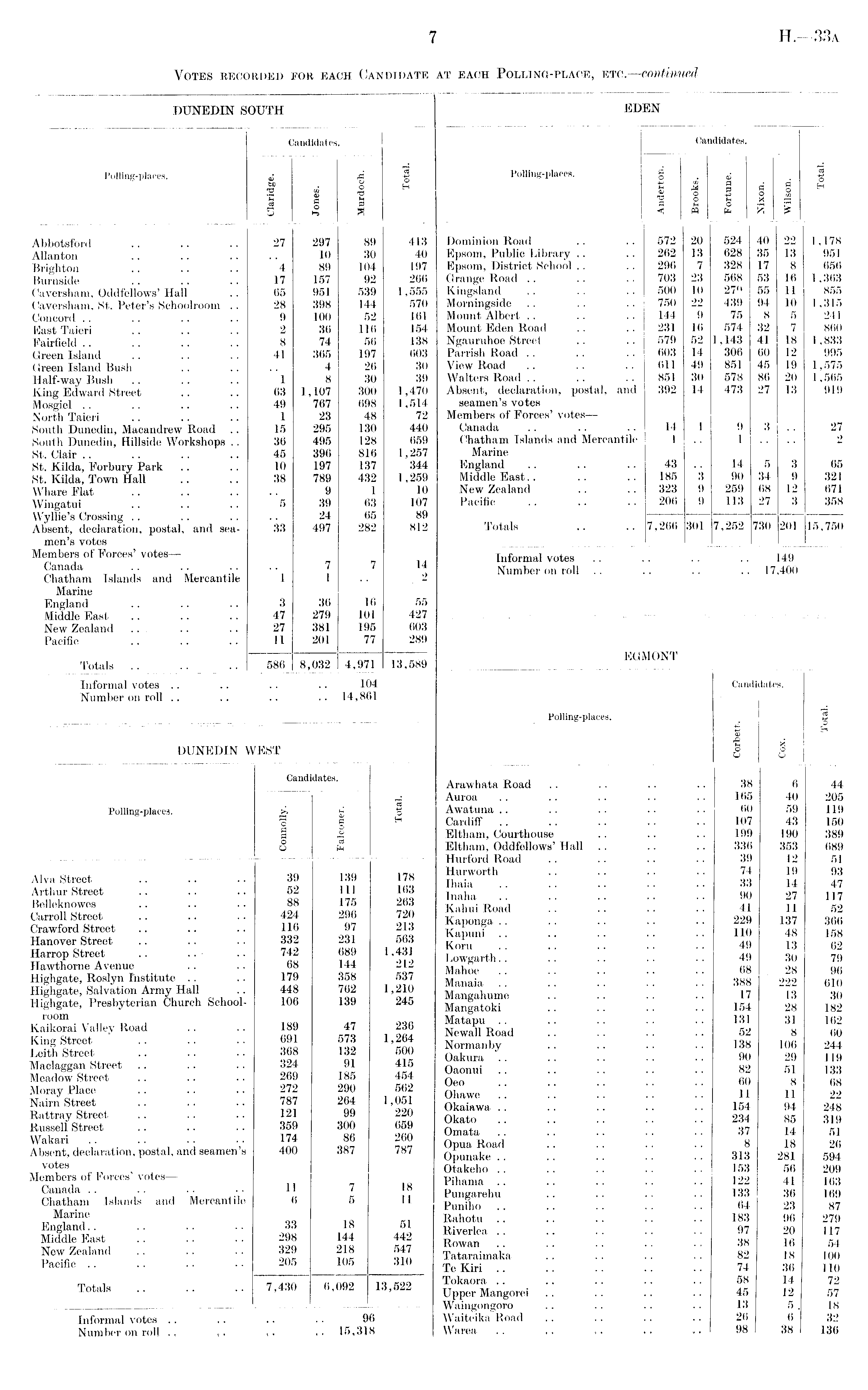 EDEN Candidates. Polling-places. g , „• 3 g | s g o H 1 § ¥ S 3 <i m fa ft iS Dominion Road .. .. 572 20 524 40 22 1,178 Epsom, Public Library .. .. 262 13 628 35 13 951 Epsom, District School .. .. 296 7 328 17 8 656 Grange Road .. .. .. 703 23 568 53 16 1,363 Kingsland .. . . .. 500 10 270 55 11 855 Morningside .. .. .. 750 22 439 94 10 1,315 Mount Albert .. . . 144 9 75 8 5 241 Mount Eden Road .. . . 231 16 574 32 7 860 Ngauruhoe Street .. .. 579 52 1,143 41 18 1,833 Parrish Road .. .. .. 603 14 306 60 12 995 View Road .. .. .. 611 49 851 45 19 1,575 Walters Road .. .. .. 851 30 578 86 20 1,565 Absent, declaration, postal, and 392 14 473 27 13 919 seamen's votes Members of Forces' votes — Canada .. . . .. 14 1 9 3.. 27 Chatham Islands and Mercantile I 1 2 Marine England .. . . .. 43 .. 14 5 3 65 Middle East.. .. .. 185 3 90 34 9 321 New Zealand .. 323 9 259 68 12 671 Pacific .. .. .. 206 9 113 27 3 358 Totals .. .. 7,266 301 7,252 730 201 15,750 Informal votes .. .. .. .. 149Number on roll .. .. .. .. 17,400 EGMONT Candidates. Polling-places. 5 IS ■£ M O O o u Arawhata Road . . .. .. .. 38 6 44 Auroa .. .. .. .. . ■ 165 40 205 Awatuna .. .. .. .. .. 60 59 119 Cardiff . . .. .. .. .. 107 43 150 Eltham, Courthouse .. .. .. 199 190 389 Eltham, Oddfellows' Hall . . .. .. 336 353 689 Hurford Road .. .. . . .. 39 12 51 Hurworth .. .. .. .. 74 19 93 Ihaia .. .. .. .. .. 33 14 47 Inaha .. .. .. .. .. 90 27 117 Kahui Road .. .. .. .. 41 11 52 Kaponga . . . . .. .. .. 229 137 366 Kapuni .. .. .. .. .. 110 48 158 Koru .. .. .. .. .. 49 13 62 Lowgarth.. .. .. .. .. 49 30 79 Mahoe .. .. .. .. .. 68 . 28 96 Manaia . . . . .. . . . . 388 222 610 Mangahume .. .. .. .. 17 13 30 Mangatoki .. .. .. .. 154 28 182 Matapu .. .. . . .. .. 131 31 162 Newall Road .. .. .. .. 52 8 60 Normanby .. .. • • • • 138 106 244Oakura . . .. .. .. .. 90 29 119 Oaonui .. .. . . .. .. 82 51 133 Oeo .. .. .. . . •• 60 8 68 Ohawe .. .. .. .. .. 11 11 22 Okaiawa .. .. .. .. . . 154 94 248 Okato .. .. .. .. .. 234 85 319 Omata .. .. .. .. . . 37 14 51 Opua Road .. . . .. .. 8 18 26 Opunake .. .. .. . . .. 313 281 594 Otakeho .. .. .. .. .. 153 56 209 Pihama .. .. .. .. .. 122 41 163 Pungarehu .. .. .. .. 133 36 169 Puniho .. .. .. .. .. 64 23 87 Rahotu .. .. .. .. .. 183 96 279 Riverlea .. .. .. .. .. 97 20 117 Rowan .. .. .. .. .. 38 16 54 Tataraimaka .. .. .. . . 82 18 100 Te Kiri .. .. .. .. .. 74 36 110 Tokaora .. .. . . .. . . 58 14 72 Upper Mangorei .. .. . . .. 45 12 57 Waingongoro .. .. .. .. 13 5. 18 Waiteika Road .. .. .. .. 26 6 32 Warea .. .. . • . • • • 98 38 136