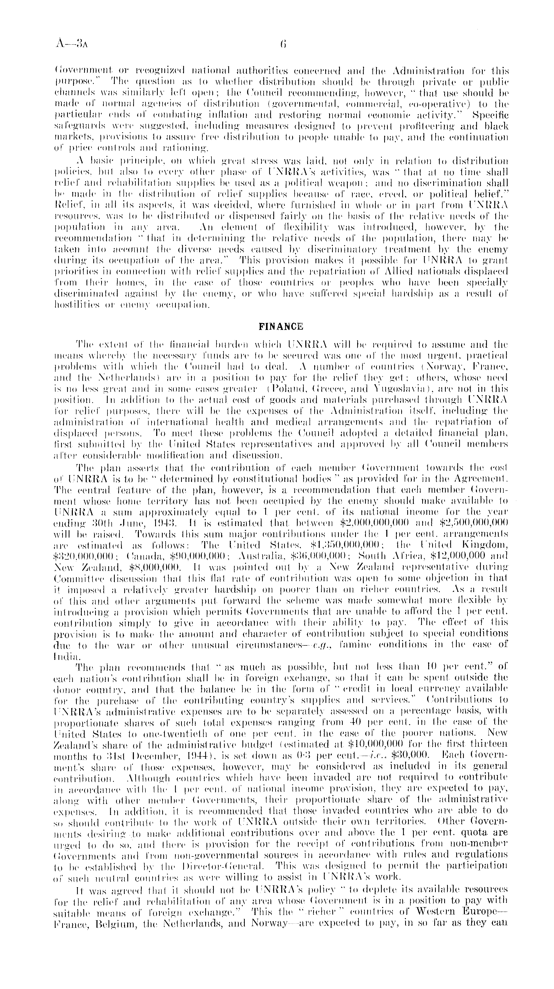 Government or recognized national authorities concerned and the Administration for this purpose." The question as to whether distribution should be through private or public channels was similarly left open; the Council recommending, however, "that use should be made of normal agencies of distribution (governmental, commercial, co-operative) to the particular ends of combating inflation and restoring normal economic activity." Specific safeguards were suggested, including measures designed to prevent profiteering and black markets, provisions to assure free distribution to people unable to pay, and the continuation of price controls and rationing. A basic principle, on which great stress was laid, not only in relation to distribution policies, but also to every other phase of UNRRA's activities, was " that at no time shall fellef and rehabilitation supplies be used as a political weapon; and 110 discrimination shall be made in the distribution of relief supplies because of race, creed, or political belief." Relief, in all its aspects, it was decided, where furnished in whole or in part from UNRRA resources, was to be distributed or dispensed fairly on the basis of the relative needs of the population in any area. An element of flexibility was introduced, however, by the recommendation " that in determining the relative needs of the population, there may be taken into account the diverse needs caused by discriminatory treatment by the enemy during its occupation of the area." This provision makes it possible for UNRRA to grant priorities in connection with relief supplies and the repatriation of Allied nationals displaced from their homes, in the case of those countries or peoples who have been specially discriminated against by the enemy, or who have suffered special hardship as a result of hostilities or enemy occupation. FINANCE The extent of the financial burden which UNRRA will be required to assume and the means whereby the necessary funds are to be secured was one of the most urgent, practical problems with which the Council had to deal. A number of countries (Norway, France, and the Netherlands) are in a position to pay for the relief they get; others, whose need is no less great and in some cases greater (Poland, Greece, and Yugoslavia), are not in this position. In addition to the actual cost of goods and materials purchased through UNRRA for relief purposes, there will be the expenses of the Administration itself, including" the administration of international health and medical arrangements and the repatriation of displaced persons. To meet these problems the Council adopted a detailed financial plan, first submitted by the United States representatives and approved by all Council members after considerable modification and discussion. The plan asserts that the contribution of each member Government towards the cost of UNRRA is to be " determined by constitutional bodies " as provided for in the Agreement. The central feature of the plan, however, is a recommendation that each member Government whose home territory has not been occupied by the enemy should make available to UNRRA a sum approximately equal to 1 per cent, of its national income for the year ending 30th June, 1943. It is estimated that between $2,000,000,000 and $2,500,000,000 will be raised. Towards this sum major contributions under the 1 per cent, arrangements are estimated as follows: The United States, $1,350,000,000; the United Kingdom, $320,000,000; Canada, $90,000,000; Australia, $36,000,000; South Africa, $12,000,000 and New Zealand, $8,000,000. It was pointed out by a New Zealand representative during Committee discussion that this flat rate of contribution was open to some objection in that it imposed a relatively greater hardship on poorer than on richer countries. As a result of this and other arguments put forward the scheme was made somewhat more flexible by introducing a provision which permits Governments that are unable to afford the 1 per cent, contribution simply to give in accordance with their ability to pay. The effect of this provision is to make the amount and character of contribution subject to special conditions due to the war or other unusual circumstances —e.g., famine conditions in the case of India. The plan recommends that " as much as possible, but not less than 10 per cent." of each nation's contribution shall be in foreign exchange, so that it can be spent outside the donor country, and that the balance be in the form of " credit in local currency available for the purchase of the contributing country's supplies and services." Contributions to UNRRA's administrative expenses are to be separately assessed on a percentage basis, with proportionate shares of such total expenses ranging from 40 per cent, in the ease of the United States to one-twentieth of one per cent, in the case of the poorer nations. _ New Zealand's share of the administrative budget (estimated at $10,000,000 for the first thirteen months to 31st December, 1944), is set down as 0-3 per cent. —i.e., $30,000. Each Government's share of those expenses, however, may be considered as included in its general contribution. Although countries which have been invaded are not required to contribute in accordance with the 1 per cent, of national income provision, they are expected to pay, along with other member Governments, their proportionate share of the administrative expenses. In addition, it is recommended that those invaded countries who are able to do so should contribute to the work of UNRRA outside their own territories. Other Governments desiringsto make additional contributions over and above the 1 per cent, quota are urged to do so, v and there is provision for the receipt of contributions from non-member Governments and from non-governmental sources in accordance with rules and regulations to be established by the Director-General. This was designed to permit the participation of such neutral countries a