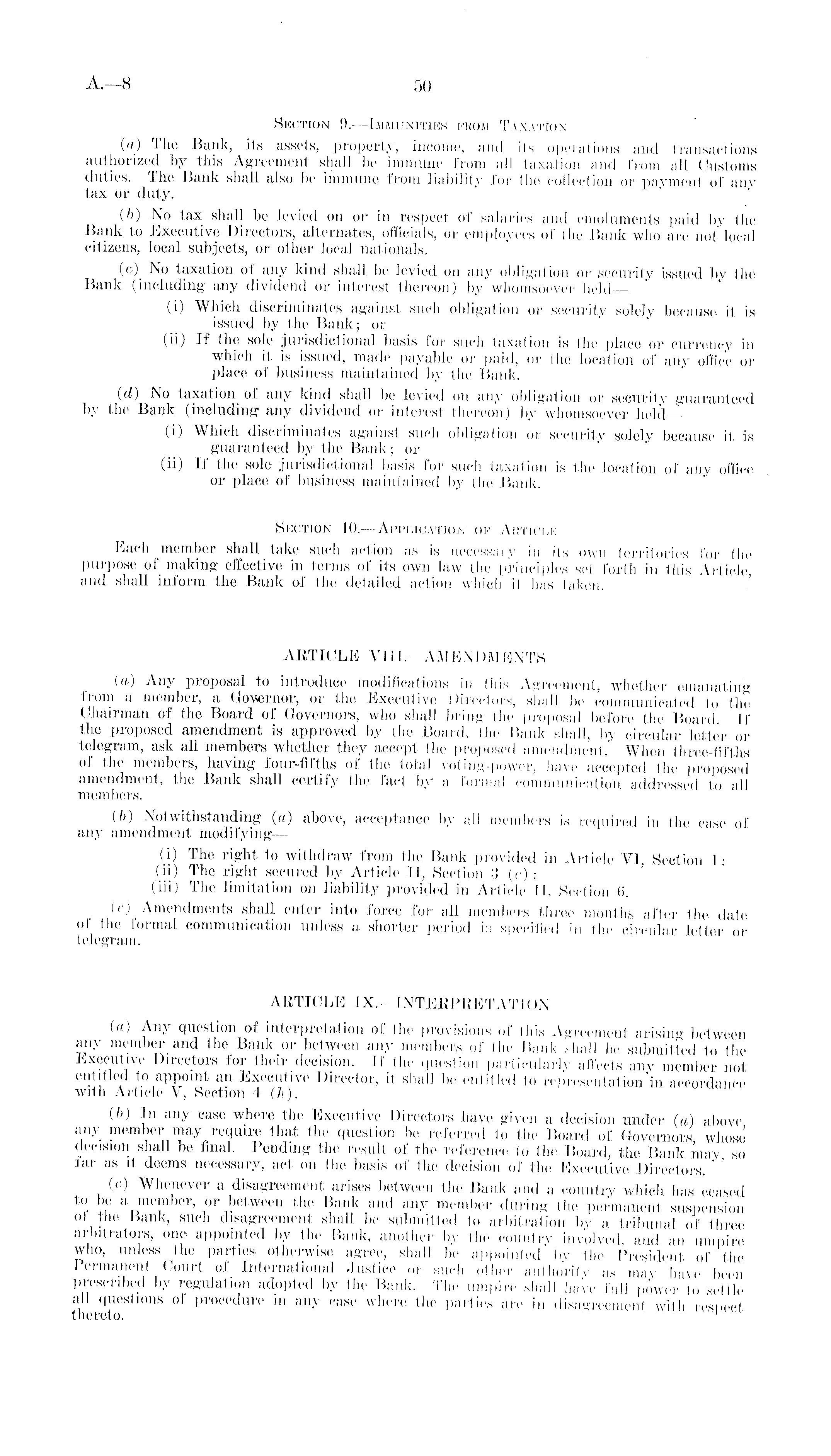 Section 9.—lmmunities from Taxation (a) The Bank, its assets, property, income, and its operations and transactions authorized by this Agreement shall be immune from all taxation and from all Customs duties. The Bank shall also be immune from liability for the collection or payment of any tax or duty. (&) No tax shall be levied on or in respect of salaries and emoluments paid by the Bank to Executive Directors, alternates, officials, or employees of the Bank who are not local citizens, local subjects, or other local nationals. (°), No taxation of any kind shall be levied on any obligation or security issued by the Bank (including any dividend or interest thereon) by whomsoever held— (i) Which discriminates against such obligation or security solely because it is issued by the Bank; or (ii) If the sole jurisdictional basis for such taxation is the place or currency in which it is issued, made payable or paid, or the location of any office or place of business maintained by the Bank. (d) No taxation oi any kind shall be levied on any obligation or security guaranteed by the Bank (including any dividend or interest thereon) by whomsoever held— (i) Which discriminates against such obligation or security solely because it is guaranteed by the Bank; or (ii) II the sole jurisdictional basis for such taxation is the location of any office or place of business maintained by the Bank. Section 10.—Application op Article Each member shall take such action as is necessary in its own territories for the purpose of making effective in terms of its own law the principles set forth in this Article and shall inform the Bank of the detailed action which it has taken. ARTICLE VIII. -AMENDMENTS (s') Any proposal to intioduce modifications in this Agreement, whether emanating 1 rom a member, a Governor, or the Executive Directors, shall be communicated to the Chairman oi the Board of Governors, who shall bring the proposal before the Board If the proposed amendment is approved by the Board, the Bank shall, by circular letter or telegram, ask all members whether they accept the proposed amendment. When three-fifths of the members, having four-fifths of the total voting-power, have accepted the proposed amendment, the Bank shall certify the fact by a formal communication addressed to all members. (b) Notwithstanding (a) above, acceptance by all members is required in the case of any amendment modifying— (i) The right to withdraw from the Bank provided in Article VI, Section 1 • (ii) The right secured by Article 11, Section 3 (c) : (iii) The limitation on liability provided in Article 11, Section 6. (c) Amendments shall enter into force for all members three months after the date o! the formal communication unless a shorter period is specified in the circular letter or telegram. ARTICLE IX.—INTERPRETATION (d) Any question of interpretation of the provisions of this Agreement arising between any member and the Bank or between any members of the Bank shall be submitted to the Executive Directors for their decision. If the question particularly affeets any member not entitled to appoint an Executive Director, it shall be entitled to representation in accordance with Article \, Section 4 (k). (b) In any case where the Executive Directors have given a decision under (a,) above any member may require that the question be referred to the Board of Governors, whose decision shall be final. Pending the result of the reference to the Board, the Bank may so far as it deems necessary, act on the basis of the decision of the Executive Directors. (c) Whenever a disagreement arises between the Bank and a country which has ceased to be a member, or between the Bank and any member during the permanent suspension ot the Bank, such disagreement shall be submitted to arbitration by a tribunal of three arbitrators, one appointed by the Bank, another by the country involved, and an umpire who, unless the parties otherwise agree, shall be appointed by the President of the Permanent Court of International Justice or such other authority as may have been prescribed by regulation adopted by the Bank. The umpire shall have full power to settle all questions of procedure in any case where the parties are in disagreement with respect thereto. 1 l
