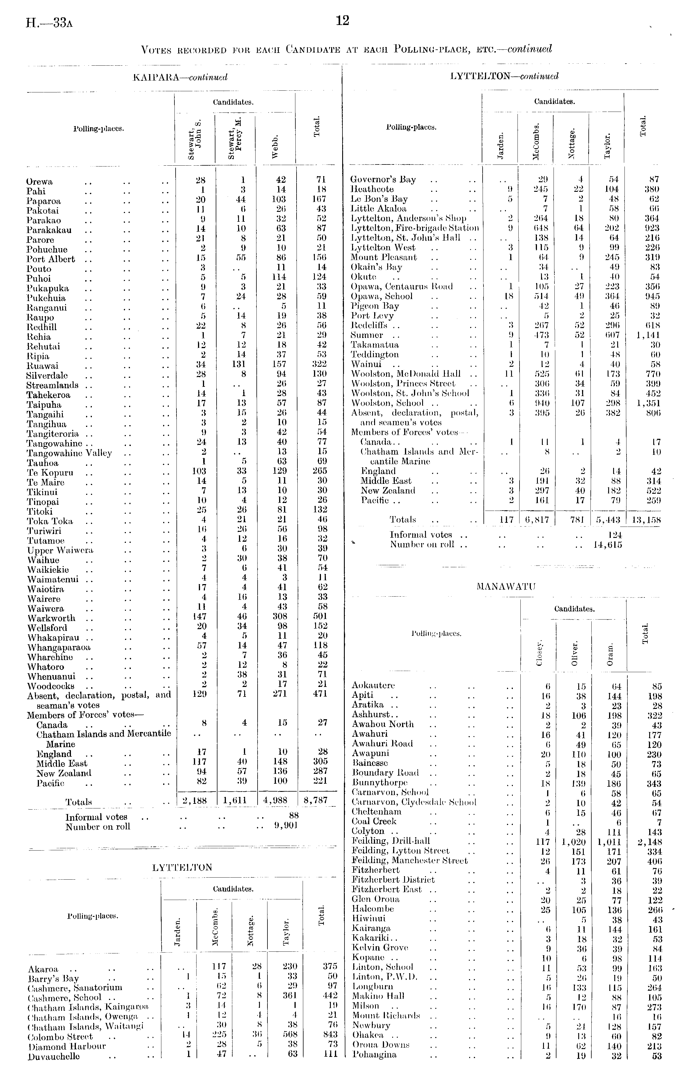 LYTTELTON—continued Candidates. rolling-places. ja © o f i I £ 3 a s? H Governor's Bay . . .. . . 29 4 54 87 Heathcote .. .. 9 245 22 104 380 Le Bon's Bay . . .. 5 7 2 48 02 Little Akaloa .. . . . . 7 1 58 60 Lyttelton, Anderson's Shop 2 204 18 80 304 Lyttelton, Fire-brigade Station 9 048 04 202 923 Lyttelton, St. John's Hall . . . . 138 14 04 210 Lyttelton West .. .. 3 115 9 99 226 Mount Pleasant .. .. 1 04 9 245 319 Okain's Bay .. .. .. 34 .. 49 83 Okute .. .. .. . . 13 1 40 54 Opawa, Centaurus Koad .. 1 105 27 223 350 Opawa, School .. .. 18 514 49 364 945 Pigeon Bay .. .. .. 42 1 40 89 Port Levy .. . . .. 5 2 25 32 liedcliffs .. .. .. 3 267 52 296 018 Sumner .. .. .. 9 473 52 607 1,141 Takamatua .. .. 1 7 1 21 30 Teddington .. .. 1 10 1 48 60 Wainui .. . . .. 2 12 4 40 58 Wools ton, McDonald Hall .. 11 525 01 173 770 Woolston, Princes Street .. . . 300 34 59 399 Woolston, St. John's School 1 330 31 84 452 Woolston, School .. .. 0 940 107 298 1,351 Absent, declaration, postal, 3 395 20 382 800 and seamen's votes Members of Forces' votes— Canada.. .. .. 1 11 1 4 17 Chatham Islands and Mer- .. 8 2 10 cantile Marine England .. .. .. 26 2 14 42 Middle East .. . . 3 191 32 88 314 New Zealand .. .. 3 297 40 182 522 Pacific .. .. . . 2 101 17 79 259 Totals ■ ■ .. 117 6,817 781 5,443 13,158 Informal votes .. . . . . .. 124 * Number on roll .. .. . . .. 14,615 MANAWATU Candidates. Polling-places. -§ >• H _• B a) <d a co > £ £ a 2 o o o Aokautere .. .. .. 6 15 64 85 Apiti .. .. .. .. 10 38 144 198 Aratika .. .. .. .. 2 3 23 28 Ashhurst.. .. .. .. 18 106 198 322 Awahou North .. . . .. 2 2 39 43 Awahuri .. .. .. 16 41 120 177 Awahuri Road .. .. .. 0 49 05 120 Awapuni .. .. .. 20 110 100 230 Bainesse .. .. .. 5 lg 50 73 Boundary Koad .. .. .. 2 18 45 05 Bunnythorpe . . . . .. 18 139 180 343 Carnarvon, School .. .. 1 0 58 65 Carnarvon, Clydesdale School .. 2 10 42 54 Cheltenham .. . . .. 6 15 40 67 Coal Creek .. .. .. 1 .. 6 7 Colyton .. .. .. ... 4 28 111 143 Feilding, Drill-hall .. .. 117 1,020 1,011 2,148 Feilding, Lytton Street .. .. 12 151 171 334 Feilding, Manchester Street .. 20 173 207 406 Fitzherbert .. .. .. 4 n 01 76 Fitzherbert District .. .. ., 3 36 39 Fitzherbert East . . .. .. 2 2 18 22 Glen Oroua .. .. .. 20 25 77 122 Halcombe .. .. .. 25 105 130 266 Hiwinui .. .. .. .. 5 38 43 Kairanga .. .. .. 0 H 144 101 Kakariki.. .. .. .. 3 18 32 53 Kelvin Grove . . .. .. 9 36 39 84 Kopane . . .. 10 0 98 114 Linton, School .. .. . . 11 53 90 163 Linton, P.W.D. .. .. .. 5 20 19 50 Longburn .. . . .. 10 133 115 264 Makino Hall .. .. . . 5 12 88 105 Milson . . . . .. . . 10 170 87 273 Mount Richards .. .. . . . . .. 10 16 Newbury .. .. .. 5 24 128 157 Ohakea . . .. .. .. 9 13 60 82, Oroua Downs .. . . .. 11 62 140 213 Pohangina .. .. .. 2 19 32 53