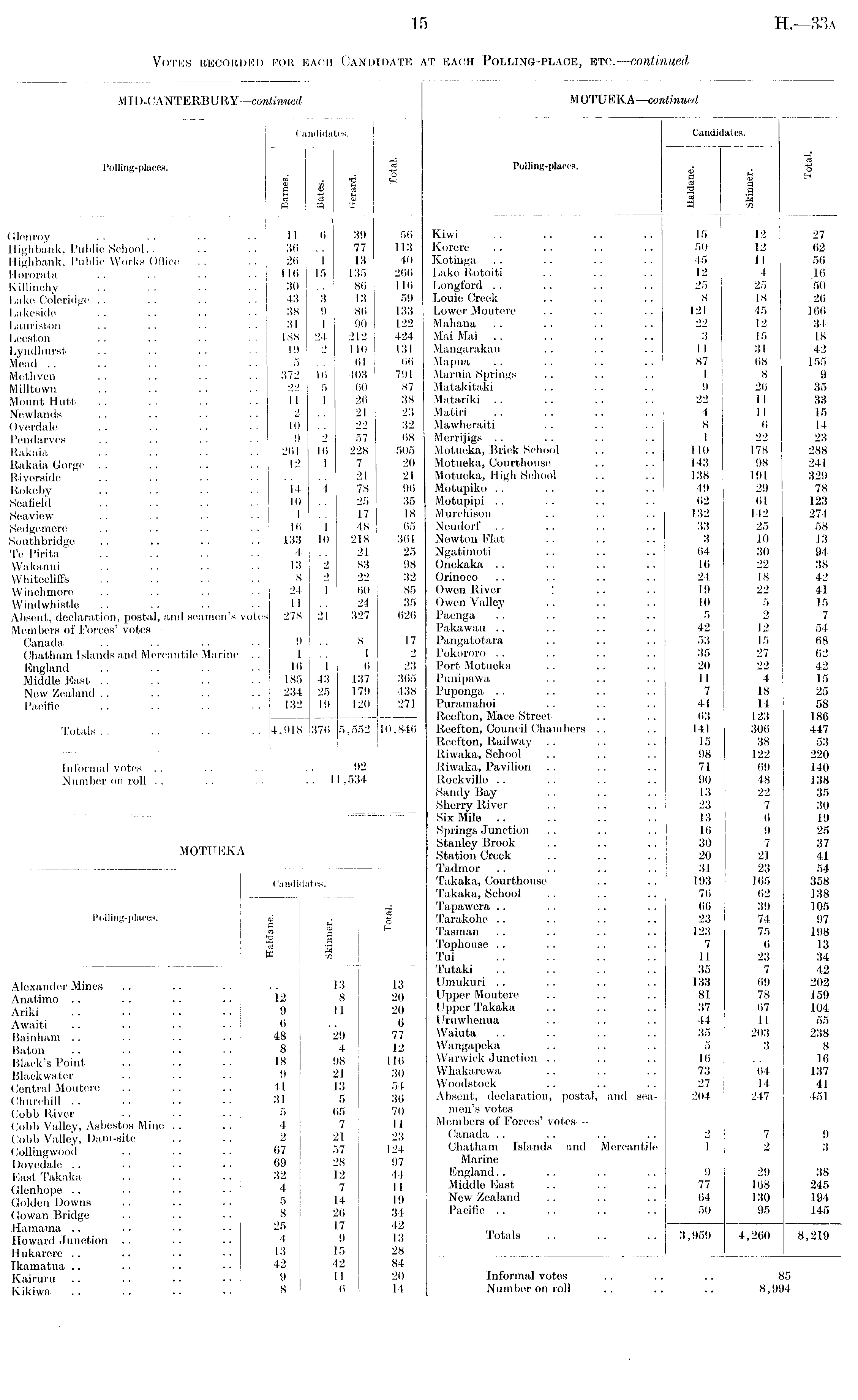 MID-CANTERBURY —continued Candidates. Polling-places. S • •. o to . P-i H M e3 c3 D M pq a Glenroy 11 0 1 39 56 Highbank, Public School. . .. .. 3(1 77 113 Highbank, Public Works Office .. . . 20 1 13 40 Hororata .. .. .. 116 15 135 266 Killinchy . . . . • • . • 30 86 116 Lake Coleridge .. .. .. . . 43 3 13 59 Lakeside .. . . .. . • 38 9 86 133 Lauriston .. .. . . • • 31 1 90 122 Leeston . . .. . . . . 188 24 212 424 Lyndhurst .. .. .. . . 19 2 110 131 Mead .. .. .. .. .. 5 . . 61 66 Methven .. .. .. .. 372 16 403 791 Milltown .. . . .. .. 22 5 60 87 Mount Hutt .. .. . . . • 111 26 38 Newlands . . .. .. . • 2 21 23 Overdale .. .. . • . • 10 22 32 Pendarves .. .. .. . • 9 2 57 68 ltakaia .. .. . • . . 261 16 228 505 Rakaia Gorge .. .. . . . • 12 1 7 20 Riverside .. .. .. 21 21 Rokeby .. .. . . . . 14 4 78 96 Seafield .. . . ■. . • 10 25 35 Seaview . . . . • • • • 1 17 18 Sedgemere . . . . ■ . • ■ 16 1 48 65 Southbridge .. .. .. .. 133 10 218 361 Te Pirita .. . . . • • • 4 . . 21 25 Wakanui . . 13 2 83 98 Whitecliffs . . .. .. ■ • 8 2 22 32 Winchmore .. .. .. •. 24 1 60 85 Windwhistle . . .. •. • • 11.. 24 35 Absent, declaration, postal, and seamen's votes 278 21 327 626 Members of Forces' votes — Canada .. .. • . . . 9 8 17 Chatham Islands and Mercantile Marine . . 1 1 2 England . . .. ■ . ■ . 16 1 6 23 Middle East .. .. .. •• 185 43 137 365 k- New Zealand .. . . .. • • 234 25 179 438 Pacific .. .. .. .. 132 19 120 271 Totals.. .. .. .. 4,918 376 5,552 10,846 Informal votes . . . . . . .. 92 Number on roll . . . . . . ..11,534 MOTUEKA Candidates. Polling-places. 6 . § 1 1 H £ Alexander Mines .. .. .. . . 13 13 Anatimo .. .. .. .. 12 8 20 Ariki .. .. •. • • 9 11 20 Awaiti .. .. .. . • 6 .. 6 Bainham .. .. .. .. 48 29 77 Baton .. .. • ■ ■ • 8 4 12 Black's Point .. .. •• 18 98 116 Blaokwater .. .. .. 9 21 30 Central Moutere .. .. .. 41 13 54 Churchill .. • • • • • • 31 5 36 Cobb River •. .. •. 5 65 70 Cobb Valley, Asbestos Mine .. .. 4 7 11 Cobb Valley, Dam-sito .. . ■ 2 21 23 Collingwood .. .. .. 67 57 124 Dovedale .. .. .. .. 69 28 97 East Takaka .. .. .. 32 12 44 Glenhope .. .. .. .. 4 7 11 Golden Downs .. .. .. 5 14 19 Gowan Bridge .. .. • • 8 26 34 Hainama .. .. .. .. 25 17 42 Howard Junction .. .. .. 4 9 13 Hukarero .. .. • • • • 13 15 28 Ikamatua .. .. .. . • 42 42 84 Kairuru .. .. .. •• 9 11 20 Kikiwa .. .. .. .. 8 6 14