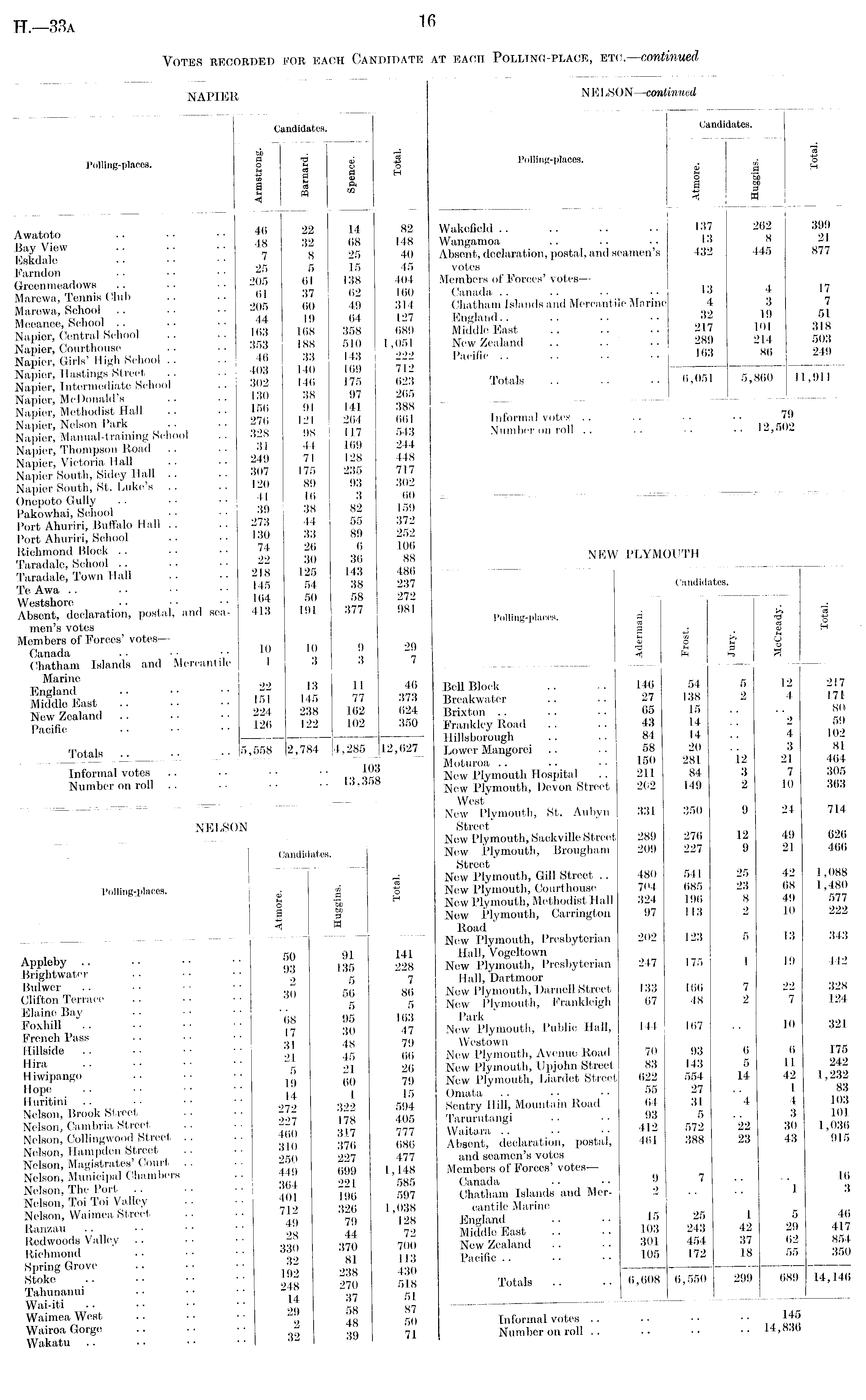 NAPIER Candidates. bfl . "oS Polling-places. § "2 g ■§ « s ! H | Awatoto .. •• •• 46 22 14 82 Bay View 48 32 08 148 SI e „ - :: :: 25 * 5 8 Greenmeadows 205 61 138 404 Marewa, Tennis Club .. • • 61 37 62 100 Marewa, School 205 60 49 .14 Meeanee, School .. .. •• 44 19 64 1-7 Napier, Central School .. .. 163 68 358 08. Napier, Courthouse .. •• 3o3 188 olO 1,051 Napier, Girls' High School .. .. 46 33 43 222 Napier, Hastings Street . . • ■ 403 140 169 712 Napier, Intermediate School .. 302 146 175 623 Napier, McDonald s .. •• }30 38 J7 265 Napier, Methodist Hall .. •• 156 91 141 388 Napier, Nelson Park .. • • 276 121 264 661 Napier, Manual-training School . . 328 98 117 o43 Napier, Thompson Road .. ■ ■ 31 44 169 244 Napier, Victoria Hall .. •• 249 71 1-8 448 Napier South, Sidey Hall .. .. 307 175 235 717 Napier South, St. Luke's .. ■■ 120 89 93 302 Onepoto Gully .. 41 . Pakowhai, School • • • • 39 38 82 159 Port Ahuriri, Buffalo Hall .. .. 273 44 55 372 Port Ahuriri, School . • ■ • 130 33 89 2jRichmond Block 74 -6 6 100 Taradale, School 22 30 36 88 Taradale, Town Hall .. • ■ 218 125 143 TeAwa 45 54 38 237 Westshore .. 081 Absent, declaration, postal, and sea- 413 191 377 .)»i men's votes Members of Forces'votes — Canada •• • • • • Chatham Islands and Mercantile 13 3 7 Marine ,9 n n 46 Middle East " Ml ™ Padfic ealand 126 T22 102 350 Totals .. .. .. 5,558 2/784 4,285 12,627 Informal votes .. • • • • " Number on roll .. •• 13,35s NELSON Candidates. Polling-Places. g o bo a s? 5 w »it, 50 91 141 Appleby " 135 228 Brightwater . • • • • • _ Bulwer .. ■ • • • • ■ j o,j Clifton Terrace .. ■ • • • 30 ® lai ™ Bay 68 95 163 S° i r, " " " 17 30 47 French Pass 48 7g i^! 1 ' ' ' ' '' '' 21 45 66 *^ ra . " " " 5 21 26 Hiwipango 10 60 79 5 0P -!- • 14 1 15 Huritini .... • • • • „ 99 fi Q4 Nelson, Brook Street •• -J Nelson, Cambria Street .. • • 2-7 178 ■ Nelson, Collingwood Street .. •• 46 317 777 Nelson, Hampden Street .. ■■ 31 376 Nelson, Magistrates'Court .. •• -<> Nelson, Municipal Chambers .. 449 699 1,148 Nelson, The Port 364 2-1 085 Nelson, Toi Toi Valley .. 401 196 . 0 Nelson, Waimea Street •• 712 326 Ranzau .. • • ■ • • • ' .. 72 Redwoods Valley 7()0 Richmond .. •• AA u3 Spring Grove lg2 238 430 S t( ? ke 248 270 518 Tahunanui 37 5l Wai-it 1 . • ■ • ■ • • • rR q 7 Waimea West .. • • • • 29 Wairoa Gorge 71 Wakatu ..