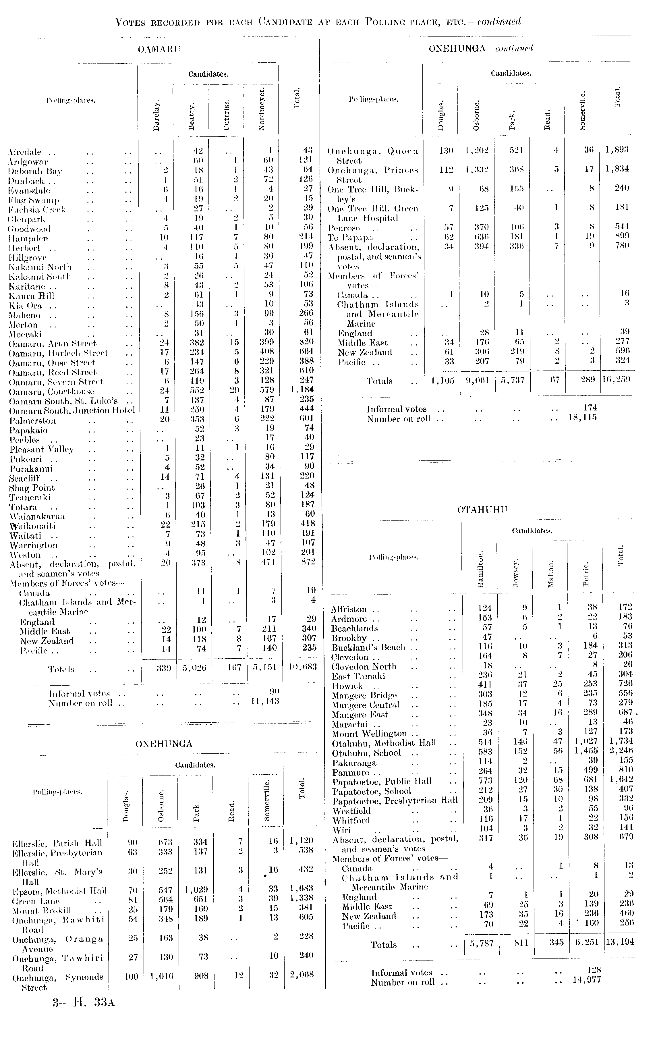 0AMARU Candidates. M r— <D C« Polling-places. j £> 5 § & % S H 2 t S ■§ d ® sJ o W ffl O Airedale .. .. .. .. 42 .. 1 43 ( Ardgowan .. .. •. 60 1 00 121 Deborah Bay .. .. 2 18 1 43 64 ( Dunbaok .. .. .. 1 51 2 72 120 Evansdale .. .. 6 16 1 4 27 1 Flag Swamp .. .. 4 19 2 20 45 Fuchsia Creek .. .. .. 27 .. 2 29 ( Glenpark .. .. 4 19 2 5 30 Goodwood .. .. 5 40 I 10 56 Hampden .. .. 10 117 7 80 214 ' Herbert 4 110 5 80 199 , Hillgrove . . .. . ■ 10 1 30 47 ICakanui North .. .. 3 55 5 47 110 Kakarmi South .. .. 2 26 .. 24 52 ] Karitane . . .. .. 8 43 2 53 106 Kauru Hill . . ■. 2 61 1 9 73 Kia Ora . . . . .. • • 43 .. 10 53 Maheno 8 156 3 99 266 Alert011 .. .. .. 2 50 1 3 56 Moeraki .. .. • • 31 .. 30 61 Oamaru, Arun Street .. 24 382 15 399 820 Oamaru, Harlech Street .. 17 234 5 408 664 Oamaru, Ouse Street .. 0 147 6 229 388 Oamaru, Reed Street .. 17 264 8 321 610 Oamaru, Severn Street .. 6 110 3 128 247 Oamaru, Courthouse .. 24 552 29 579 1,184 Oamaru South, St. Luke's .. 7 137 4 87 235 Oamaru South, Junction Hotel 11 250 4 179 444 Palmerston .. .. 20 353 6 222 601 Papakaio .. .. • • 52 3 19 74 Peebles .. •. .. • • 23 .. 17 40 Pleasant Valley •• •• 1 H 1 10 Pukeuri .. •• •• 5 32 .. 80 117 Purakanui • . .. 4 52 34 90 Seacliff 14 71 4 131 220 Shag Point . . . . • • 26 1 21 48 Teaneraki .. .. 3 67 2 52 124 Totara .. ■ ■ •• 1 103 3 80 187 Waianakarua .. .. 6 40 1 13 60 Waikouaiti .. .. 22 215 2 179 418 Waitati .. ■. • • 7 73 1 110 191 Warrington .. .. 9 48 3 47 107 Weston .. • • • • 4 95 .. 102 201 Absent, declaration, postal, 20 373 8 471 872 and seamen's votes Members of Forces' votes— Canada .. •• •• 11 1 ? 1® Chatham Islands and Mer- .. 1 3 4 cantile Marine England .. .. • • 12 • • 17 2J Middle East .. .. 22 100 7 211 340 New Zealand .. .. 14 118 8 167 307 Pacific 14 74 7 140 235 Totals .. .. 339 5,026 167 5,151 10,683 Informal votes .. .. .. • • 90 Number on roll .. .. •• •• 11,143 ONEHUNGA Candidates. «i o Polling-places. » <u r 2 d !=i X-< w> o & S P £2 M # a O m di O P O p* A ai Ellerslie, Parish Hall 90 073 334 7 16 1,120 Ellerslie, Presbyterian 63 333 137 2 3 538 Hall Ellerslie, St. Mary's 30 252 131 3 # 16 432 Hall „„ , Epsom, Methodist Hall 70 547 1,029 4 33 1,688 Green Lane .. HI 564 651 3 39 Mount Roskill . . 25 179 160 2 15 381 Onehunga, Rawhiti 54 348 189 1 13 605 Road „ Onehunga, O rang a 25 163 38 .. - Avenue Onehunga, Tawhiri 27 130 73 .. 10 240 Onehunga, Symonds 100 1,016 908 12 32 2,068 Street
