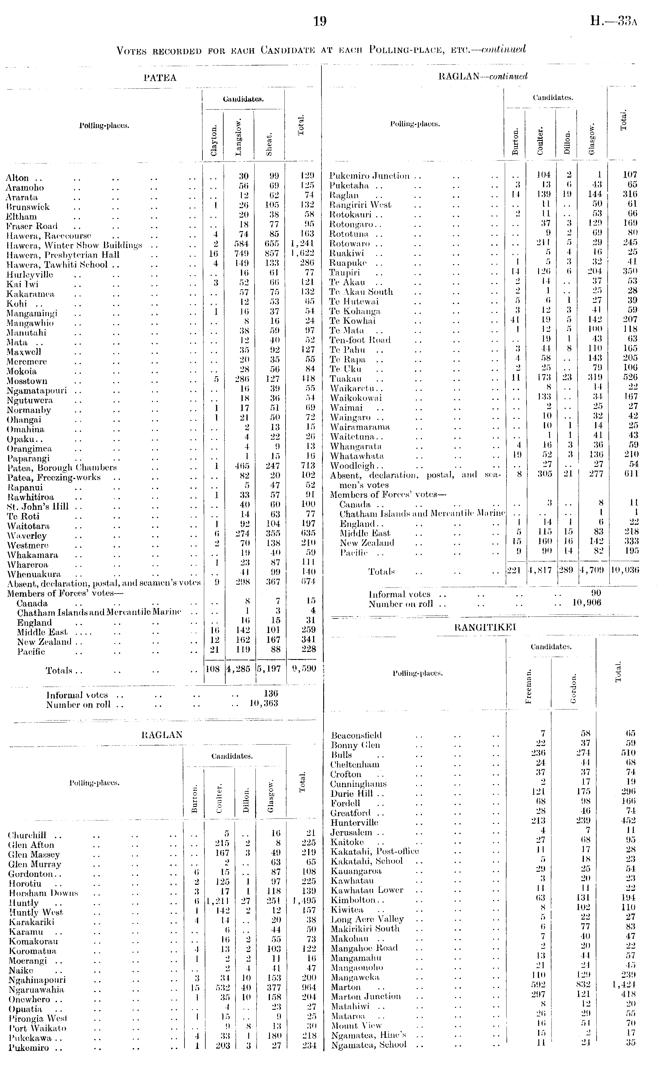 PATEA Candidates. Polling-places. do 'S I •a « H >, 5P 04 J? C3 <u £ cS O HI ca Alton 30 99 129 Aramoho .. .. .. .... 56 09 125 Ararata .. .. .. .... 12 02 74 Brunswick .. .. • • .. 1 20 105 132 Eltham .. .. .. .... 20 38 58 Eraser Road .. .. .. .... 18 77 95 Hawera, Racecourse .. .. .. 4 74 85 163 Hawera, Winter Show Buildings .. .. 2 584 655 1,241 Hawera, Presbyterian Hall •• ..16 749 857 1,022 Hawera, Tawhiti School .. .. .. 4 149 133 280 Hurleyvillo .. .. .. .... 10 61 77 Kai Iwi .. .. • • • ■ 3 52 66 121 Kakarainea .. .. . . .... 57 75 132 Kohi .. .. .. •• ■• •• 12 53 65 Mangamingi .. .. . ■ .. 1 10 37 54 Maneawliio .. .. . • .... 8 10 24 Manutahi .. • • • • .... 38 59 97 Mata 12 40 52 Maxwell .. .. .. - • • • 35 92 127 Meremere .. .. .. .... 20 35 55 Mokoia .. . . ■ • .... 28 50 84 Mosstown .. .. . • • • 5 280 127 418 Ngamatapouri .. .. .. .... 10 39 55 Ngutuwera .. .. . ■ .... 18 36 54 Normanby .. .. • • .. 1 17 51 Oliangai ■ ■ • • ■ ■ .. 1 21 50 72 Omahina .. .. • ■ .... 2 13 15 Opaku.. 4 22 26 Orangimea .. .. ... .... 4 9 13 Paparangi .. .. ■ • .... 1 15 16 Patea, Borough Chambers .. .. 1 405 247 713 Patea, Freezing-works .. .. .... 82 20 102 Rapanui .. .. •• .... 5 47 52 ltawhitiroa .. .. • • .. 1 33 57 91 St. John's Hill 40 00 100 TeRoti .. .. •• .... 14 03 77 Waitotara .. .. •• ..1 92 104 197 Wa,verley . . .. • • 0 274 355 035 Wfcstmere .. .. .. .. 2 70 138 210 YVhakamara .. .. • • .... 19 40 59 Whareroa .. .. •• • • 1 23 87 111 Whenuakura .. •. • ■ .... 41 99 140 Absent, declaration, postal, and seamen's votes 9 298 367 074 Members of Forces' votes— Canada .. • • ■ ■ .... 8 7 15 Chatham Islands and Mercantile Marine .... 1 3 4 England .. .. •• .... 16 15 31 Middle East .. . . 16 142 101 259 New Zealand .. .. ■ • .. 12 162 167 341 Pacific 21 119 88 228 Totals.. .. .. ..108 4,285 5,197 9,590 j ; I Informal votes .. .. • • • • 136 Number on roll .. .. .. •• 10,363 RAGLAN Candidates. Polling-placet}. . •§ 5 el ® fH O -S w bD ■f n .2 <» d o 3 * pq (J S 3 Churchill .. .. •. .... 5 16 21 Glen Afton .. ■ • • • • - 215 2 8 225 Glen Massey .. •• •• 167 3 49 219 Glen Murray .. .. .... 2 63 65 Gordonton. . 6 15 .. 87 108 Horotiu 2 125 1 97 225 Horsham Downs .. .. • • 3 17 I 118 139 Huntly .. .. •• •• 6 1.211 27 251 1,495 Huntly West .. •. .. 1 142 2 12 157 Karakariki .. ■ • .. 4 14 20 38 Karamu .. . • • • .... 0 44 50 Komakorau .. • • .... 16 2 55 73 Koromatua .. • • .. 4 13 2 103 122 Moerangi .. • - •• 1 22 11 10 Naike .. .. •••• 2 4 41 47 Ngahinapouri .. .. .. 3 34 10 153 200 Ngaruawahia .. . • .. 15 532 40 377 964 Onewhero 1 35 10 158 204 Opuatia .. .. • • .... 4 23 27 Pirongia West .. .. .. 1 15 9 25 Port Waikato .. • • .... 9 8 13 30 Pukekawa .. .. ..4 33 1 180 21.8 Pukemiro .. -. • • • • 1 203 3 27 234