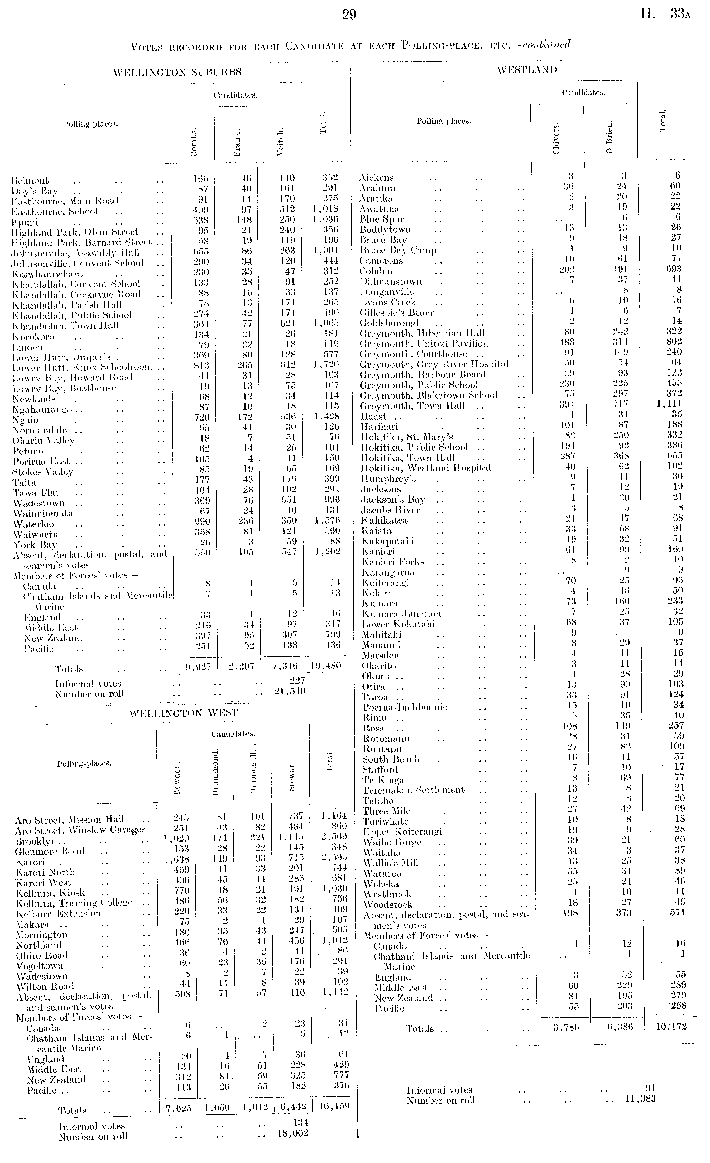 WELLINGTON SUBURBS Candidates. Polling-places. _ •§ 03 QJ H ■9 a s lag u > Belmont .. .. • • 106 46 140 352 i Day's Bay .. .. . • 87 40 164 291 i Eastbourne, Main Road .. 91 14 170 275 i Eastbourne, School .. .. 409 97 512 1,018 i Bpuni 638 148 250 1,036 Highland Park, Oban Street .. 95 21 240 356 Highland Park, Barnard Street .. 58 19 119 196 Johnsonville, Assembly Hall .. 655 86 263 1,004 Johnsonville, Convent School .. 290 34 120 444 Kaiwharawhara .. .. 230 35 47 .112 Khandallah, Convent School .. 133 28 91 -oKhandallah, Cockayne Road .. 88 16 33 137 Khandallah, Parish Hall .. 78 13 174 265 Khandallah, Public School .. 274 42 174 490 Khandallah, Town Hall .. 364 77 624 1,065 Korokoro .. .. . • 134 21 26 181 Linden . . .. • ■ 79 22 18 11J Lower Hutt, Draper's .. .. 369 80 128 577 Lower Hutt, Knox Schoolroom .. 813 265 642 1,720 Lowry Bay, Howard Road .. 44 31 28 103 Lowry Bay, Boathouse .. 19 13 75 107 Newlands . . . • • • 68 12 34 114 Ngahauranga.. .. .. 87 10 18 115 Nwaio .. •• 720 172 536 1,428 Normandale .. .. • • 65 41 30 126 Ohariu Valley .. •• 18 7 51 76 Petone . . .. • ■ 62 u 25 101 PoriruaEast 105 4 41 150 Stokes Valley .. •• 8o 1J 65 169 Taita • 177 43 179 399 Tawa Flat ! 164 28 102 294 , Wadestown . . • • • • 369 76 551 9.S6 Wainuiomata .. .. 67 24 40 131 Waterloo .. .. •• 990 236 3.)0 Waiwhetu .. .. • • 358 81 121 o60 York Bay .. . • • ■ 26 3 59 , Absent, declaration, postal, and 550 105 547 1,202 seamen's votes Members of Forces' votes — Canada 8 1 5 14 Chatham Islands and Mercantile 7 I 5 13 Marine .. . , „ England .. .. • • 33 1 1Middle East .. • ■ 216 34 97 347 New Zealand .. . • 397 9o 307 7J.J Pacific 251 52 133 43b_ Totals . . .. 9,927 2,207 7,346 1 19,4*0 Informal votes .. •• '" Number on roll .. • • • • 21,549 WELLINGTON WEST_ Candidates. 3 "cfi Polling-places. c * o bu -£ o ■s I I § H | 1 § s m | m ™ . Aro Street, Mission Hall .. 245 81 101 737 1,164 Aro Street, Winslow Garages 251 43 8- 484 8b0 Brooklyn 1.029 174 221 1, 45 2,569 GlenmoreRoad .. .. 153 28 22 145 348 Karon l.«38 1-9 93 715 2,595 Karori North .. ■ • 469 41 33 201 744 KaroriWest .. 306 45 44 286 681 Kelburn, Kiosk .. .. 770 48 21 191 1,030 Kelburn, Training College .. 486 ob 3- 18- 756 Kelburn Extension .. 220 33 22 134 409 Makara 75 2 1 29 107 Mornington .. • • 180 35 43 247. 505 Northland •• •• 466 7b 44 4ob 1,042 OhiroRoad .. •• 36 4 2 44 86 Vogeltown .. •• 60 23 35 176 , 294 Wadestown •• •• » 2 I on 1( w Wilton Road .. . . 44 11 8 39 102 Absent, declaration, postal, o98 71 57 416 1,14and seamen's votes Members of Forces' votes— _ Canada • • • • 0 .. - r i-> Chatham Islands and Mer- 6 1 0 • 1 - J eantile Marine England .. •• 20 4 7 30 61 Middle East .. • • 134 16 51 228 429 New Zealand .. .. 312 81, 59 325 777 Pacific H3 55 182 ™ Totals .. 7,625 1,050 1,042 6,442 ] 16,159 Informal votes . • • • •• 134 Number on roll •• •• 18.00-