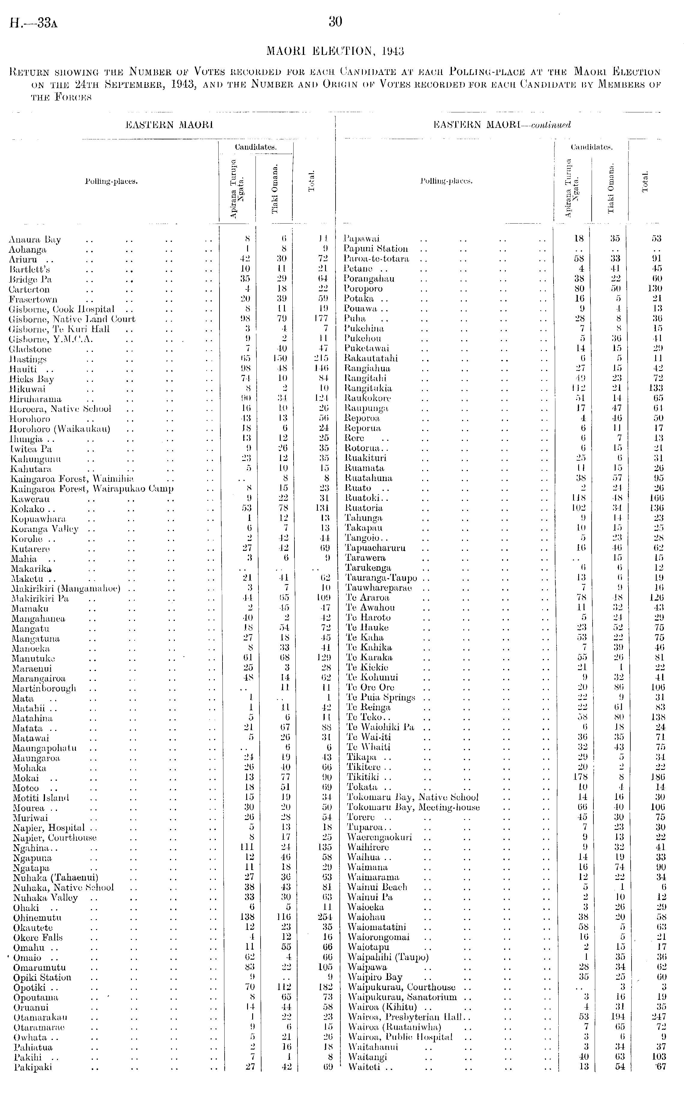 MAORI ELECTION, 1943 Return showing the Number of Votes recorded for each Candidate at each Polling-place at the Maori Election on the 24th September, 1943, and the Number and Origin of Votes recorded for each Candidate by Members of the Forces