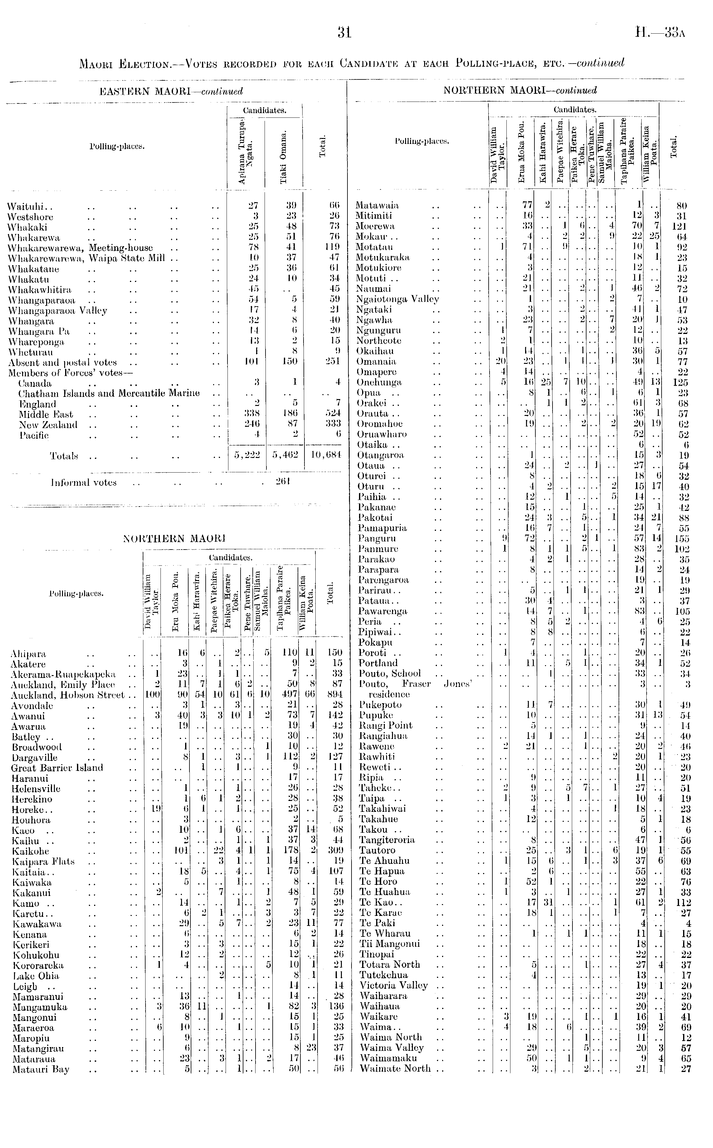 Maori Election.—Votes recorded for each Candidate at each Polling-place, etc. —continued