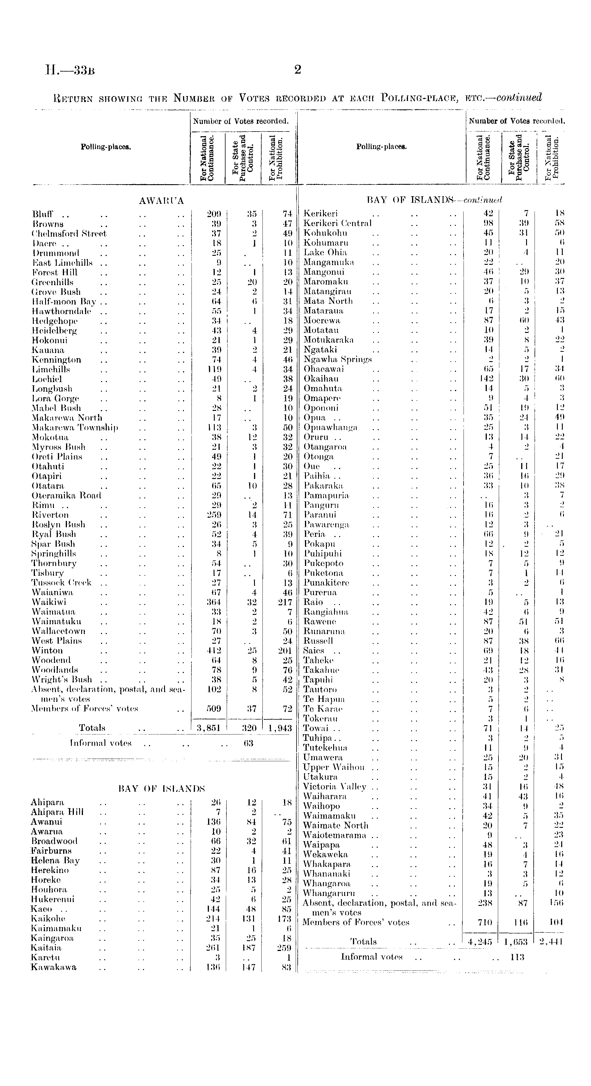 Number of Votes recorded, j Polling-places. go -g « ~ §.1 §1 is fcs *■§§ t^s Kg £§" *2 &s *s, ga AWARUA Bluff .. .. .. .. 209 35 74 Browns .. .. .. 39 3 47 Chelmsford Street .. . . 37 2 49 Dacre .. .. .. .. 18 1 10 Drummond .. .. .. 25 . 11 East Limehills .. .. .. 9 .. 10 Forest Hill .. . . .. 12 1 13 Greenhills .. .. .. 25 20 20 Grove Bush .. .. .. 24 2 14 Half-moon Bay .. .. .. 64 6 31 Hawthorndale .. .. .. 55 1 34 Hedgehope .. .. .. 34 .. 18 Heidelberg .. .. .. 43 4 29 Hokonui .. .. .. 21 1 29 Kauana .. .. .. 39 2 21 Kennington .. .. .. 74 4 46 Limehills .. .. .. 119 4 34 Loehiel .. .. .. 49 .. 38 Longbush .. .. .. 21 2 24 Lora Gorge .. . . . . 8 1 19 Mabel Bush .. . . .. 28 .. 10 Makarewa North . . . . 17 .. 10 Makarewa Township .. .. 113 3 50 Mokotua .. . . .. 38 12 32 Myross Bush .. . . .. 21 3 32 Oreti Plains .. .. . . 49 1 20 Otahuti .. . . .. 22 I 30 Otapiri .. . . .. 22 I 21 Otatara .. . . . . 65 10 28 Oteramika Road .. . . 29 .. 13 Rimu .. .. .. .. 29 2 11 Riverton . . . . .. 259 14 71 Roslyn Bush . . . . .. 26 3 25 Ryal Bush . . .. . . 52 4 39 Spar Bush . . . . .. 34 5 9 Springhills .. . . .. 8 1 10 Thorn bury . . . . . . 54 .. 30 Tisbury .. .. .. 17 .. 6 Tussock Creek .. .. .. 27 1 13 Waianiwa .. .. . . 67 4 46 Waikiwi .. .. .. 364 32 217 Wairaatua .. .. .. 33 2 7 Wairaatuku .. . . .. 18 2 6 Wallacetown .. .. .. 70 3 50 West Plains .. . . .. 27 .. 24 Winton .. .. .. 412 25 201 Woodend .. ,. .. 64 8 25 Woodlands .. .. .. 78 9 76 Wright's Bush .. .. ,. 38 5 42 Absent, declaration, postal, and sea- 102 8 52 men's votes Members of Forces' votes .. 509 37 72 Totals .. .. 3,851 320 1,943 Informal votes .. .. .. 63 BAY OF ISLANDS Ahipara .. .. .. 26 12 18 Ahipara Hill .. .. . . 7 2 Awanui . . .. .. 136 84 75 Awarua .. .. .. 10 2 2 Broad wood .. . . . . 66 32 61 Fairburns . . .. 22 4 41 Helena Bay .. .. 30 1 11 Herekino .. .. .. 87 16 25 Horeke . . .. . . 34 13 28 Houhora . . .. .. 25 5 2 Hukerenui .. . . .. 42 6 25 Kaeo . . . . . . .. 144 48 85 Kaikolie . . . . 214 131 173 Kaimamaku .. .. .. 21 1 6 Kaingaroa . . . . . . 35 25 18 Kaitaia . . . . . . 261 187 259 Karetu .. . . .. 3 .. 1 Kawakawa .. .. .. 136 147 83