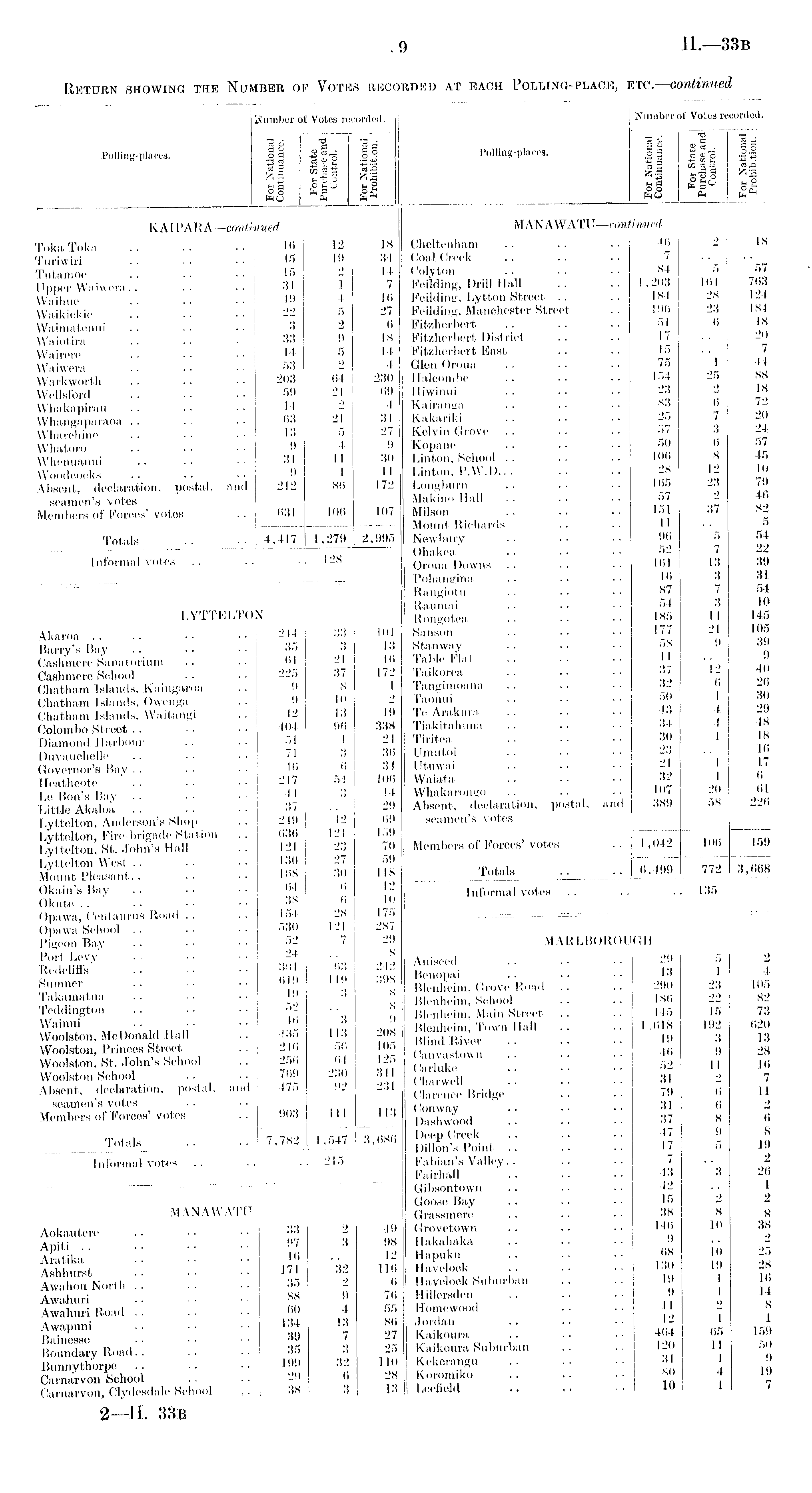 Number of Votes reeorded. *3 p Polling-places. o S *§2 "3 2 5 += 5 s i t-i .t; g§ jgf J"S fego Jg og o£ £<C> Ph KAIPARA—continued TokaToka .. ■■ 16 12 18 Tnriwiri 45 10 34 Tutamoe .. .. •• 16 2 14 Upper Waiwera.. •• •• 31 1 ' Waihue .. .. • • +9 4 16 Waikiekie .. • • • • 22 5 27 Waimatenui .. . . ■ • 3 2 6 Waiotira .. • • • '13 0 18 Wairere .. .. 14 6 14 Waiwera . ■ • • ■ • 63 2 4 Warkworth .. . . .. 203 64 230 Wellsford .. .. • • 59 21 69 Whakapirau .. .. •• 14 2 4 Whangaparaoa .. .. 63 21 31 Wharehine . • • • • • 13 5 27 Whatoro .. • ■ ■ • 9 4 Whenuanui .. •• ■■ 31 II 3(1 Woodcocks . • 9 1 11 Absent, declaration, postal, and 212 86 172 seamen's votes Members of Forces'votes .. 631 106 107 Totals .. 4,417 1,27!) 2,91)5 Informal votes .. .. 128 LYTTELTON Akaroa . . • • • • • • 244 33 10] Barry's Bay .. . • • • 3f> 3 13 Cashmere Sanatorium .. •• 61 21 111 Cashmere School .. 225 37 172 Chatham Islands, Kaingaroa .. 9 8 1 Chatham Islands, Owenga .. 9 10 Chatham Islands, Waitangi .. 42 13 19 Colombo Street .. • • • • 404 96 338 Diamond Harbour .. •• 51 I 21 Duvauchelle .. • • • • 71 3 36 Governor's Bay . ■ • • ■ • 46 6 34 Heathcote . • • ■ • • 217 54 106 Le Bon's Bay .. .. • • 44 3 14 Little Akaloa .. •• •• 37 Lyttelton, Anderson's Shop .. 249 42 69 Lyttelton, Fire-brigade Station .. 636 .121 159 Lyttelton, St. John's Hall .. 121 23 70 Lyttelton West .. • • • ■ 130 27 59 Mount Pleasant.. . • 168 30 118 Okain's Bay .. • • • • "4 (i Okute .. 38 6 10 Opawa, Centaurus Road .. .. 154 28 175 Opawa School .. . • ■ • 530 121 Pigeon Bay . . • ■ • • 52 7 29 Port Levy . . • • • • 24 Redcliffs •• •• 301 63 -42 Sumner .. •• •• *'10 '' ■' 398 Takamatna .. • • • • 19 3 Teddington . • • • • • 52 Wainui • • • • • ■ 4(1 3 9Woolston, McDonald Hall .. 435 11.3 208 Woolston, Princes Street . . 246 50 105 Woolston, St. John's School . . 256 64 125 Woolston School . • • ■ 769 230 341 Absent, declaration, postal, and 475 92 231 seamen's votes Members of Forces'votes .. 903 111 113 Totals .. ■■ 7,782 1,547 3,686 Informal votes .. .. ..215 MANAWATU Aokautere .. • • • • 33 2 49 Apiti 97 3 98 Aratika •• •• l'> ■■ }2 Ashhurst .. 1?1 3- 116 Awahou North .. . . • • 35 2 Awahuri .. ■ • ■ • 88 9 76 Awahuri Road .. •. • • 60 4 .>.) Awapuni 134 13 86 Bainesse . • ■ • • ■ <W ' "' Boundary Road.. .. . ■ 35 Bunnythorpe .. .. 199 32 110 Carnarvon School .. . • 29 j> Carnarvon, Clydesdale School ,, 38 3 13