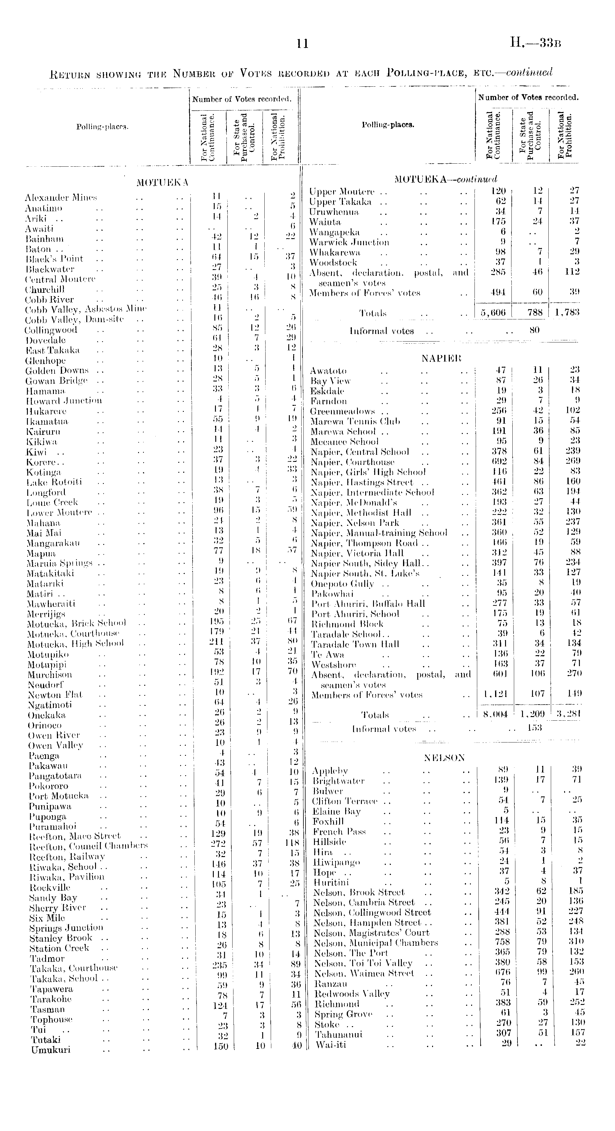 Number of Votes recorded. Is . is Polling-places. o g -g So .2 s ISg |S fej sg £1° s| few AH MOTUEKA—continued Upper Moutere .. .. .. 120 12 27 Upper Takaka .. .. . . 62 14 27 Uruwhenua .. .. .. 34 7 14 Waiuta . . .. .. 175 24 37 Wangapeka .. .. .. 6 .. 2 Warwick Junction .. .. 9 .. 7 Whakarewa .. .. .. 98 7 29 Woodstock .. .. .. 37 1 3 Absent, declaration, postal, and 285 46 112 seamen's votes Members of Forces' votes .. 494 60 39 Totals .. 5,606 788 1,783 Informal votes .. ■ . .. 80 NAPIER Awatoto .. .. .. 47 11 23 Bay View .. .. .. 87 26 34 Eskdale .. .. .. 19 3 18 Farndon .. .. .. 29 7 9 Greenmeadows .. .. .. 256 42 102 Marewa Tennis Club .. .. 91 15 54 Marewa School . . .. .. 191 36 85 Meeanee School .. .. 95 9 23 Napier, Central School .. .. 378 61 239 Napier, Courthouse .. .. 692 84 269 Napier, Girls' High School . . 116 22 83 Napier, Hastings Street .. .. 461 86 160 Napier, Intermediate School .. 362 63 194 Napier, McDonald's .. ... 193 27 44 Napier, Methodist Hall .. .. 222 32 130 Napier, Nelson Park .. . . 361 55 237 Napier, Manual-training School .. 360 52 129 Napier, Thompson Road . . .. 166 19 59 Napier, Victoria Hall . . .. 312 45 88 Napier South, Sidey Hall.. .. 397 76 234 Napier South, St. Luke's . .. 141 33 127 Onepoto Gully .. .. . . 35 8 19 Pakowhai .. .. . . 95 20 40 Port Ahuriri, Buffalo Hall .. 277 33 57 Port Ahuriri, School .. .. 175 19 61 Richmond Block .. .. 75 13 18 Taradale School.. .. .. 39 6 42 Taradale Town Hall .. .. 311 34 134 Te Awa .. .. .. 136 22 79 Westshore .. .. • . 163 37 71 Absent, declaration, postal, and 601 106 270 seamen's votes Members of Forces'votes .. 1,121 107 149 Totals _ .. 8,004 1,209 3,281 Informal votes .. .. .. 153 NELSON Appleby .. .. .. 89 11 39 Brightwater .. .. .. 139 17 71 Bulwer .. .. .. 9 Clifton Terrace .. .. .. 54 7 25 Elaine Bay . . .. .. 5 Foxhill .. .. •• 114 15 35 French Pass .. .. • • 23 9 15 Hillside .. .. .. 56 7 15 Hira .. .. .. • • 54 3 8 Hiwipango .. .. .. 24 12 Hope .. .. .. •. 37 4 37 Huritini .. .. .. 5 8 Nelson, Brook Street .. .. 342 62 185 Nelson, Cambria Street .. .. 245 20 136 Nelson, Collingwood Street .. 444 91 227 Nelson, Hampden Street .. .. 381 52 248 Nelson, Magistrates' Court .. 288 53 134 Nelson, Municipal Chambers .. 758 79 310 Nelson, The Port .. .. 365 79 132 Nelson, Toi Toi Valley .. . . 380 58 153 Nelson, Waimea Street .. .. 676 99 260 Ranzau .. .. ... 76 7 45 Redwoods Valley .. . • 51 4 17 Richmond .. .. ■ • 383 59 252 Spring Grove .. .. . • 61 3 45 Stoke 270 27 130 Tahunanui .. . . •■ 307 51 157 Wai-iti .. .. • • 29 .. 22