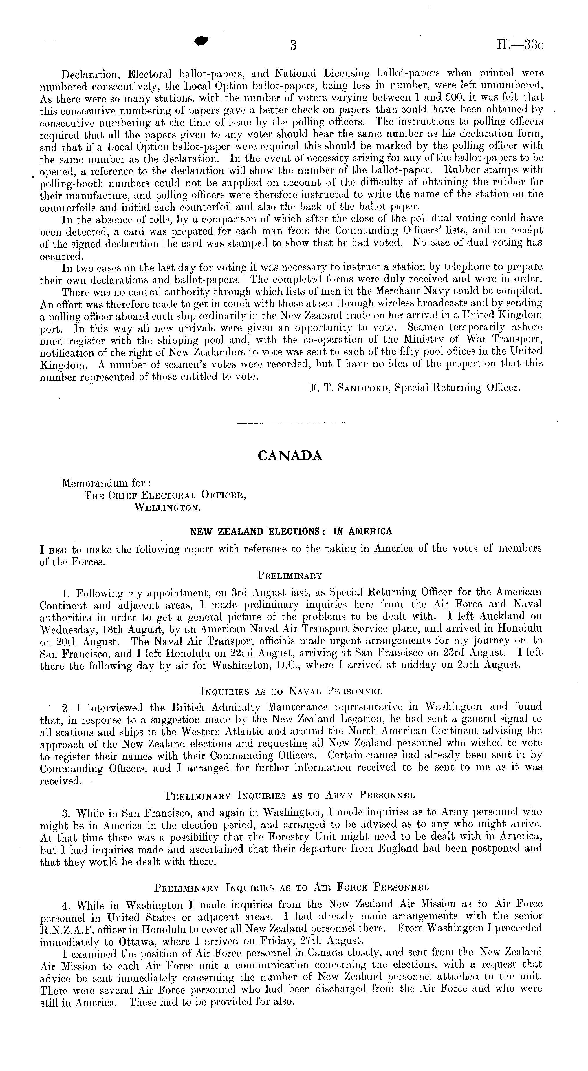 CANADA Memorandum for: The Chief Electoral Officer, Wellington. NEW ZEALAND ELECTIONS : IN AMERICA I bec to make the following report with reference to the taking in Amcrica of the votes of members of the Forces. Preliminary 1. Following my appointment, on 3rd August last, as Special Returning Officer for the American Continent and adjacent areas, 1 made preliminary inquiries here from the Air Force and Naval authorities in order to get a general picture of the problems to be dealt with. I left Auckland 011 Wednesday, 18th August, by an American Naval Air Transport Service plane, and arrived in Honolulu on 20th August. The Naval Air Transport officials made urgent arrangements for my journey 011 to San Francisco, and I left Honolulu 011 22nd August, arriving at San Francisco on 23rd August. I left there the following day by air for Washington, D.C., where I arrived at midday 011 25th August. Inquiries as to Naval Personnel 2. I interviewed the British Admiralty Maintenance representative in Washington and found that, in response to a suggestion made by the New Zealand Legation, he had sent a general signal to all stations and ships in the Western Atlantic and around the North American Continent advising the approach of the New Zealand elections and requesting all New Zealand personnel who wished to vote to register their names with their Commanding Officers. Certain names had already been sent in by Commanding Officers, and I arranged for further information received to be sent to me as it was received. Preliminary Inquiries as to Army Personnel 3. While in San Francisco, and again in Washington, I made inquiries as to Army personnel who might be in America in the election period, and arranged to be advised as to any who might arrive. At that time there was a possibility that the Forestry Unit might need to bo dealt with in America, but I had inquiries made and ascertained that their departure from England had been postponed and that they would be dealt with there. Preliminary Inquiries as to Air Force Personnel 4. While in Washington I made inquiries from the New Zealand Air Mission as to Air Force personnel in United States or adjacent areas. I had already made arrangements with the senior R.N.Z. A.F. officer in Honolulu to cover all New Zealand personnel there. From Washington I proceeded immediately to Ottawa, where I arrived on Friday, 27th August. I examined the position of Air Force personnel in Canada closely, and sent from the New Zealand Air Mission to each Air Force unit a communication concerning the elections, with a request that advice be sent immediately concerning the number of New Zealand personnel attached to the unit. There were several Air Force personnel who had been discharged from the Air Force and who were still in America. These had to be provided for also.